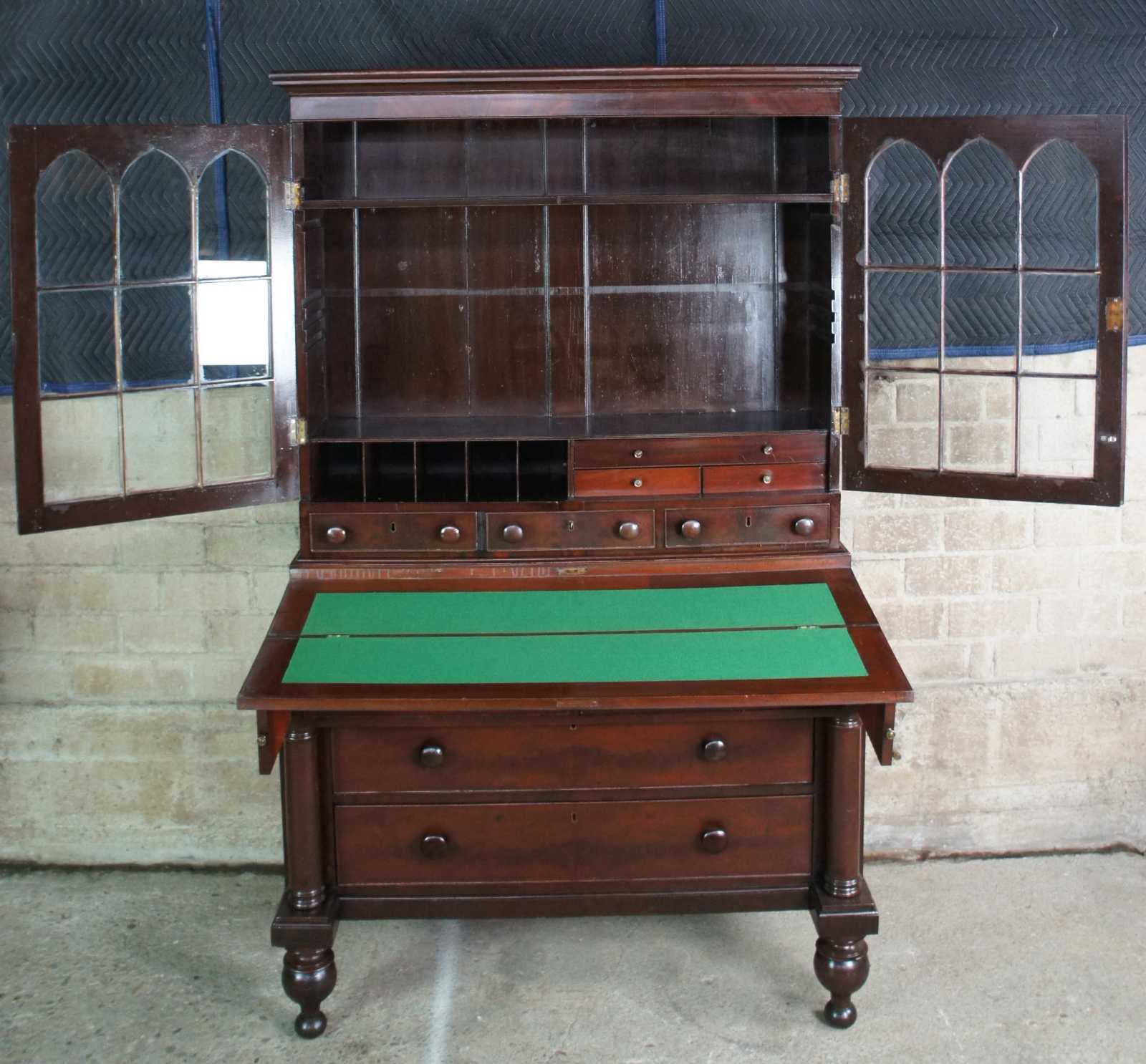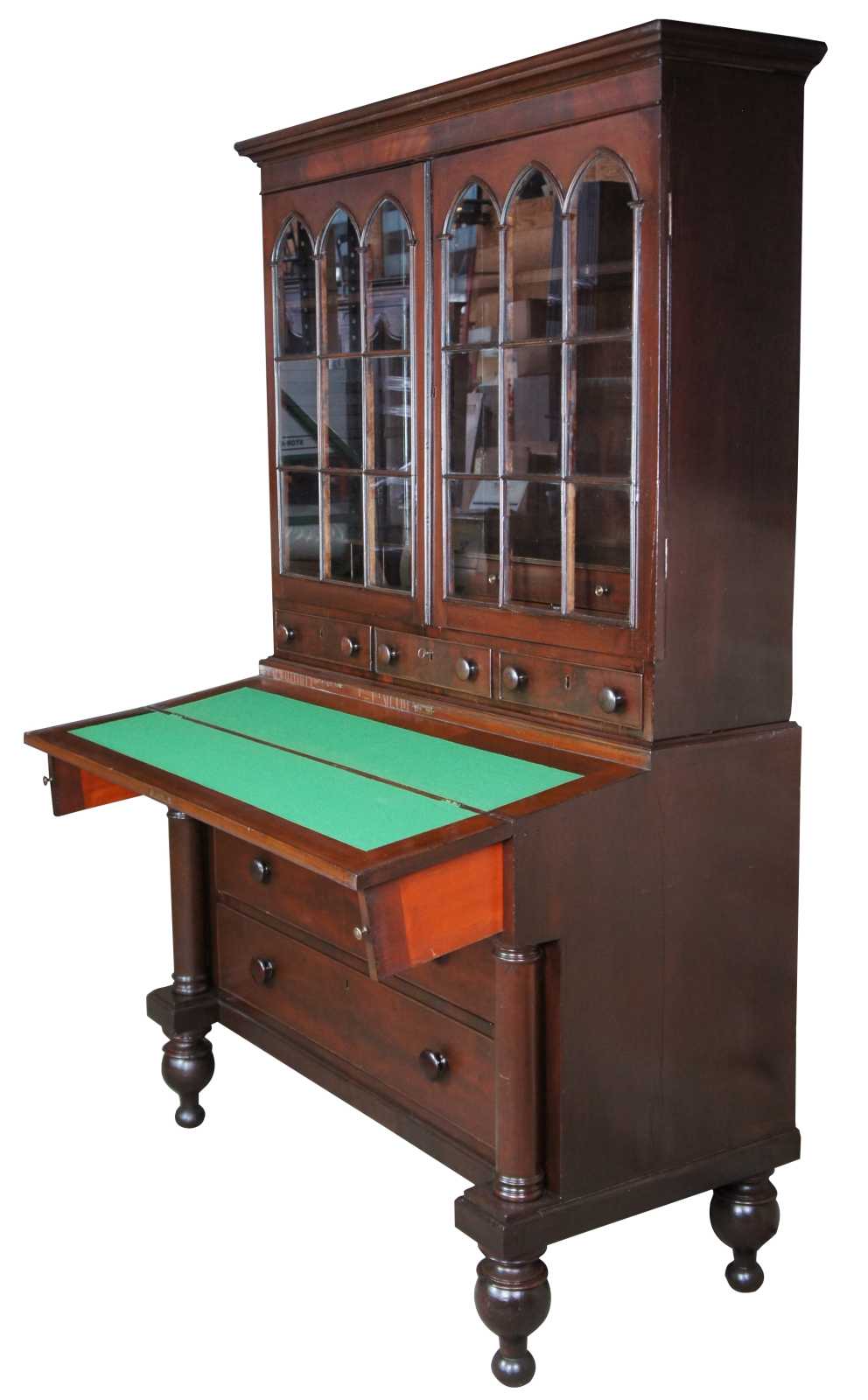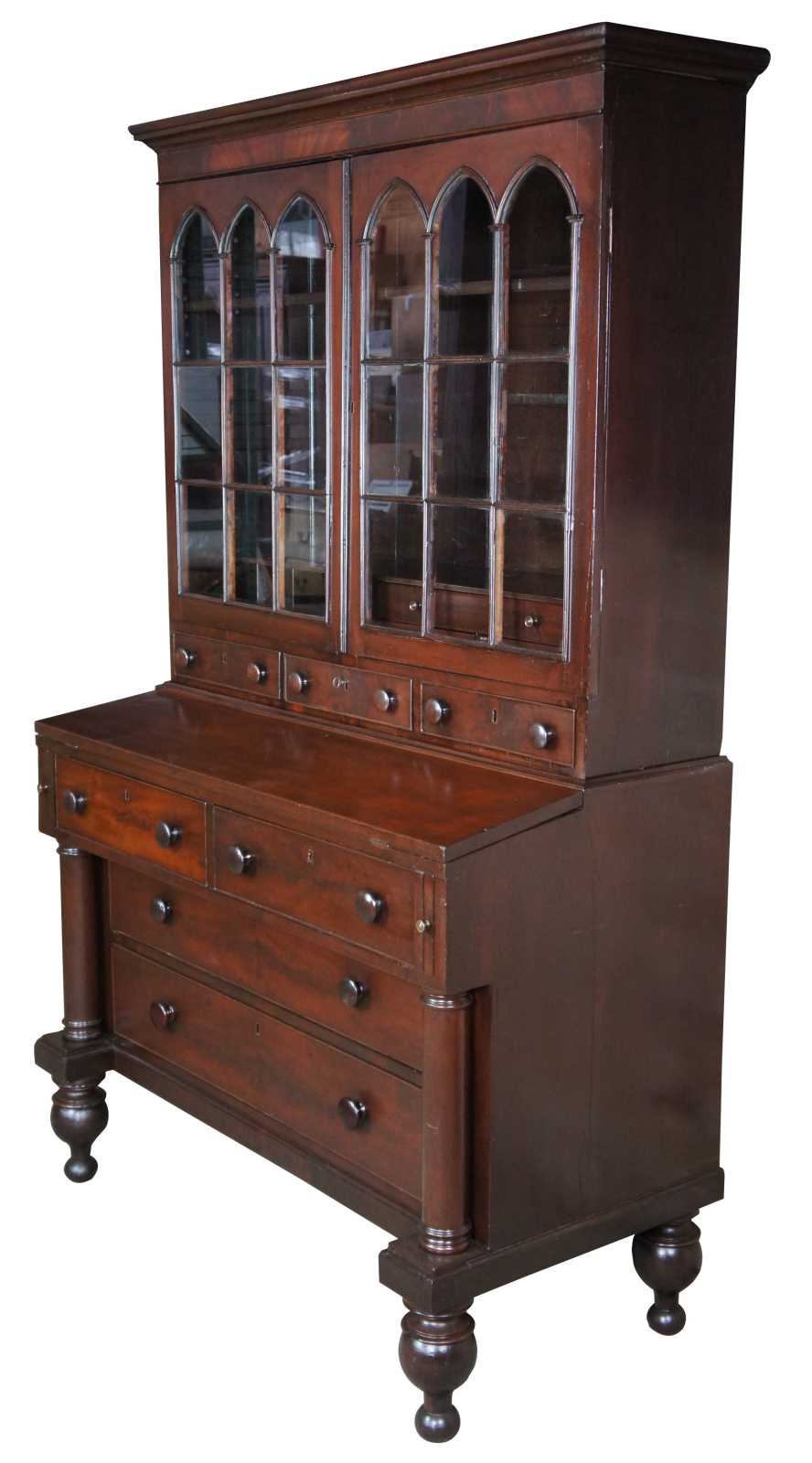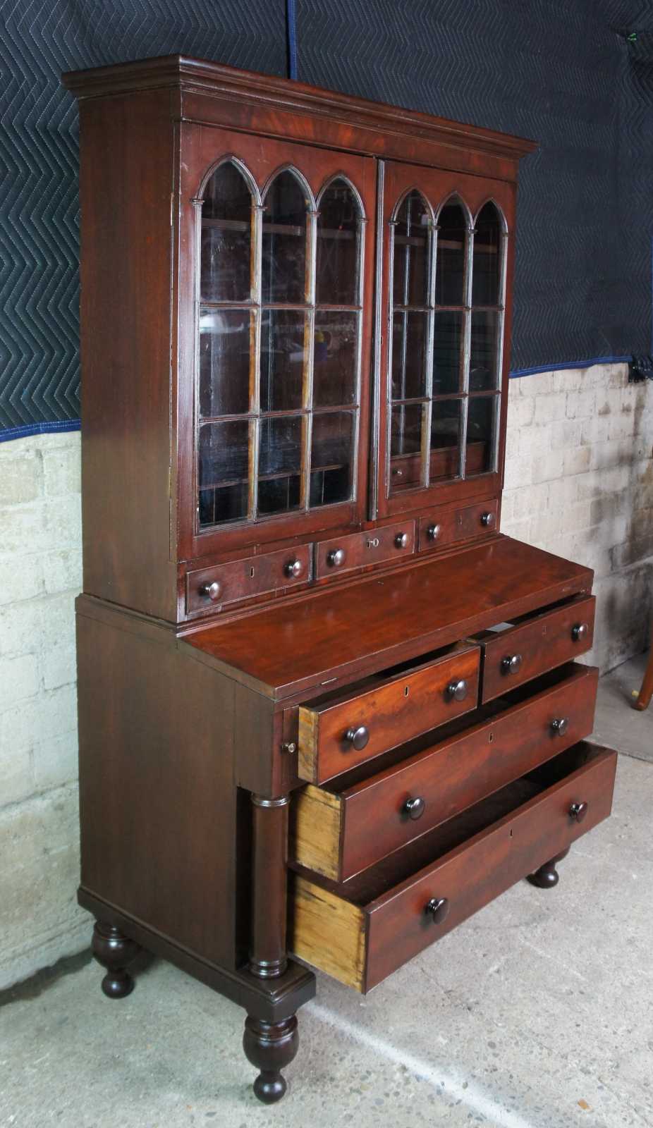 A fine and impressive Federal Period Mahogany secretary and bookcase, circa 1830s. The bookcase features an eighteen pane Gothic arched cabinet front that opens to two shelves, cubbies and drawers. A flip top opens to a baize writing surface. Base includes two over two drawers with crotch mahogany veneer front centered between full columns and robust turned Turnip feet.