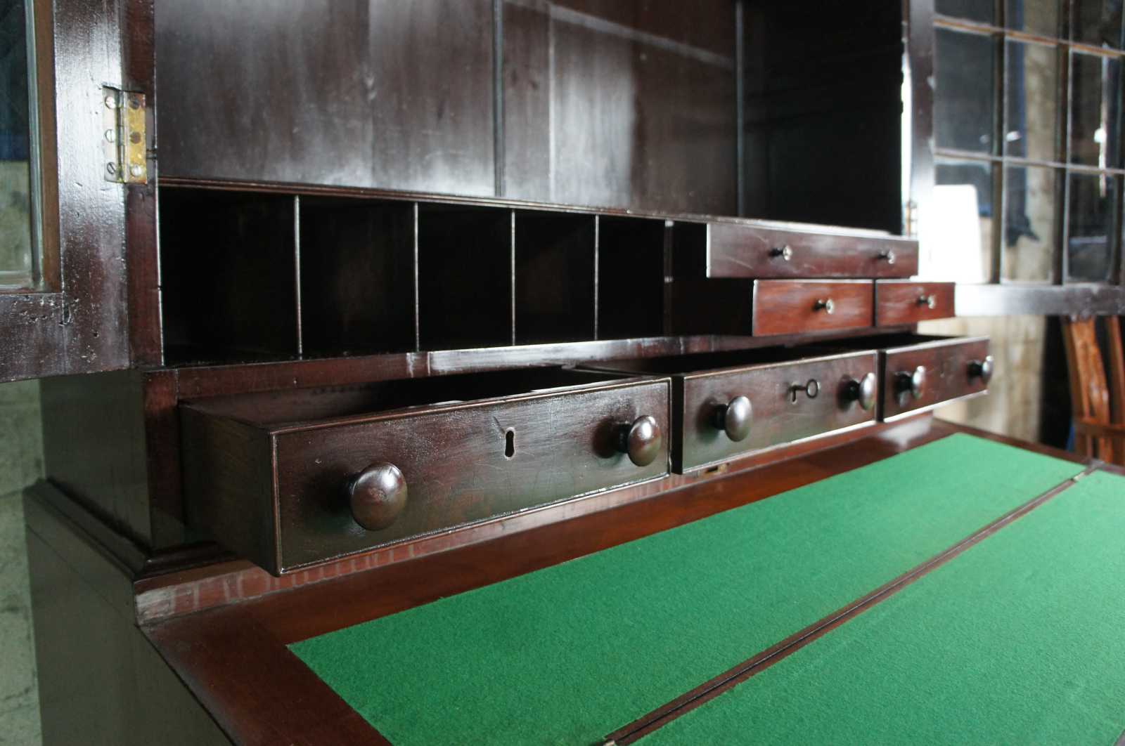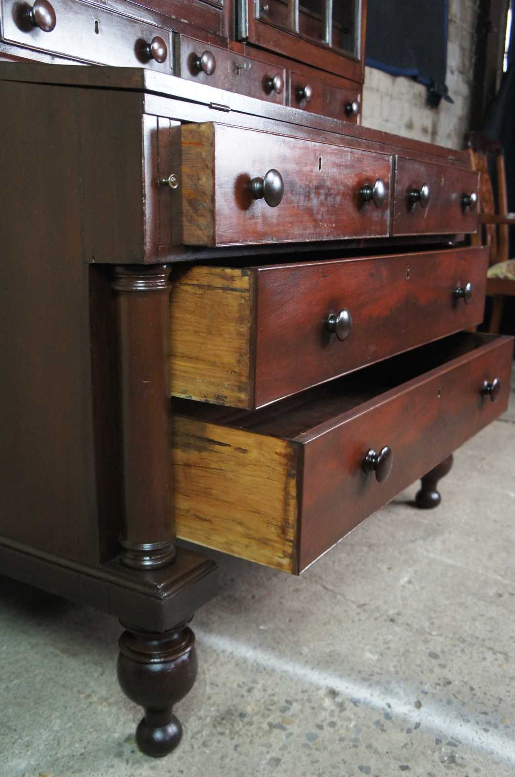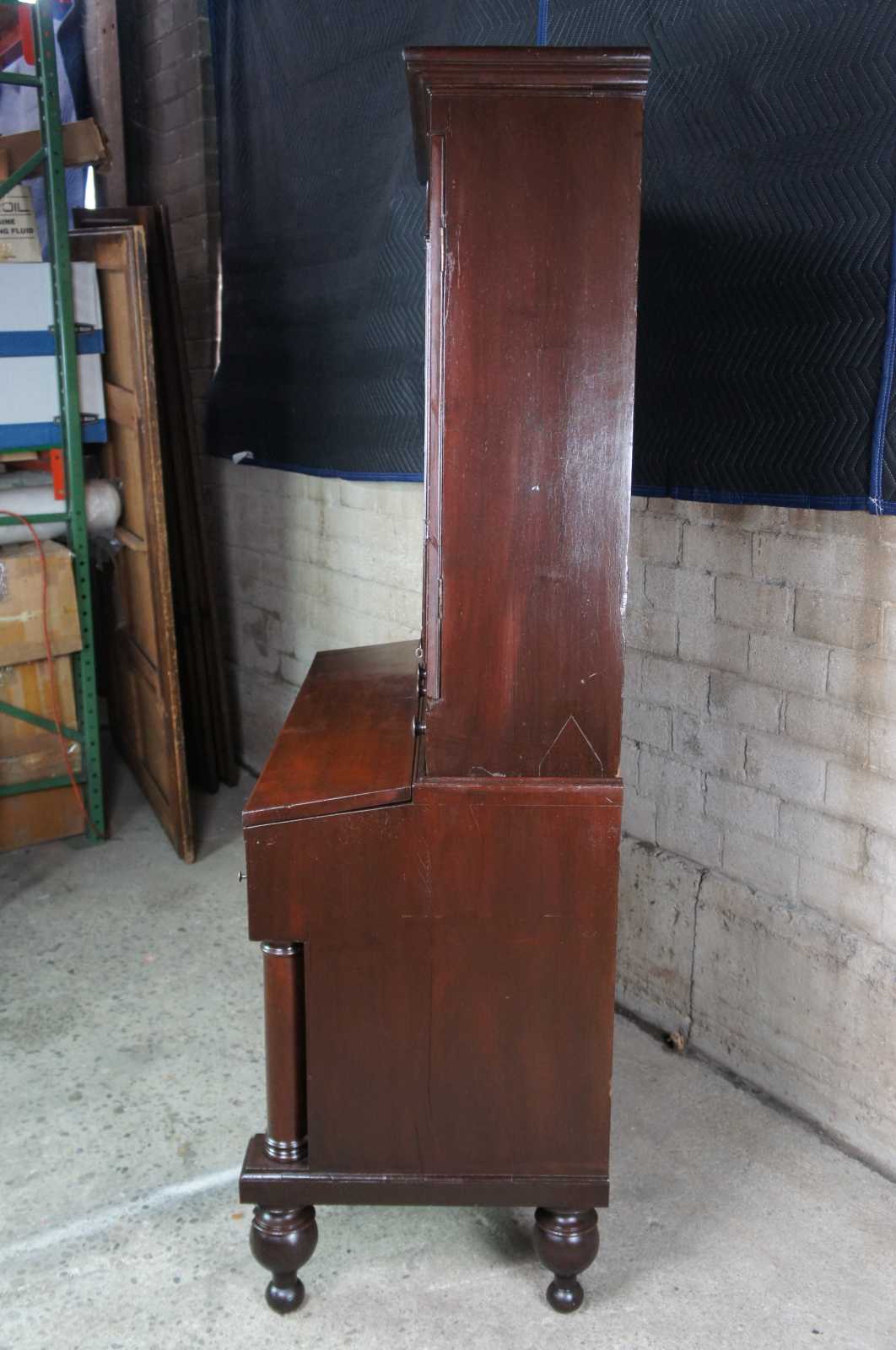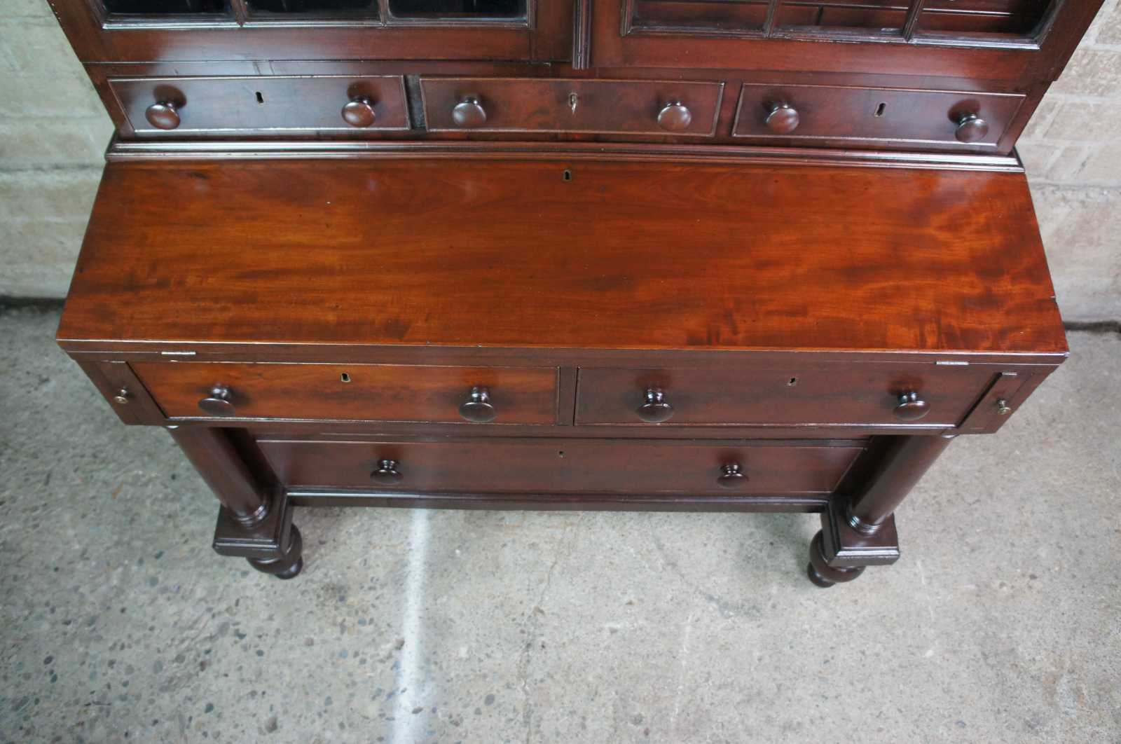 A fine and impressive Federal Period Mahogany secretary and bookcase, circa 1830s. The bookcase features an eighteen pane Gothic arched cabinet front that opens to two shelves, cubbies and drawers. A flip top opens to a baize writing surface. Base includes two over two drawers with crotch mahogany veneer front centered between full columns and robust turned Turnip feet.