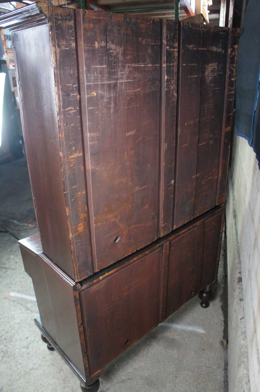 Good antique condition, wear and distressing commensurate with age and use, past veneer repair along right side of bookcase as well as some splitting. Missing one interior shelf.