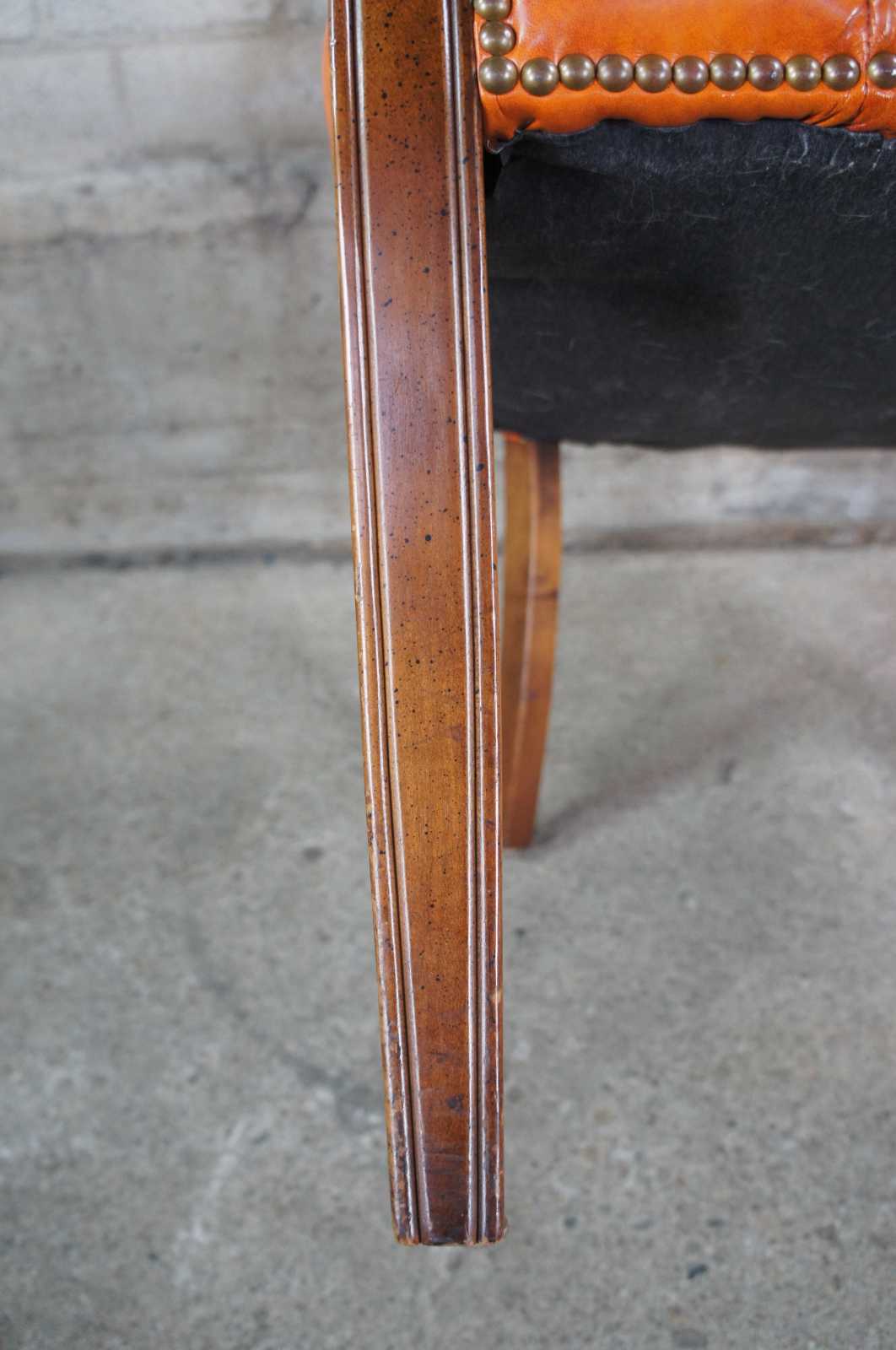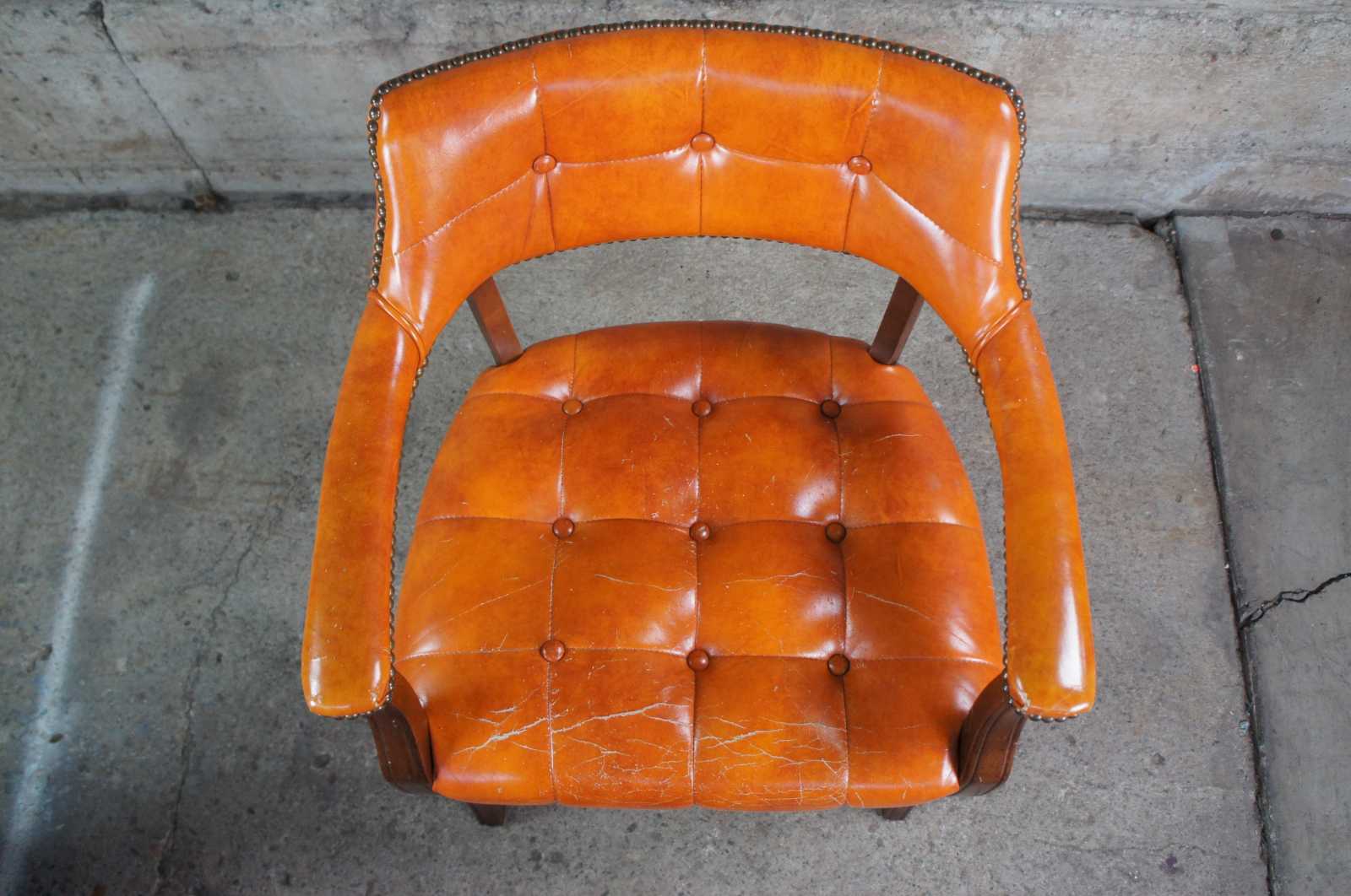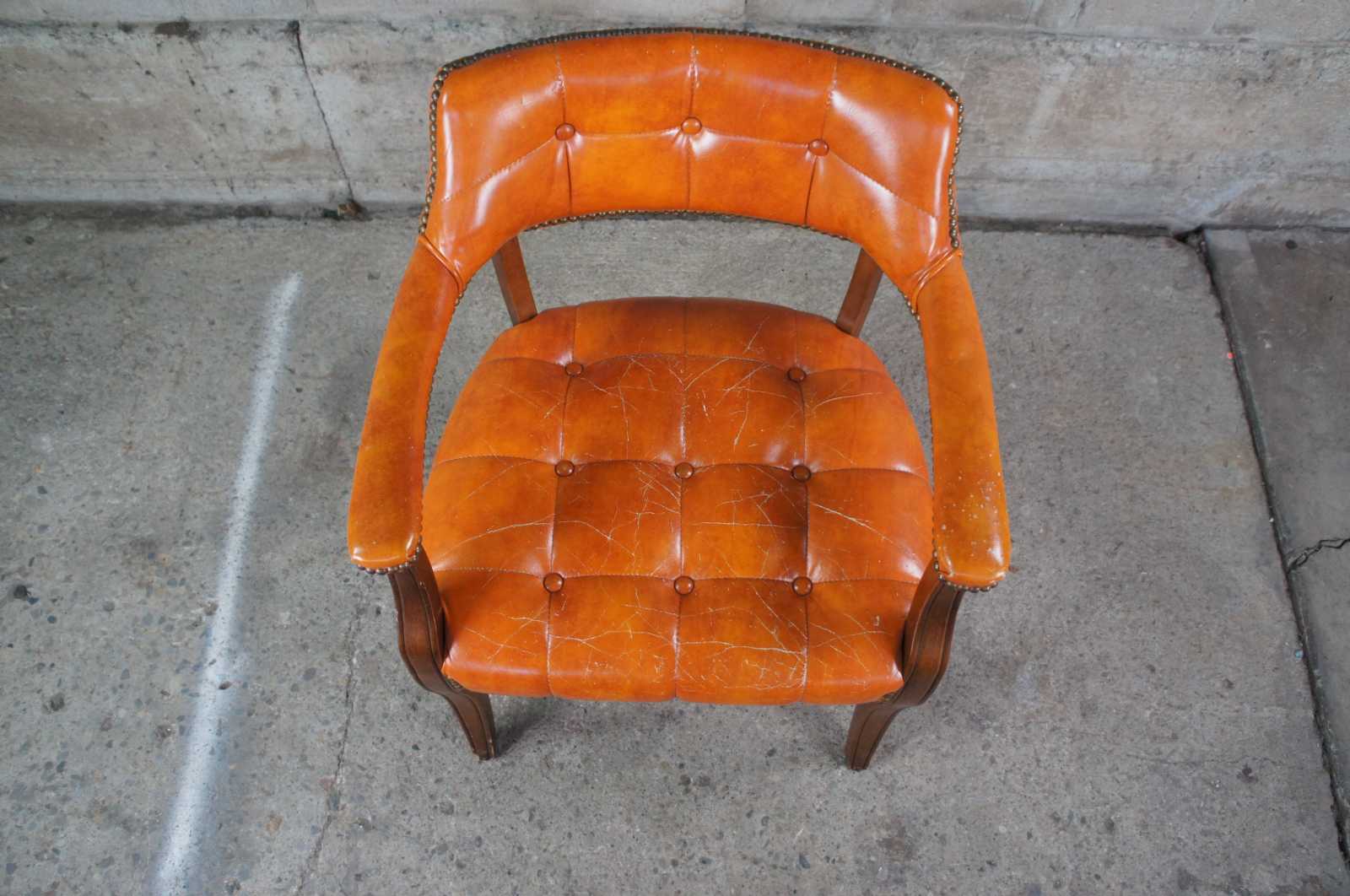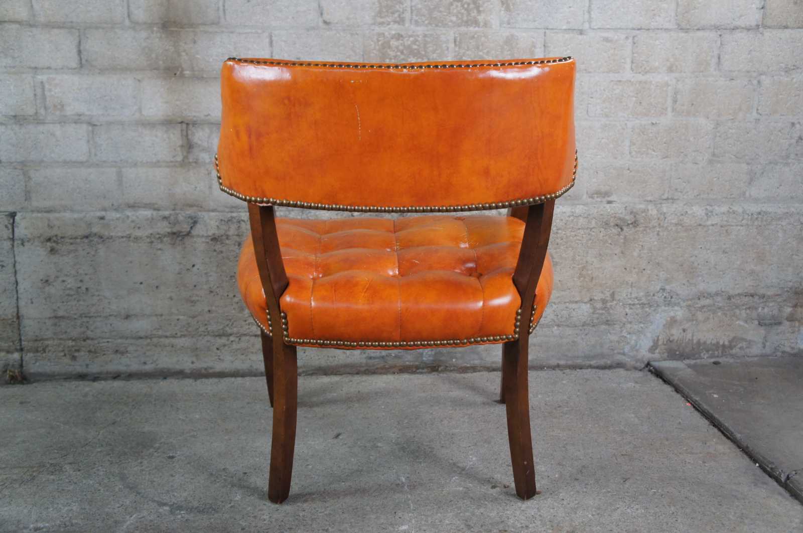 Pair of mid century orange vinyl tufted barrek back chairs. Features a a naturally distressed frame and brass nailhead trim.