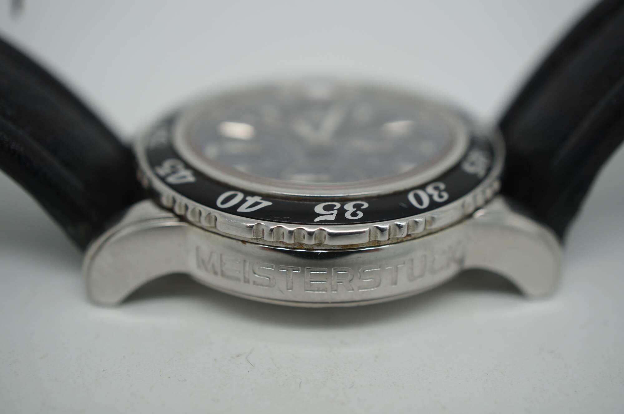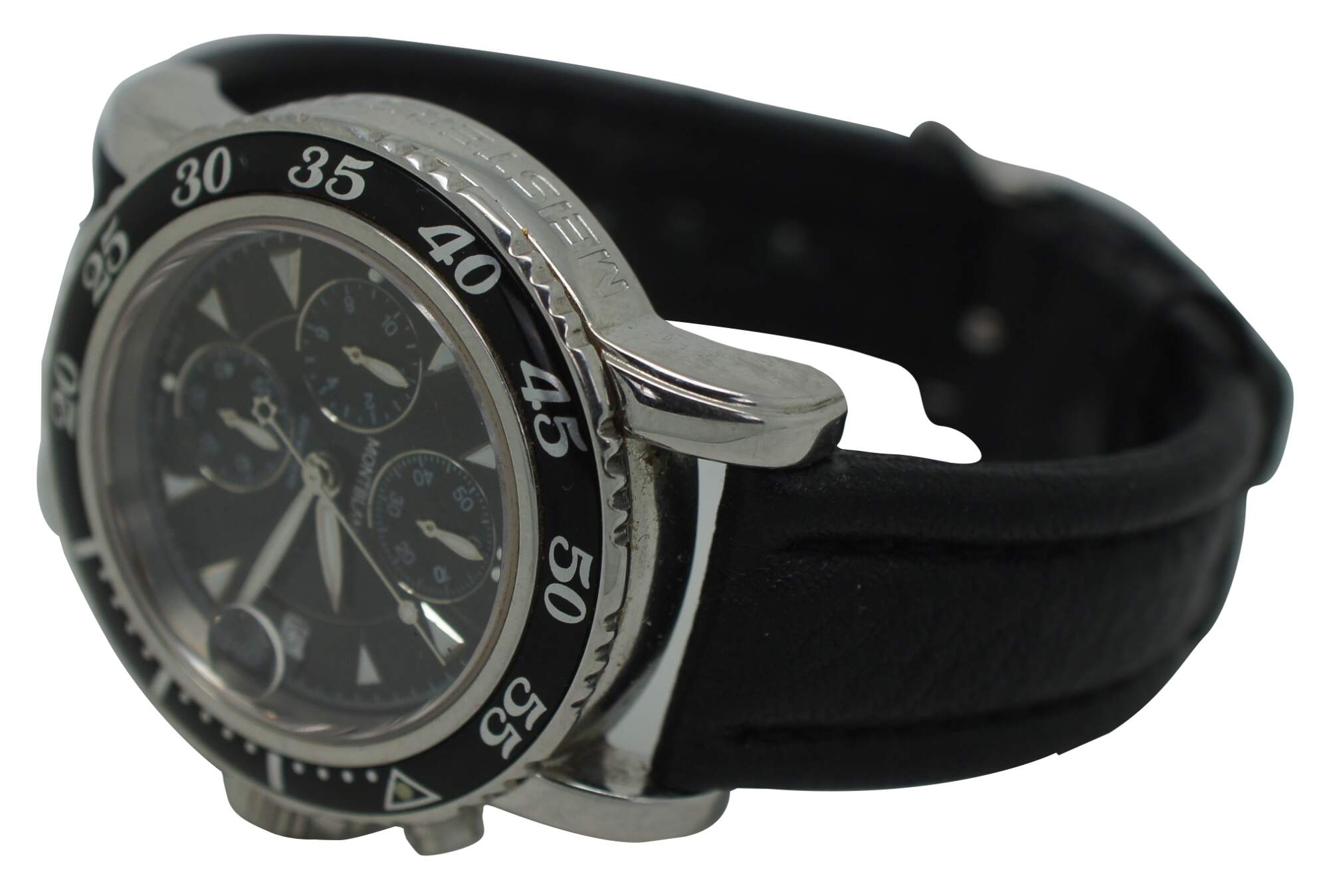 Montblanc Meisterstuck Sport chronograph wristwatch model 7037-PL78948. Features a stainless steel case trimmed in black, water resistant 200 meters. Genuine black leather band and an unused spare. 41mm Circa 2011