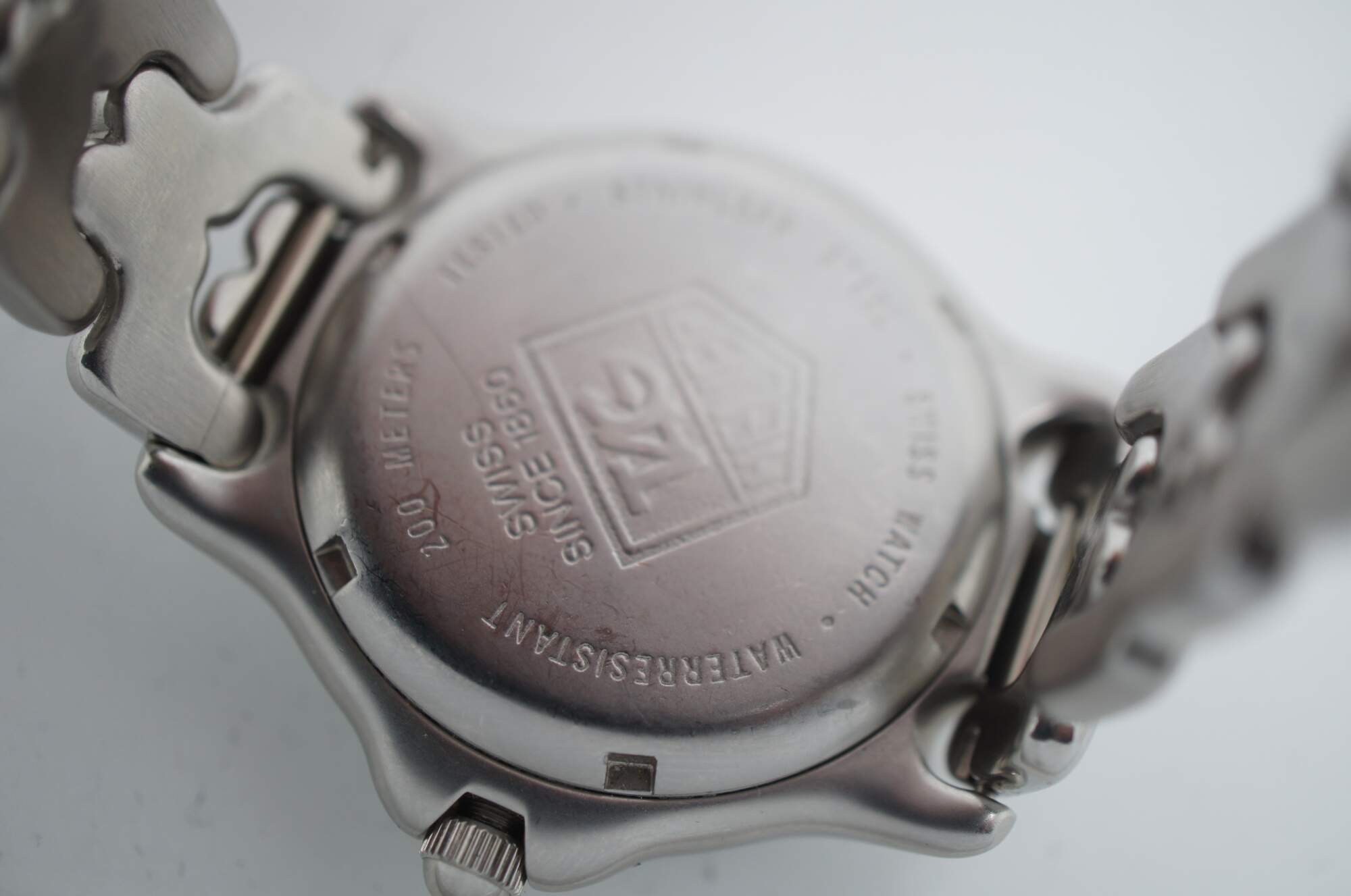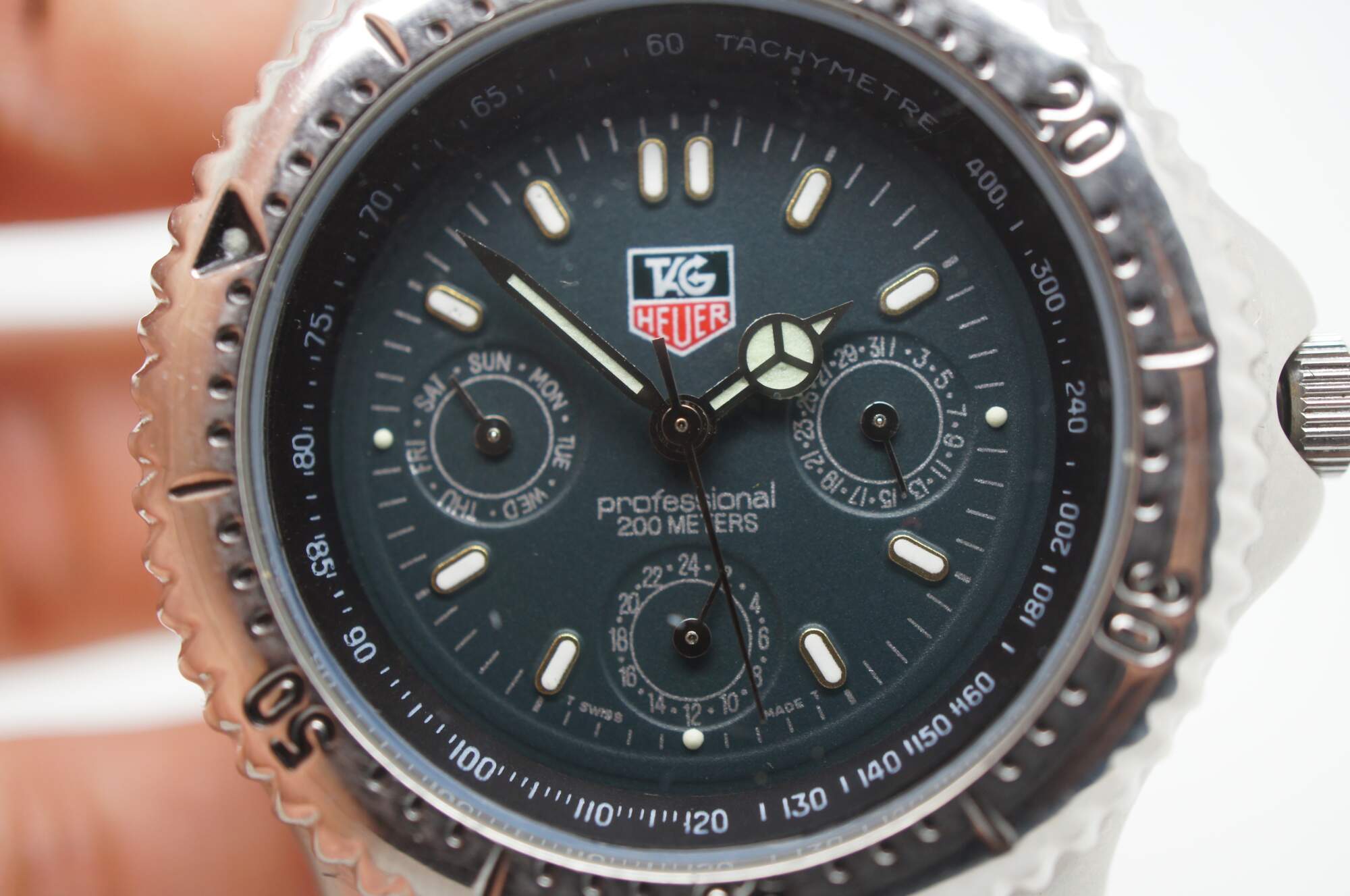 Tag Heuer chronograph wristwatch with tachymetre, stainless steel case and band, water resistant to 200 meters.
