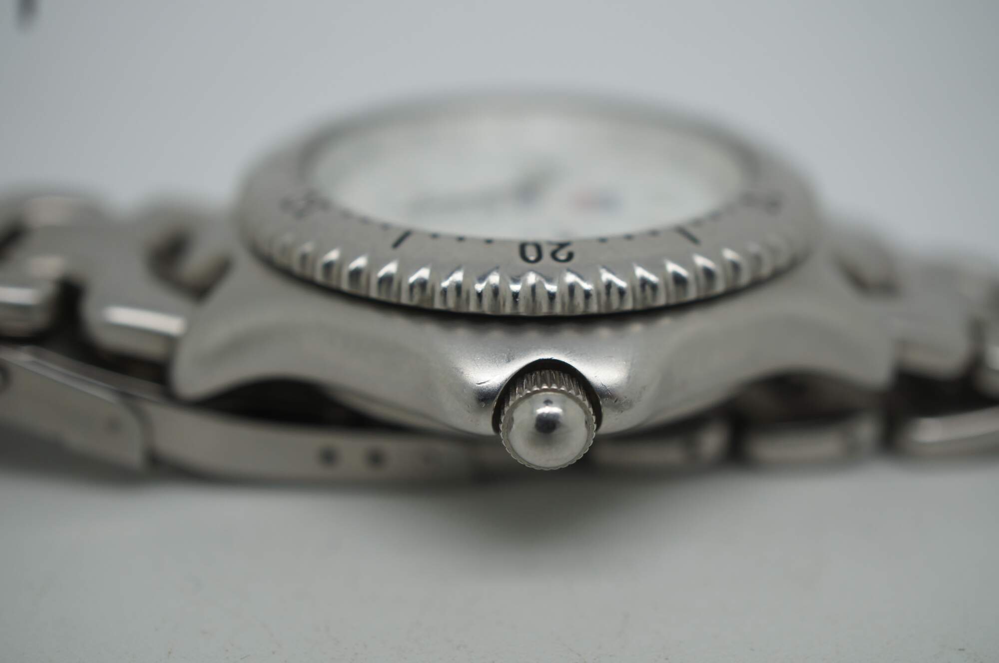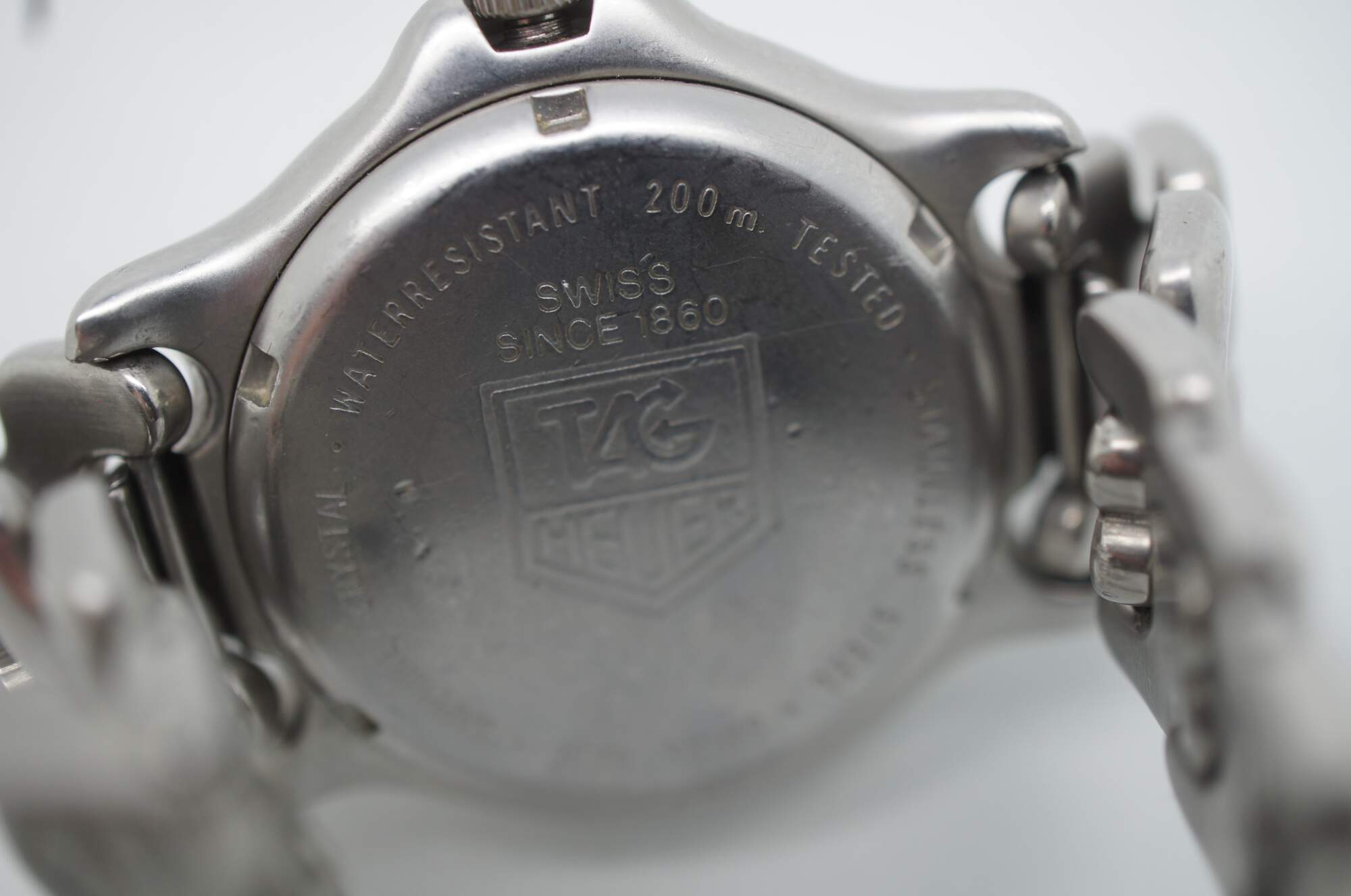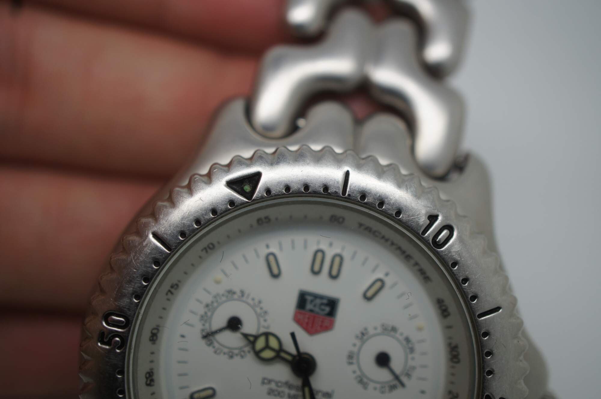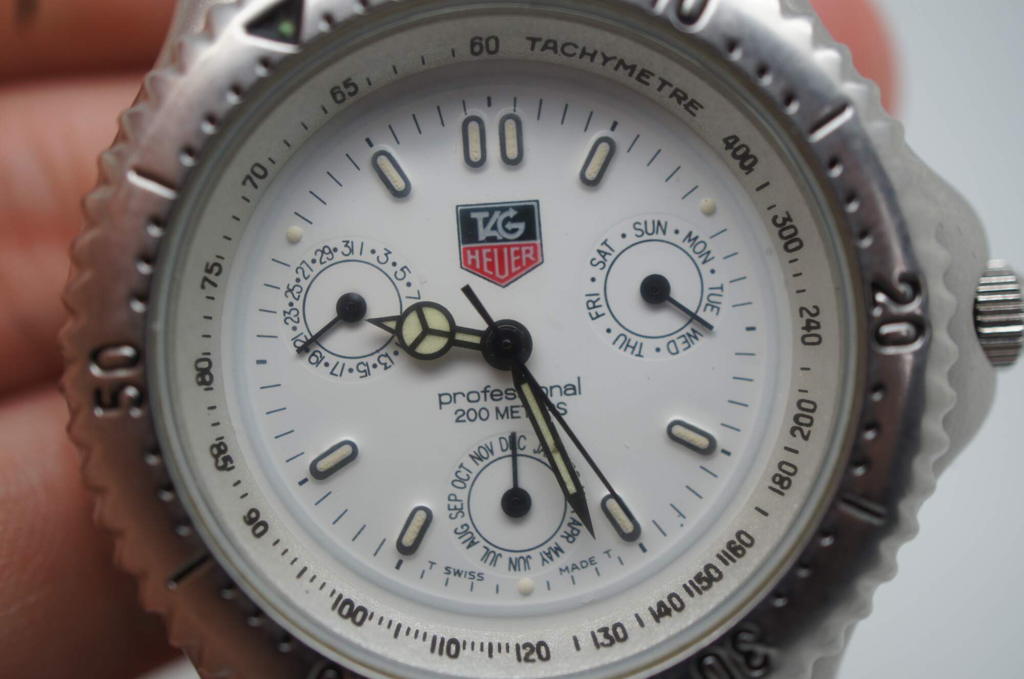 Tag Heuer Professional watch with stainless steel case and band, perpetual calendar on the face, and tachymetre, water resistant 200 meters.