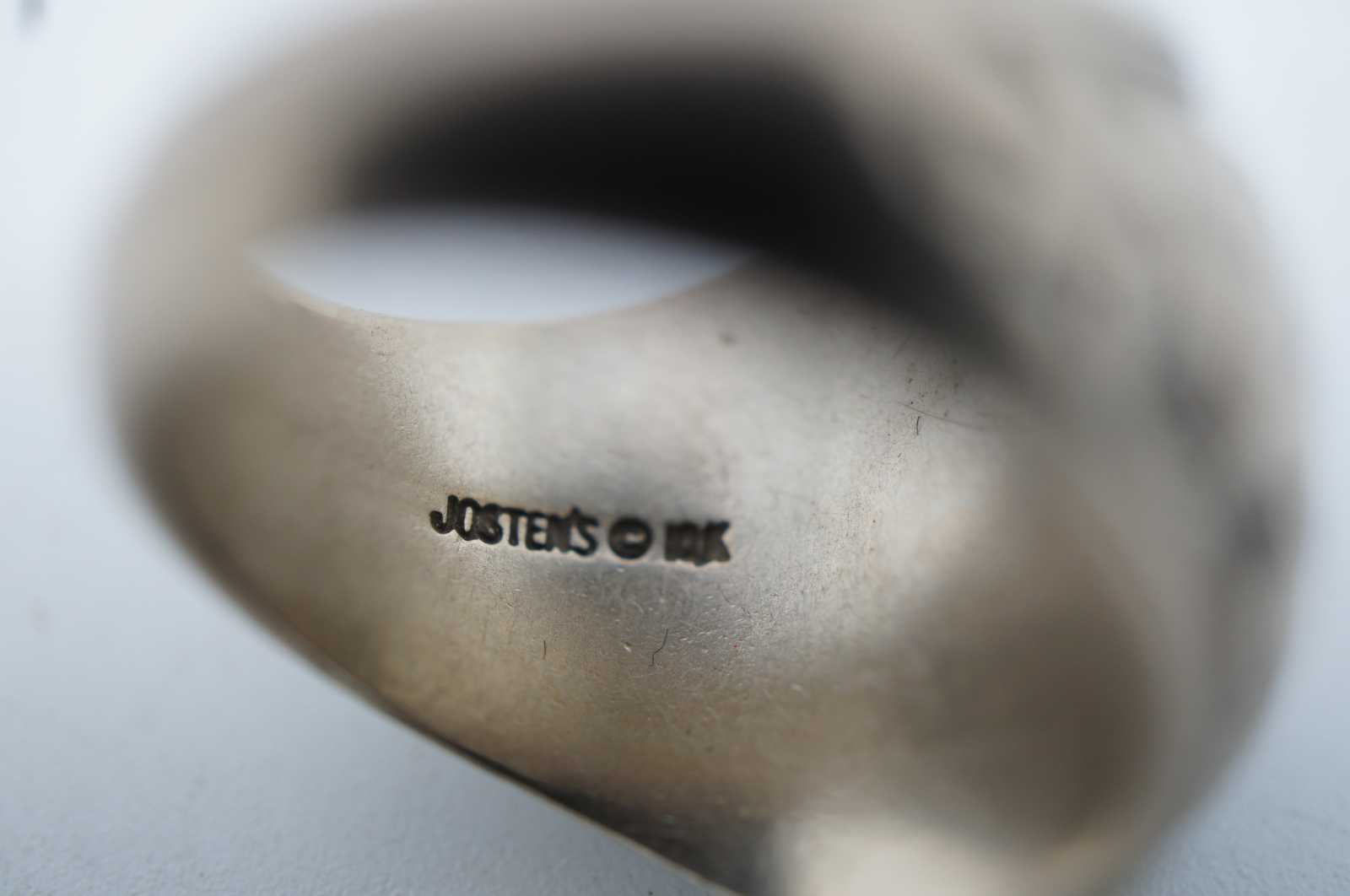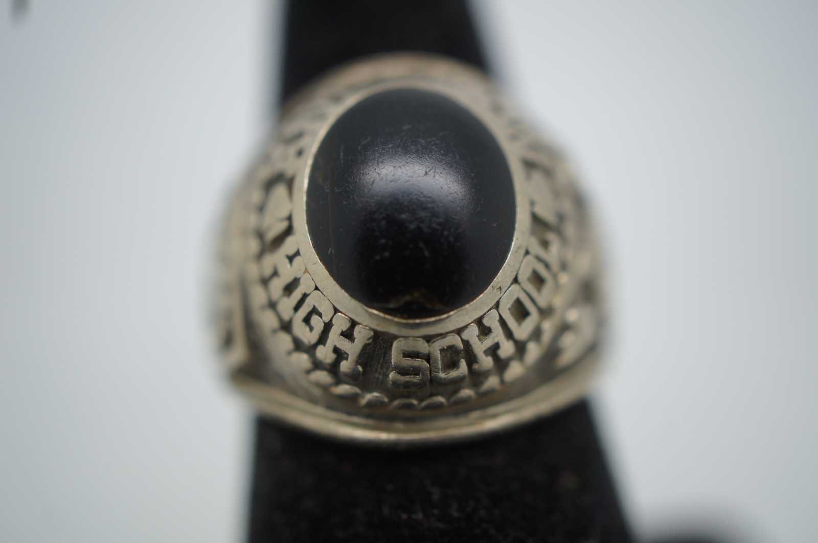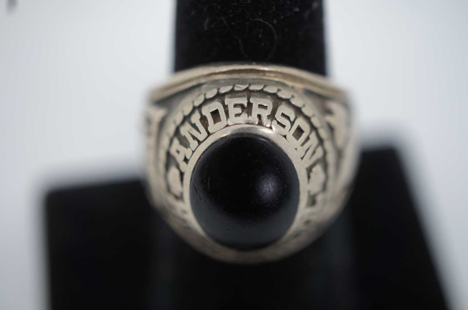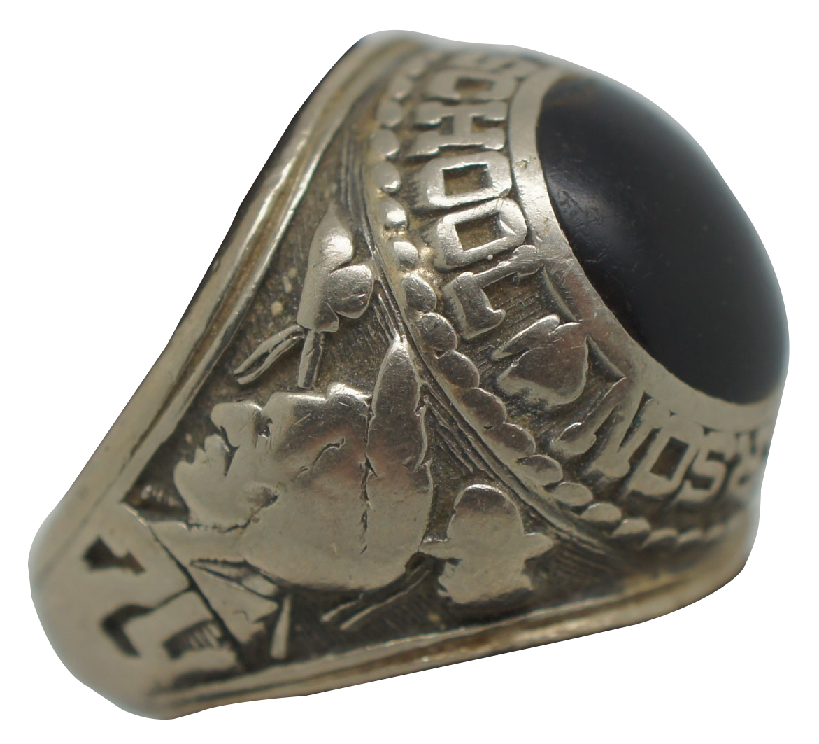 Vintage Class of 1974 class ring from Anderson High School of Cincinnati, Ohio. Set with a rounded stone of matte black onyx, emblazoned on one side with the head of a Native American in front of a pair of crossed weapons and on the other with a shield containing a book and quill circled by a gear. Interior engraved with the initials “REH.” Produced by Jostens Jewelry.