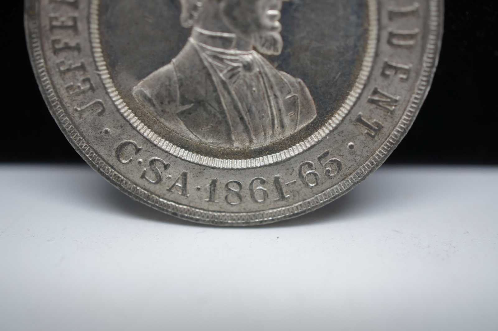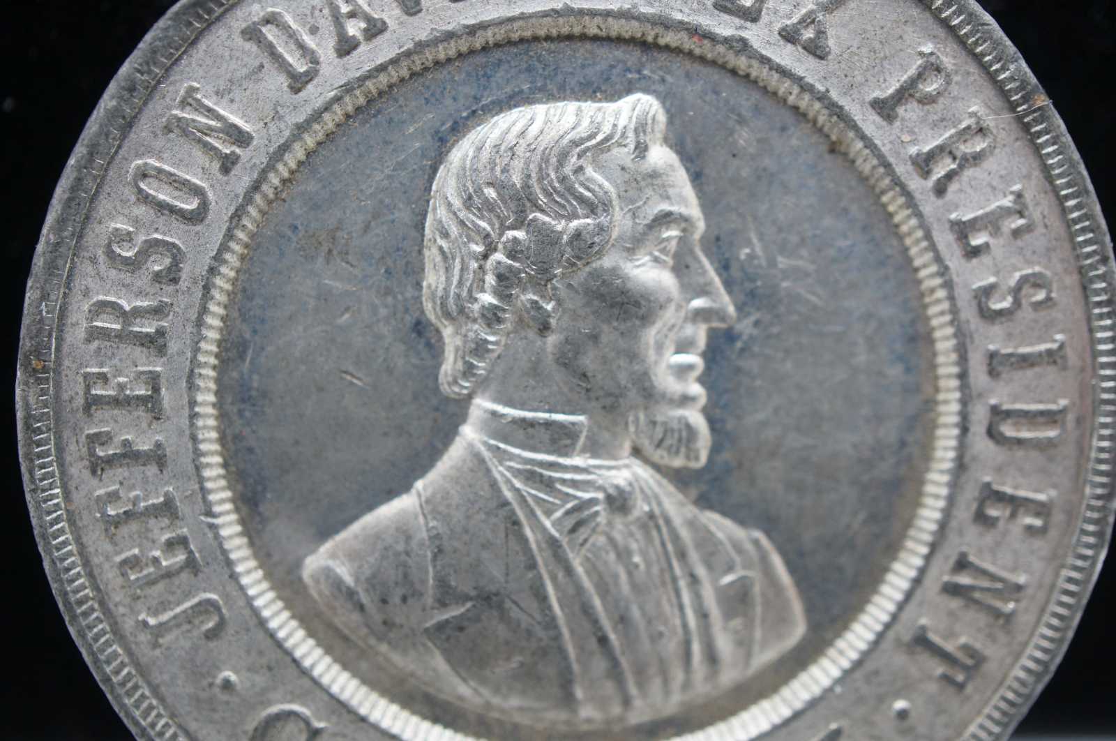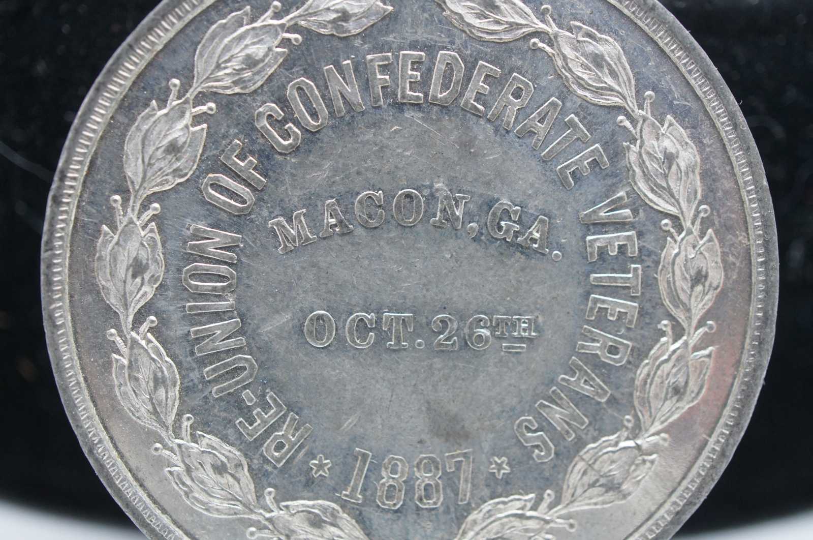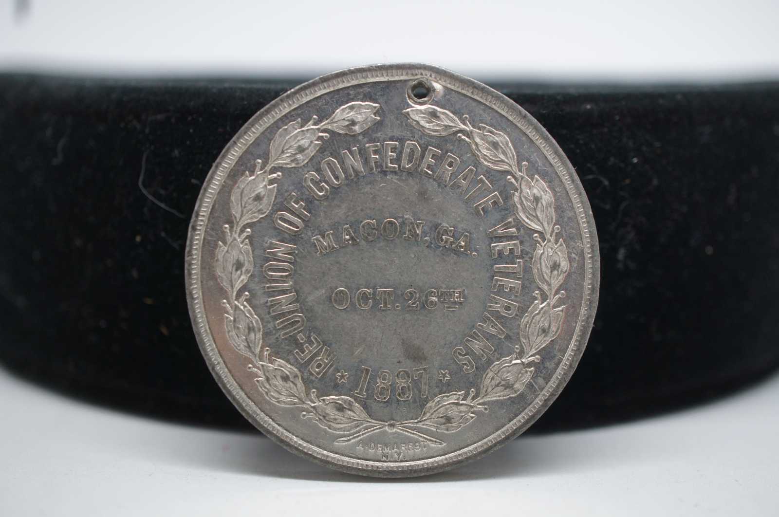Antique Confederate veterans re-union token. Obverse – portrait of Jefferson Davis, facing right; the words “Jefferson Davis Ex President CSA 1861-65” around the outside edge; hole centered at the top for use as a pendant on a necklace. Reverse: Leafy wreath around the outside edge; the words “Macon, GA. Oct 26th” in the center, “Re-Union of Confederate Veterans 1887” encircling the center; “A. Demarest N.Y.” makers mark centered at the bottom edge.