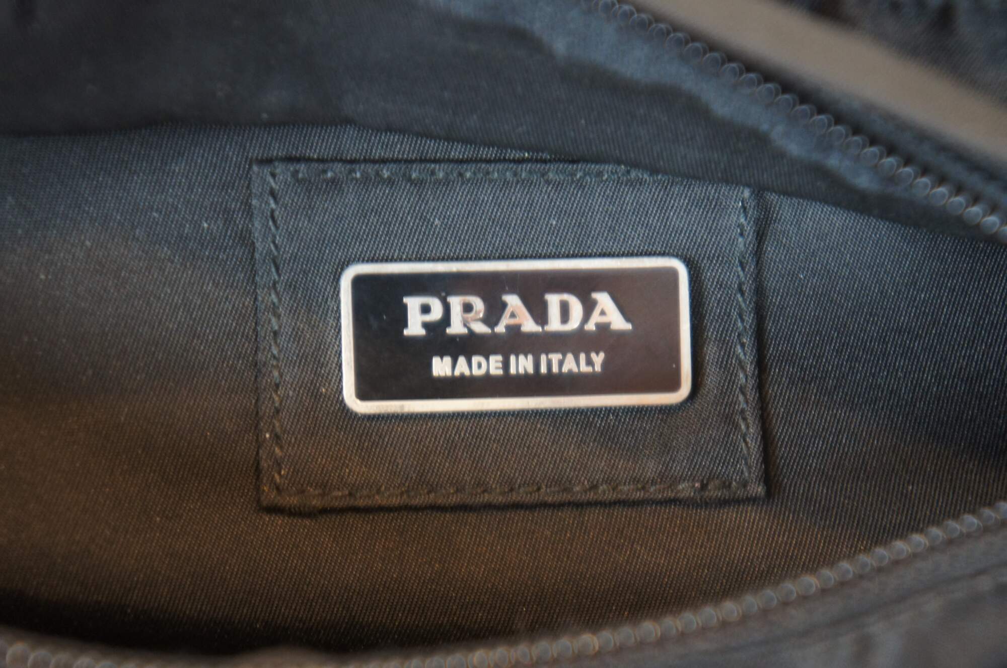 Prada black nylon wait pouch or fanny pack with two zippered compartments and silver tone buckle.