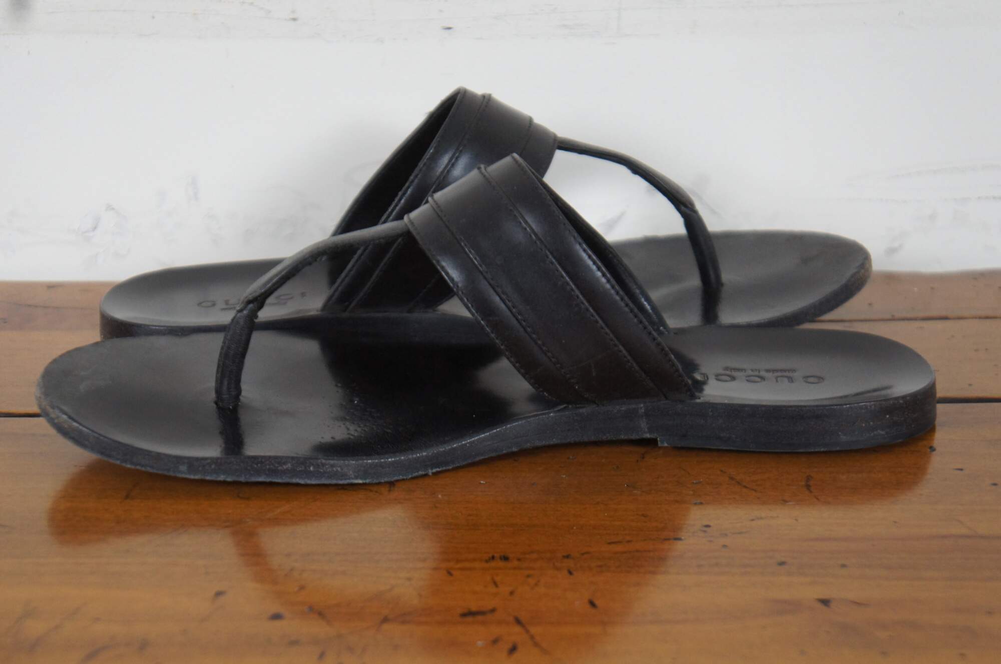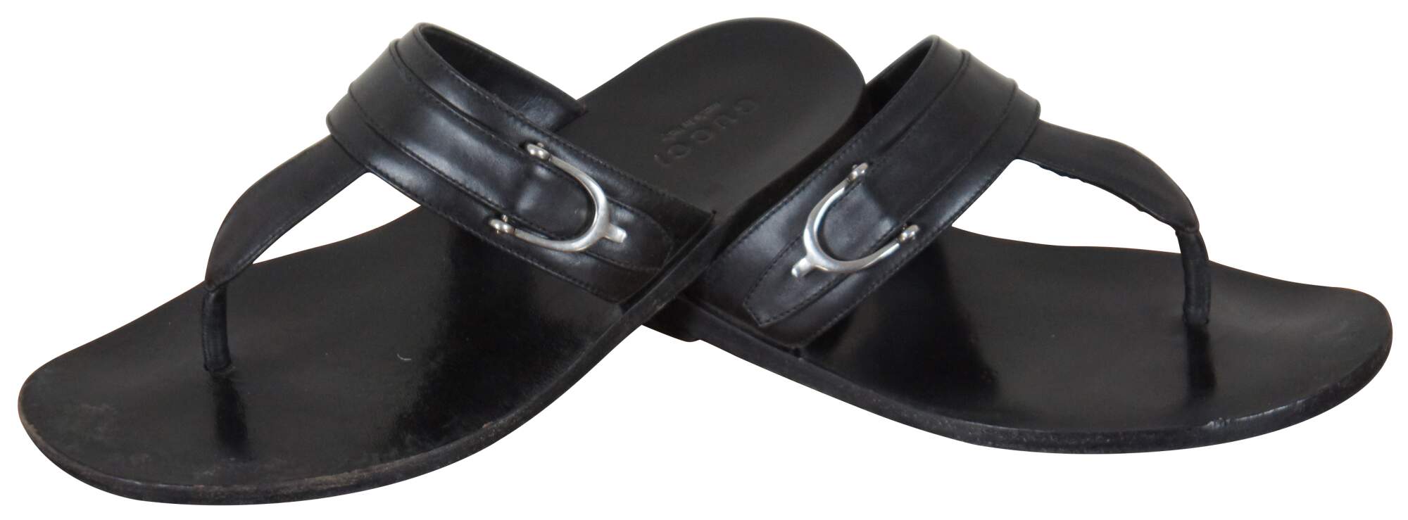 Gucci black leather flip flop style sandals with horse bit accent. Includes original box and dust bags.