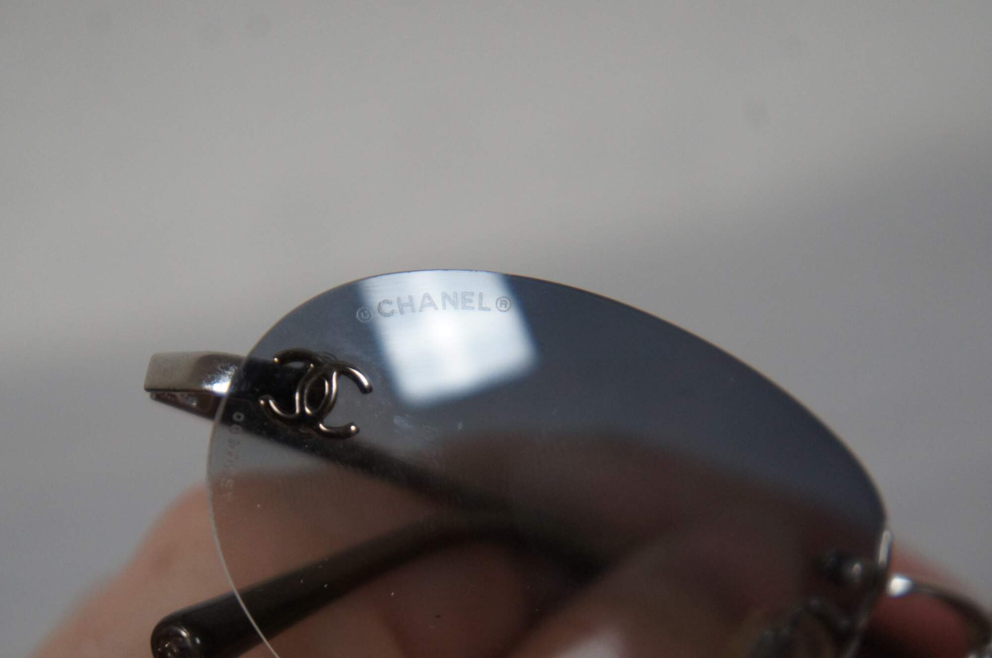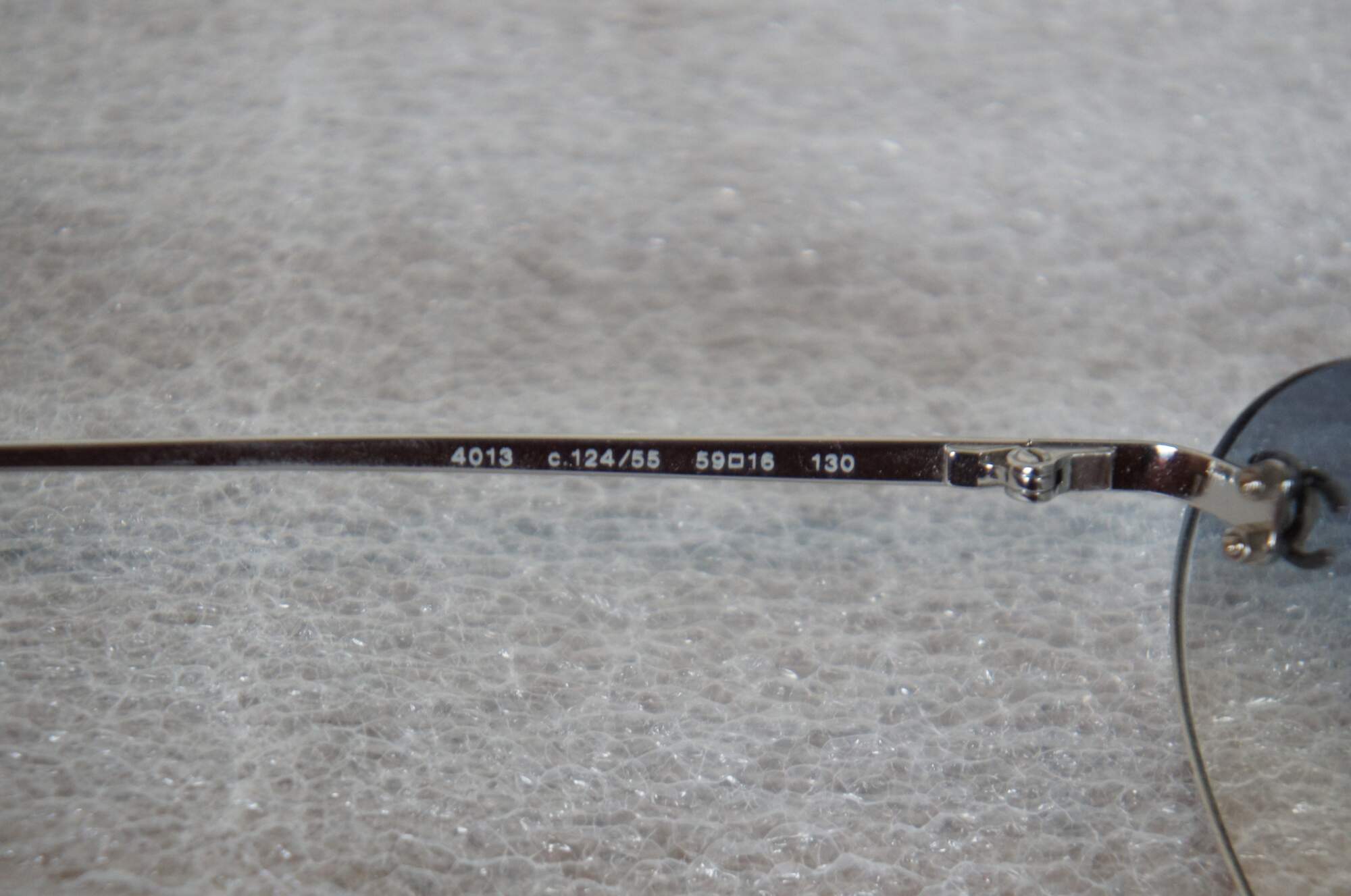 Chanel 4013 women’s blue rimless sunglasses; c. 124/55 59[]16 130; serial number L7226400. Includes lens cleaning cloth and hard shell case.