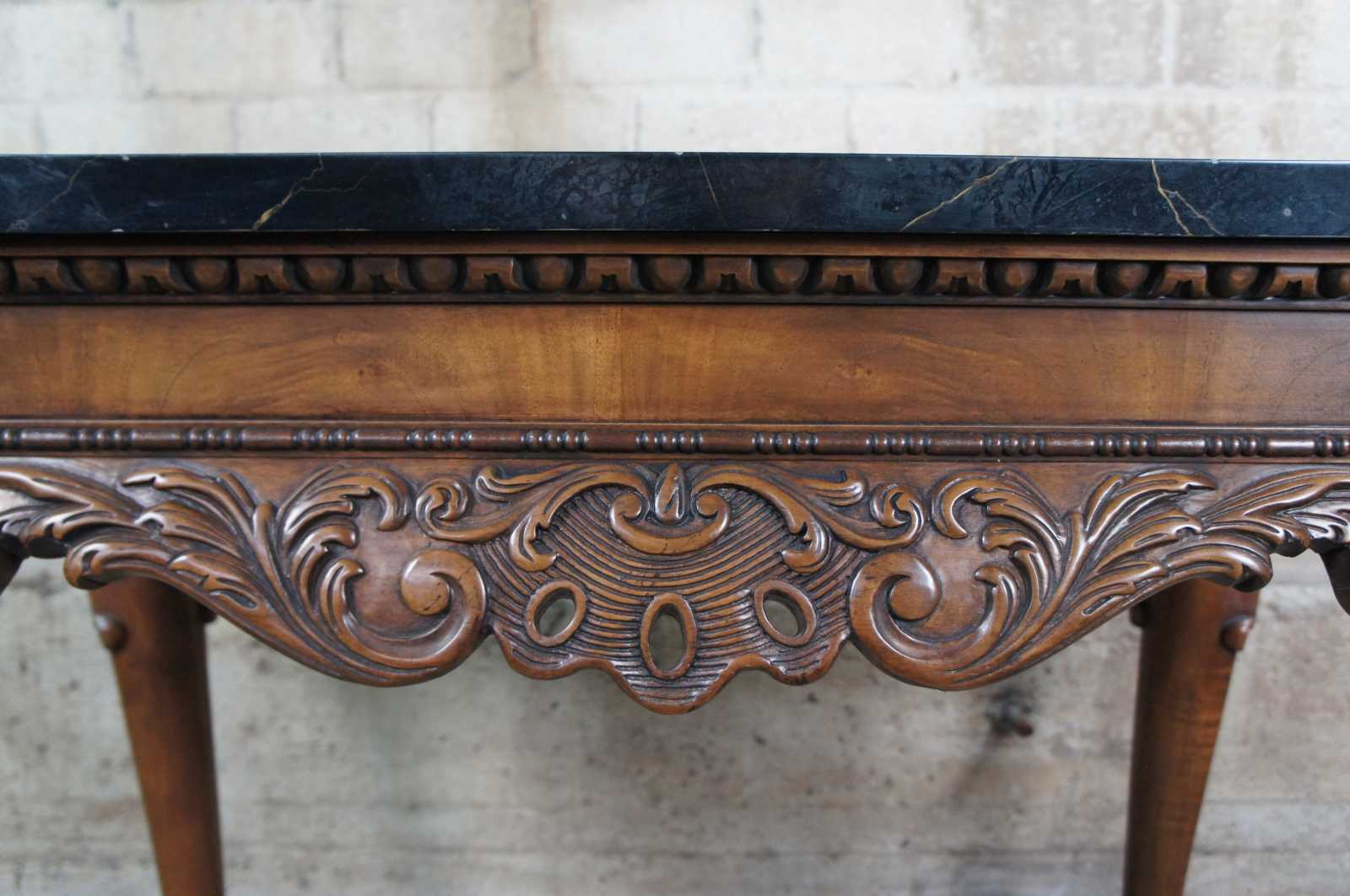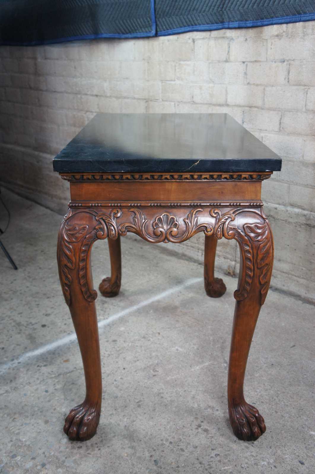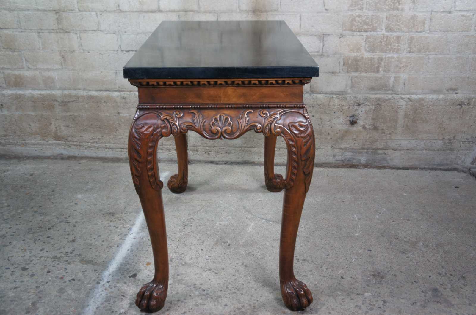 An elegant Baker Stately Homes drybar or server, circa last quarter 20th century. A rectangular form made from mahogany with dark green faux marble top. Features a beaded frieze with gadrooning over an acanthus carved and scrolled apron. Supported by long cabriole legs leading to hairy paw feet. Inspired by English, Georgian and Chippendale designs.