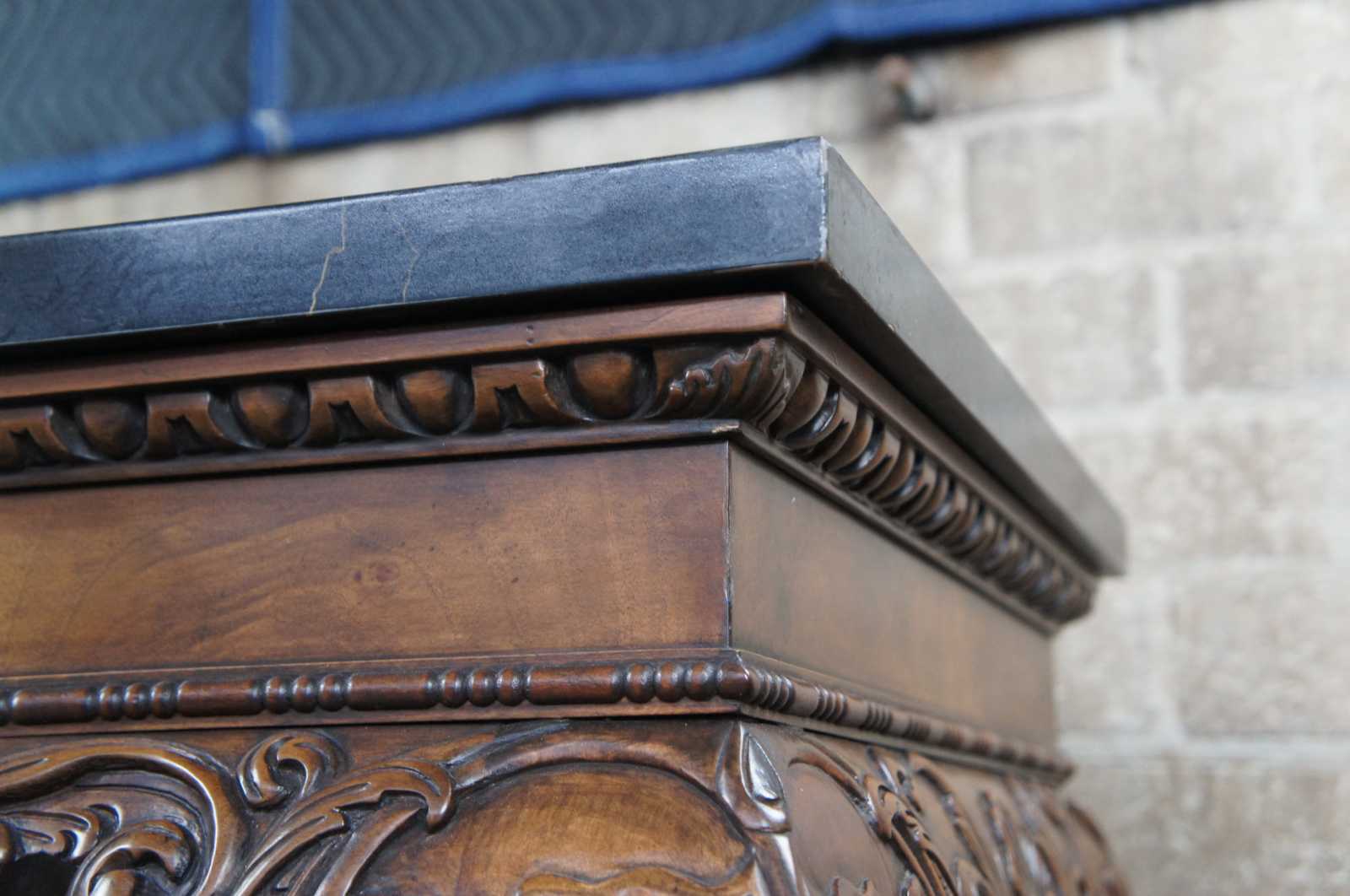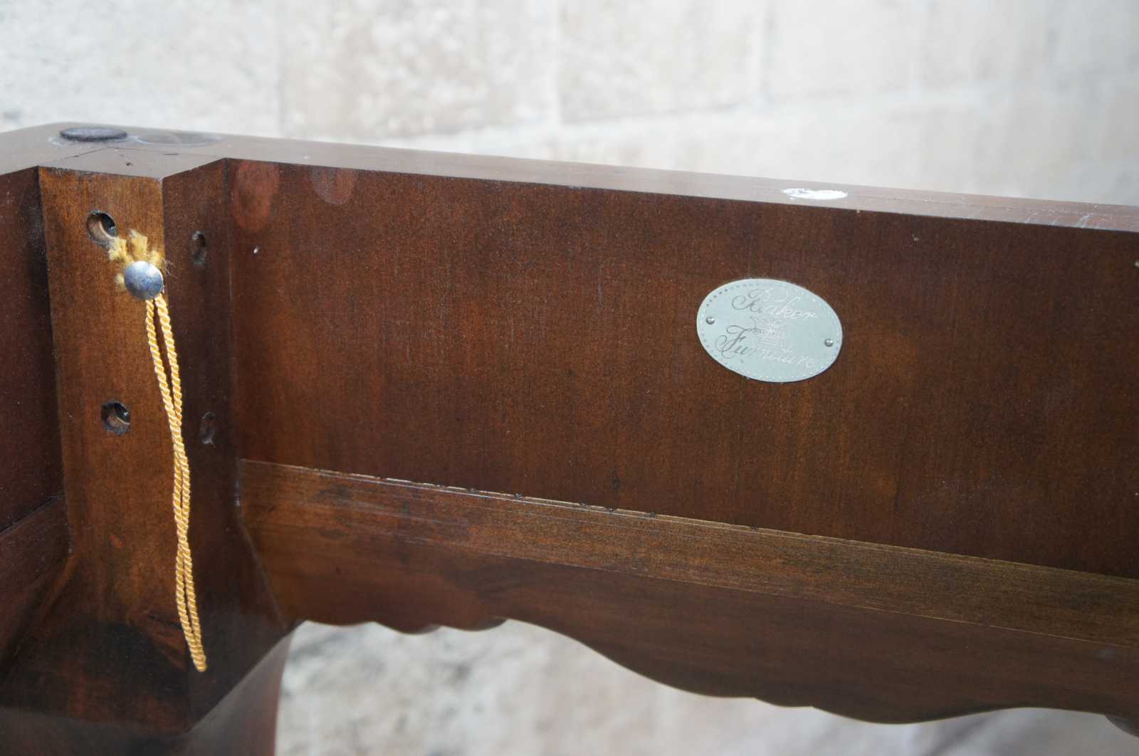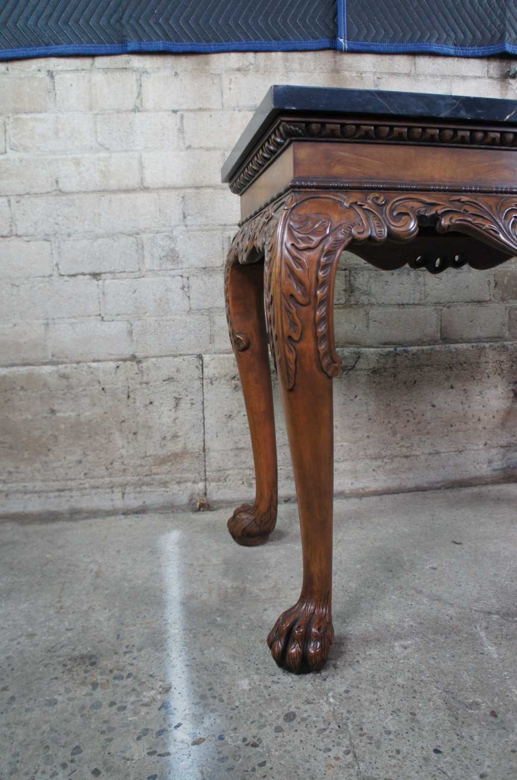 An elegant Baker Stately Homes drybar or server, circa last quarter 20th century. A rectangular form made from mahogany with dark green faux marble top. Features a beaded frieze with gadrooning over an acanthus carved and scrolled apron. Supported by long cabriole legs leading to hairy paw feet. Inspired by English, Georgian and Chippendale designs.