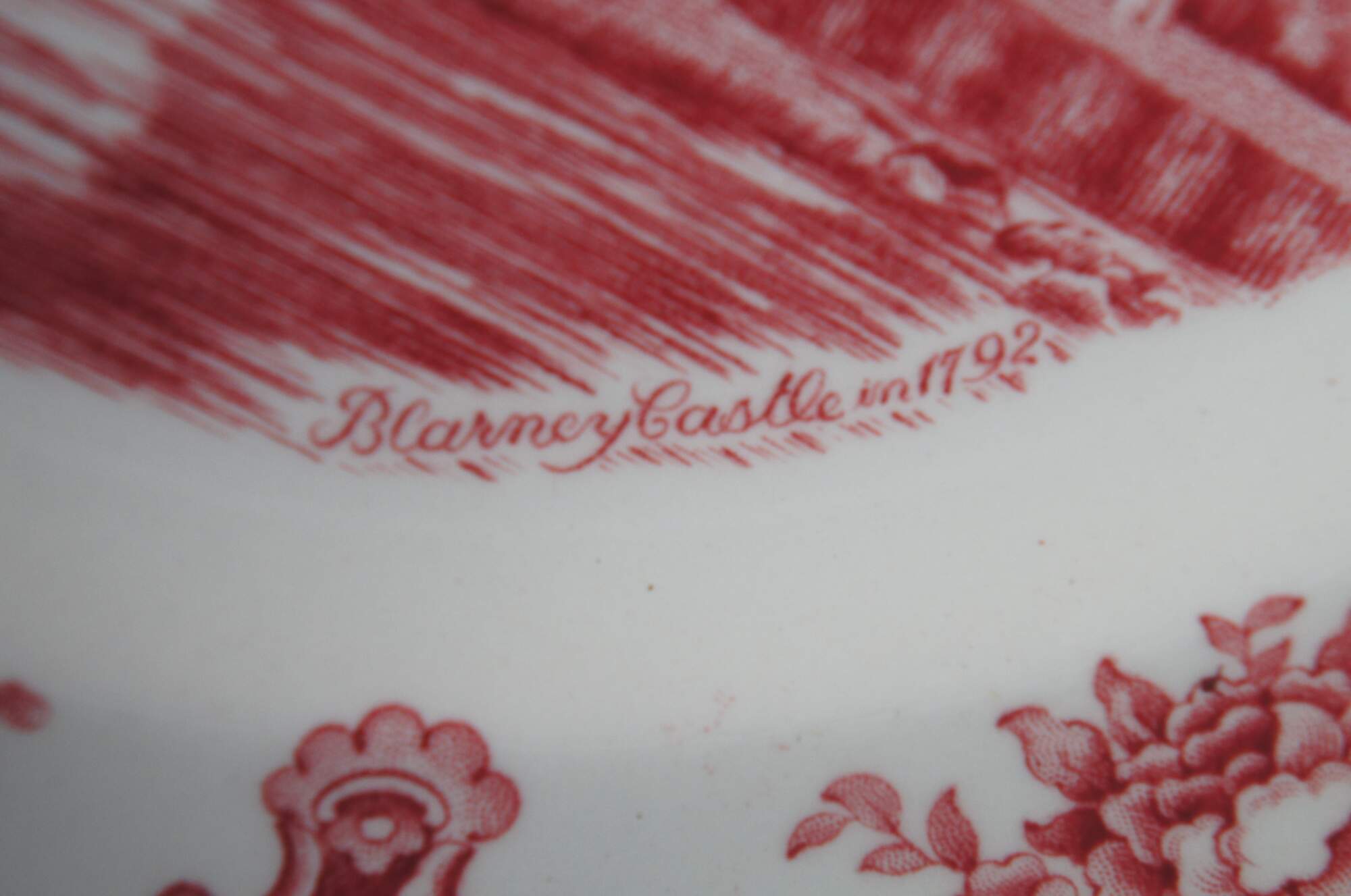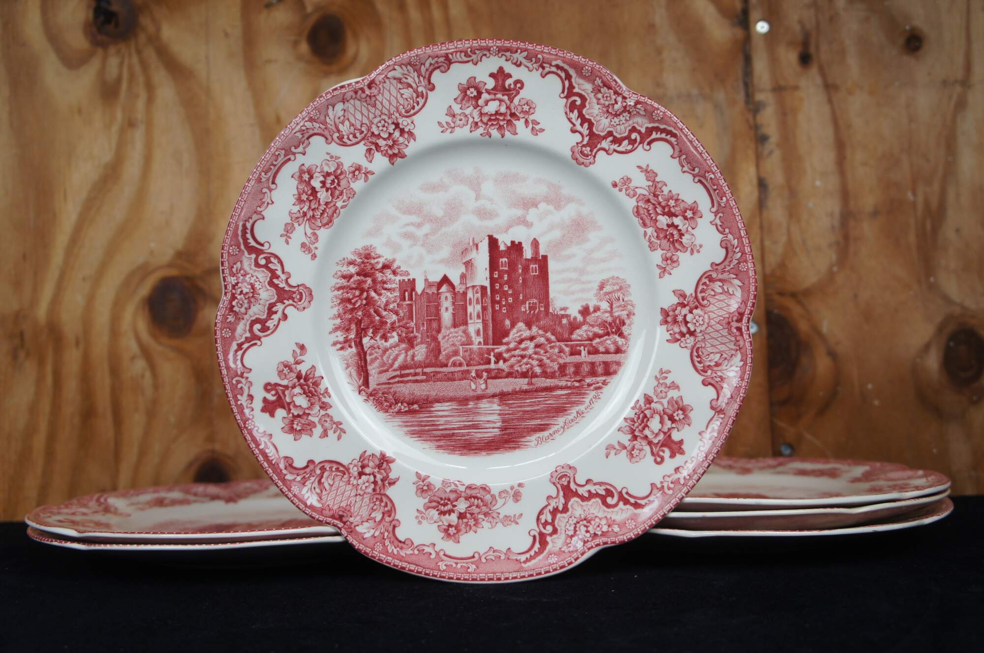 Antique English transferware china set by Johnson Brothers features the Old Britain Castles patterns, Blarney Castle, Haddon Hall, and Cambridge. Crown Mark, England.