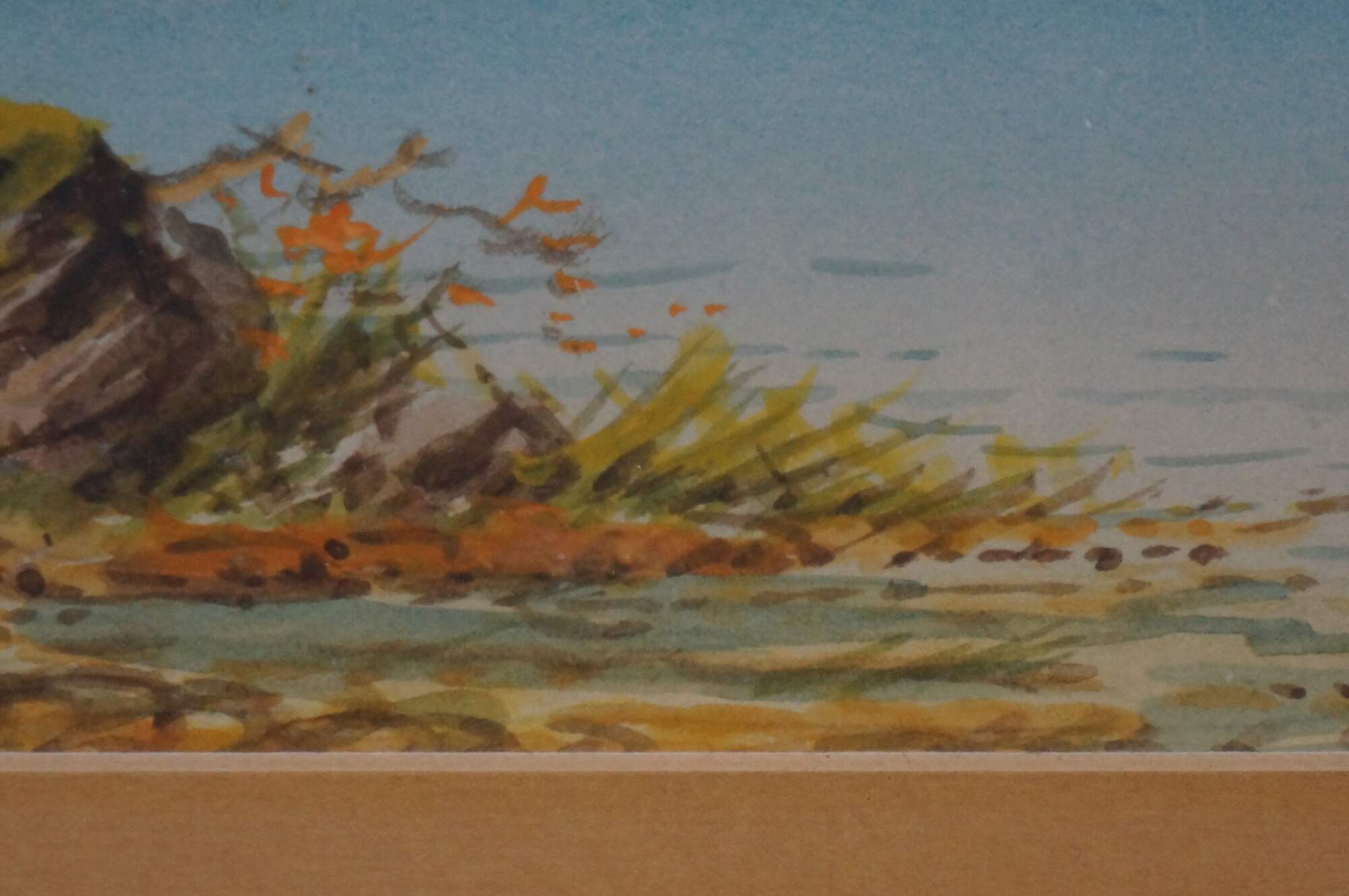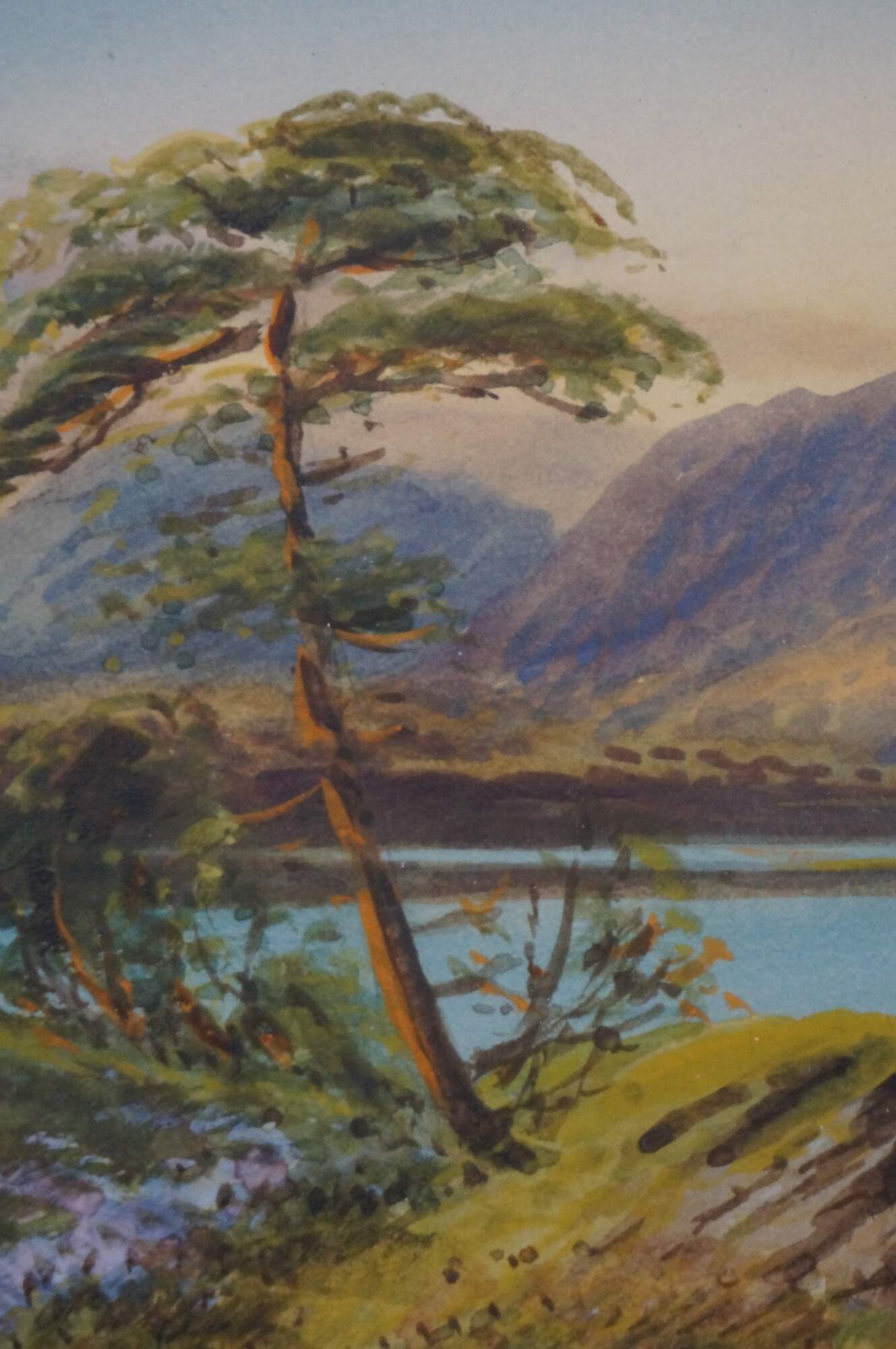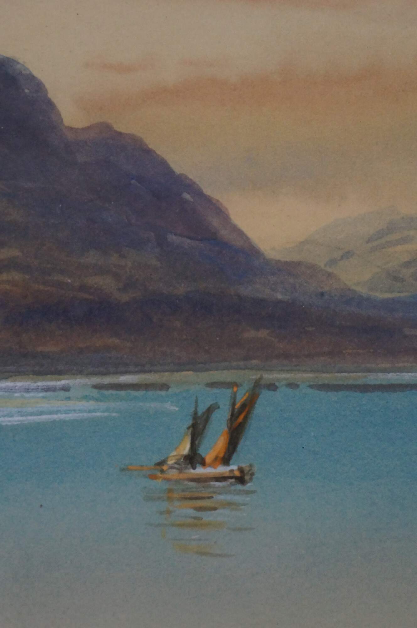 Signed watercolor seascape painting by Edwin Earp featuring a calm landscape with a mountain / tree / lake / ocean / river scene and boat. Attributed location Loch Tay Scotland.