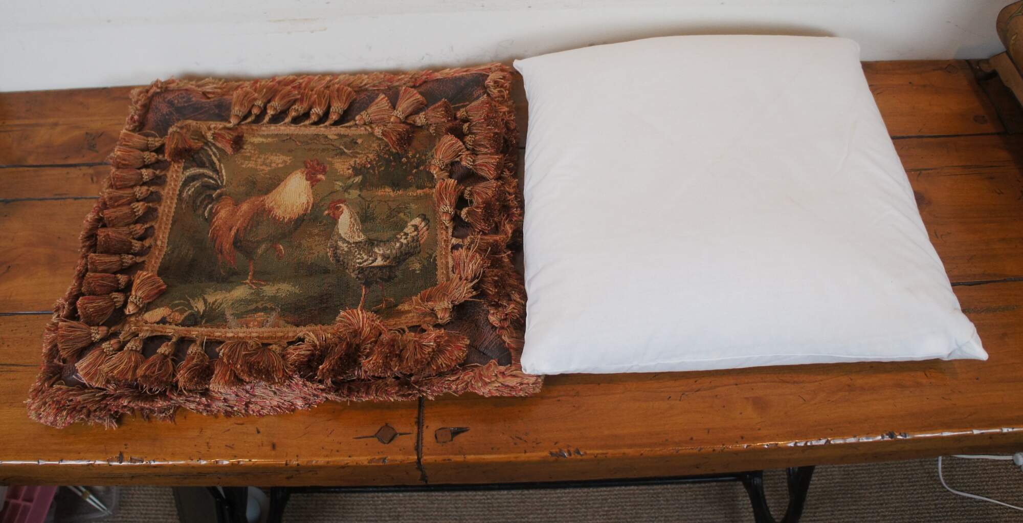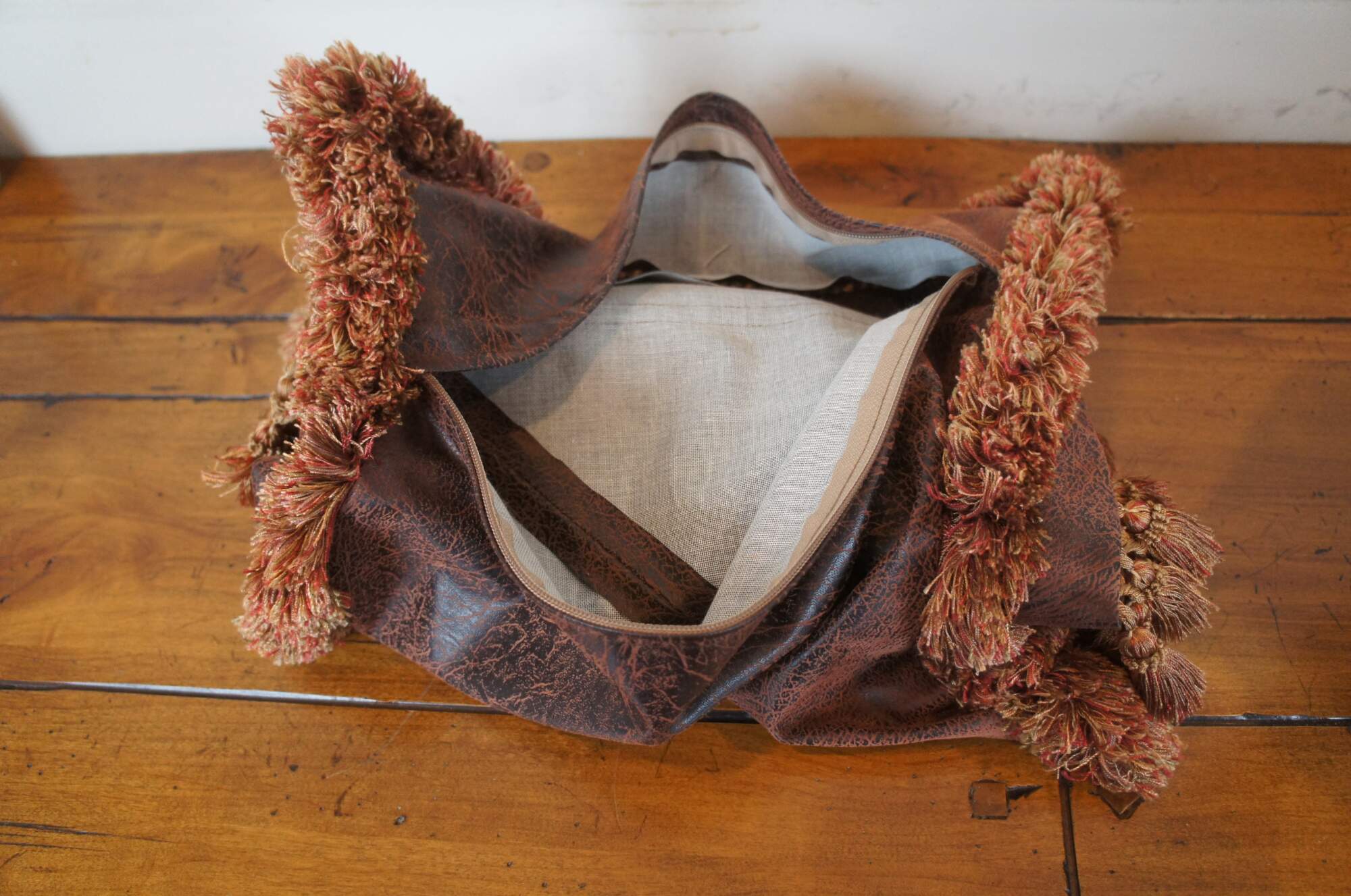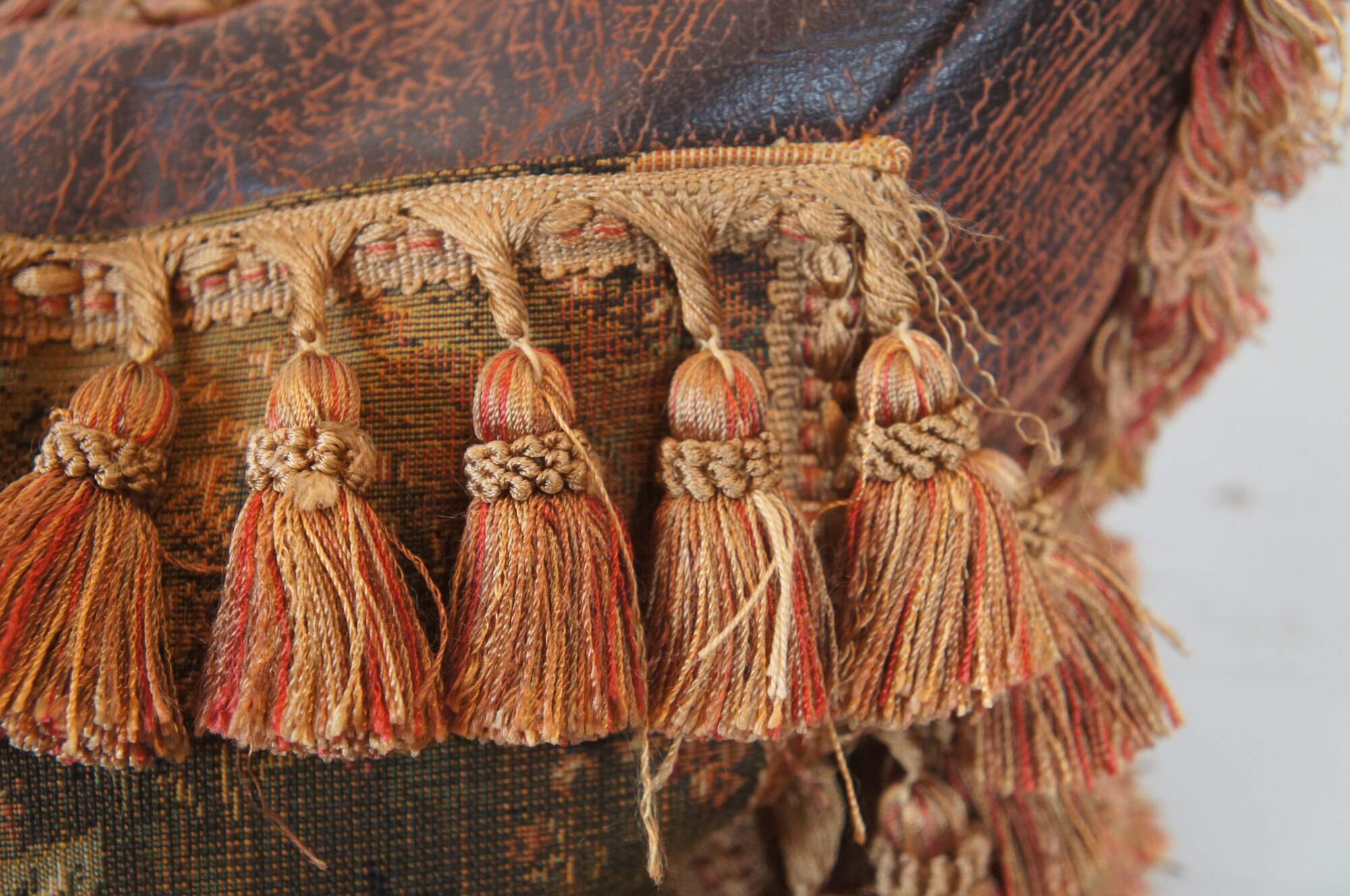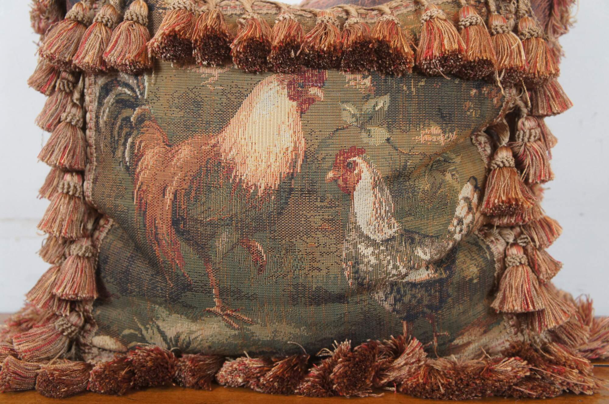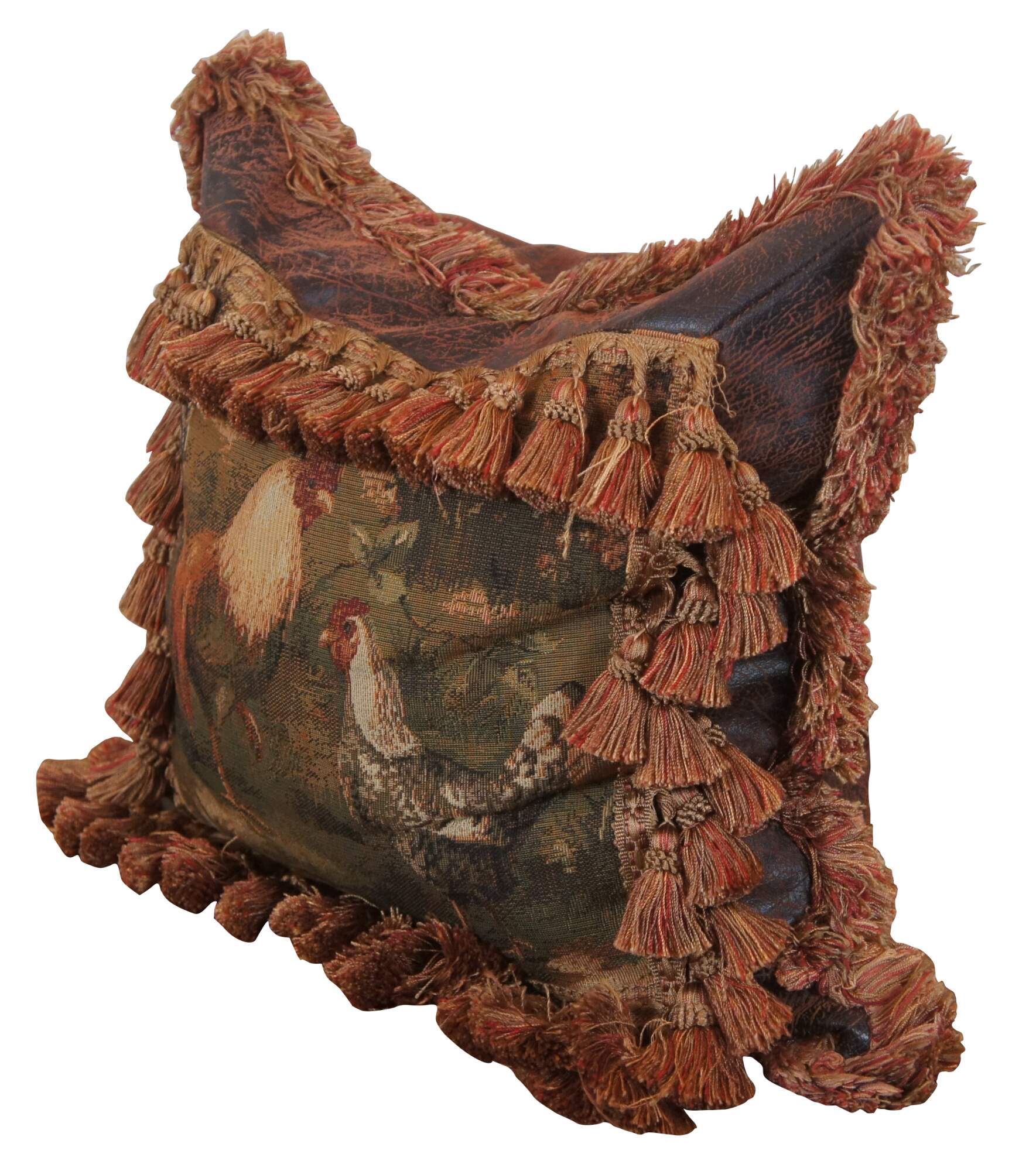 Vintage needlepoint embroidered rooster farmhouse pillow featuring leather and tassel / fringe accents with a microbead stuffing.