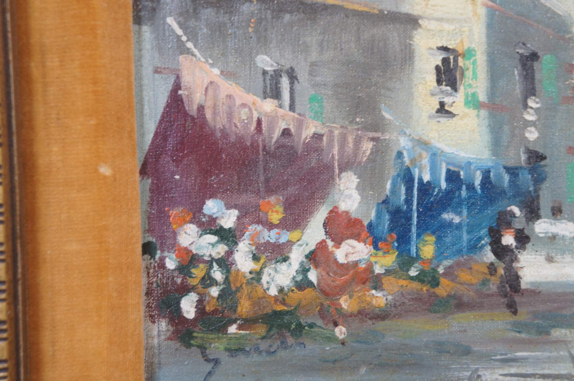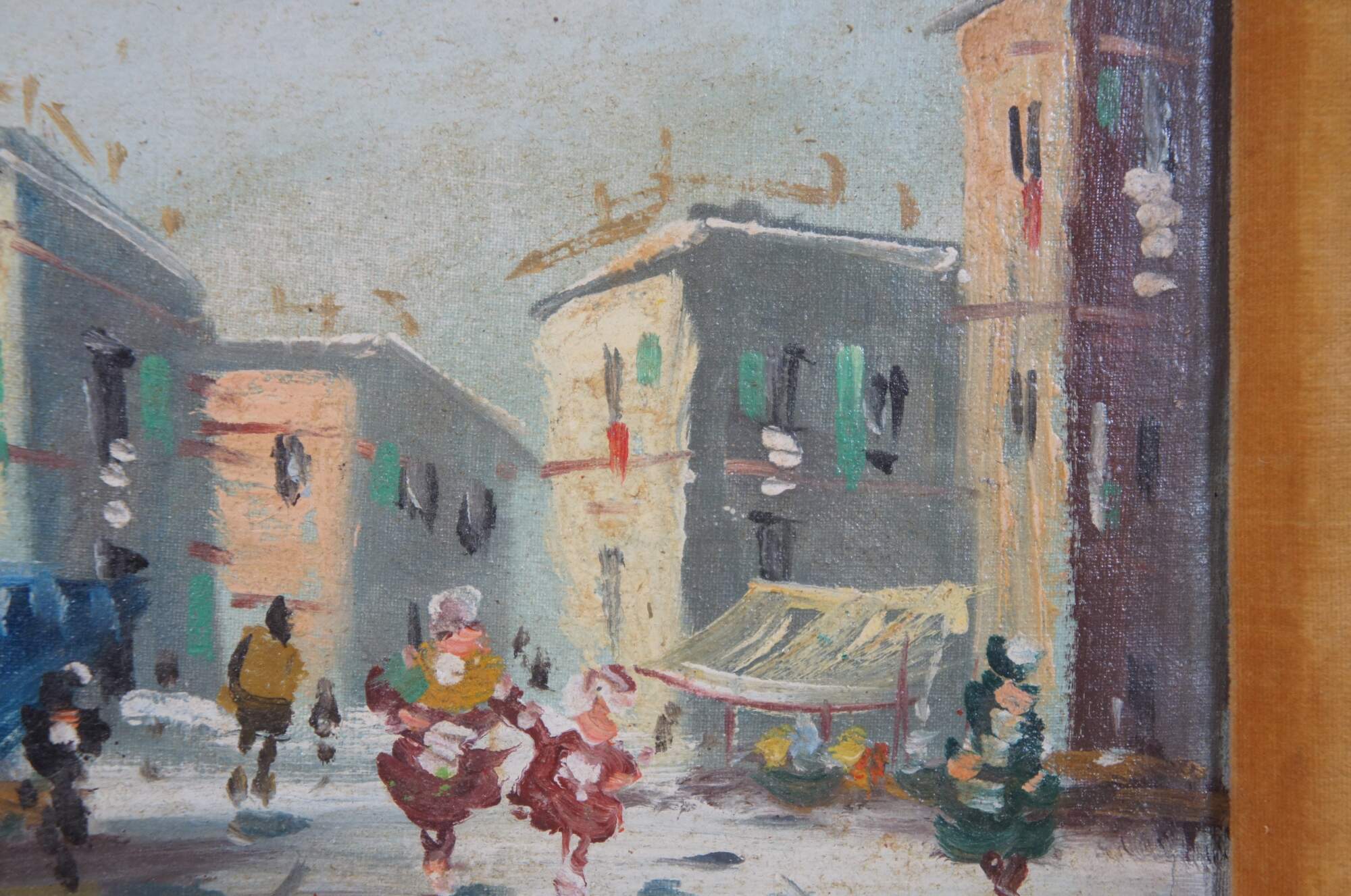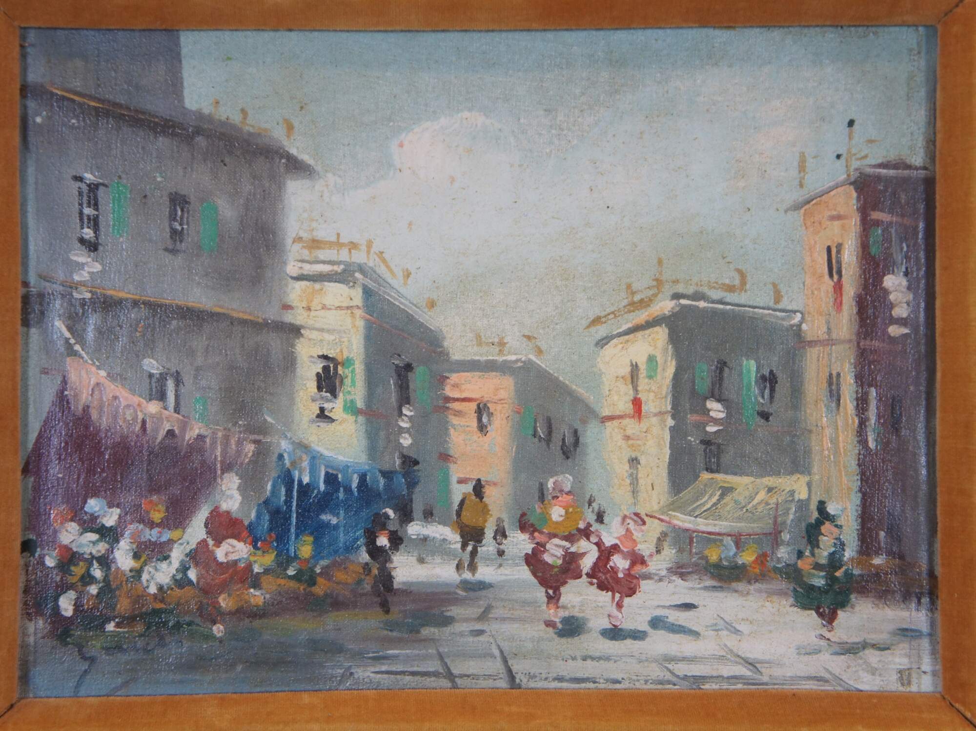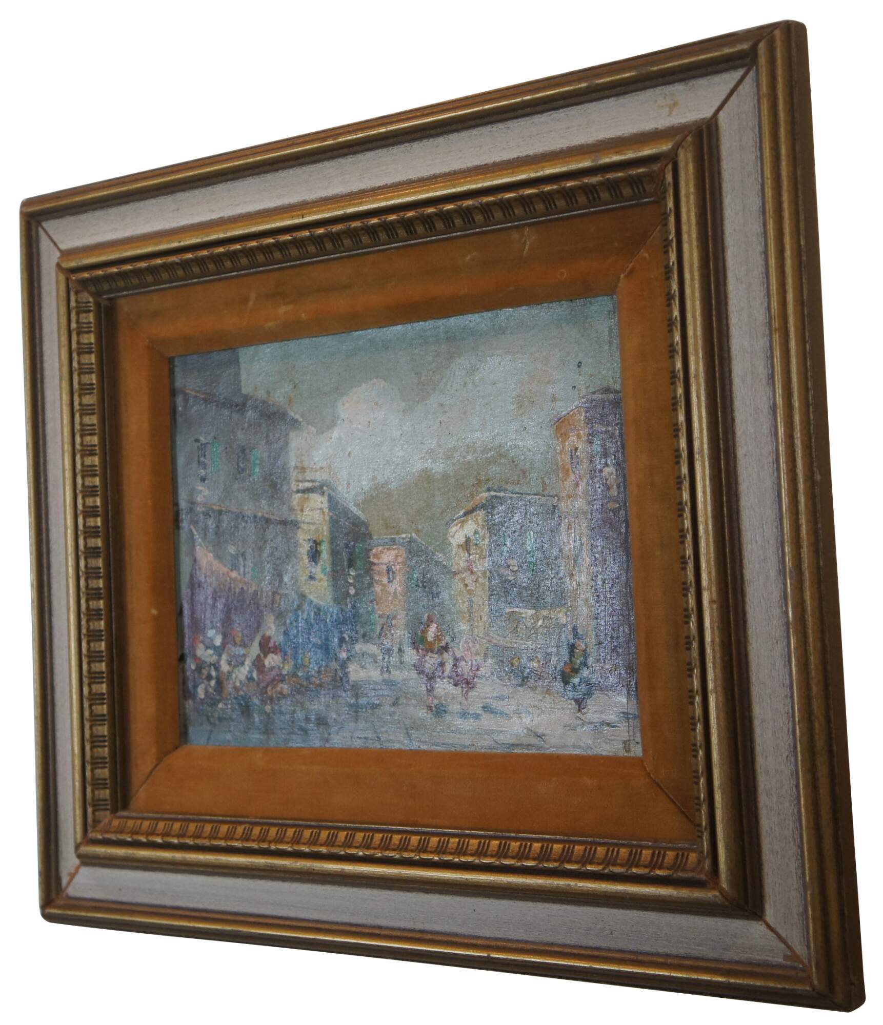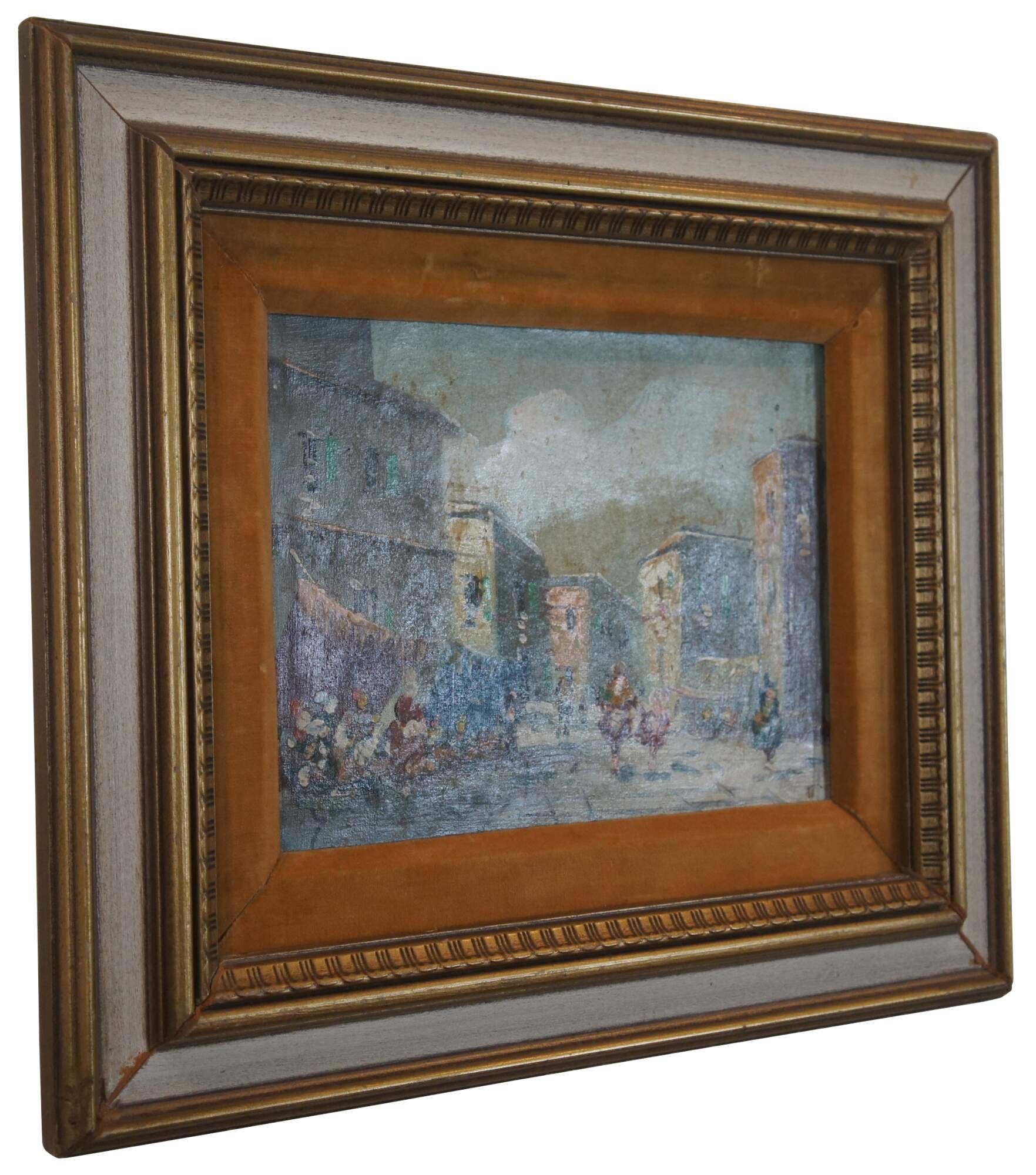 Vintage impressionist oil painting on canvase featuring a cityscape street scene with buildings and figures strolling through a marketplace. Marked Original Oil Painting, Italy on backside. Provincial white and gold frame features ornate bevel of velvet matte.