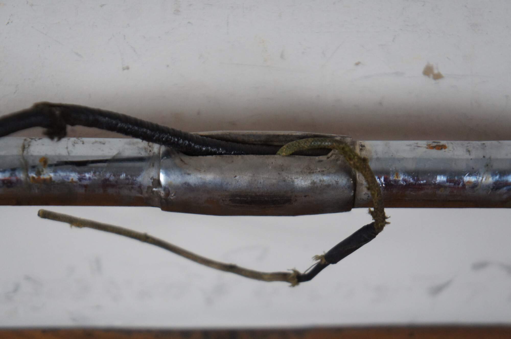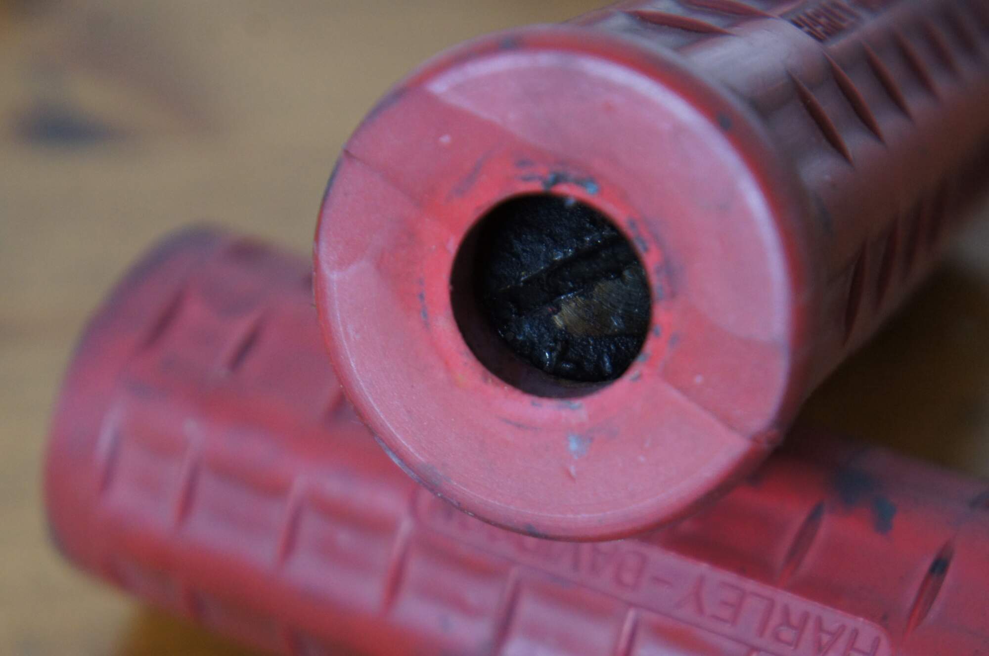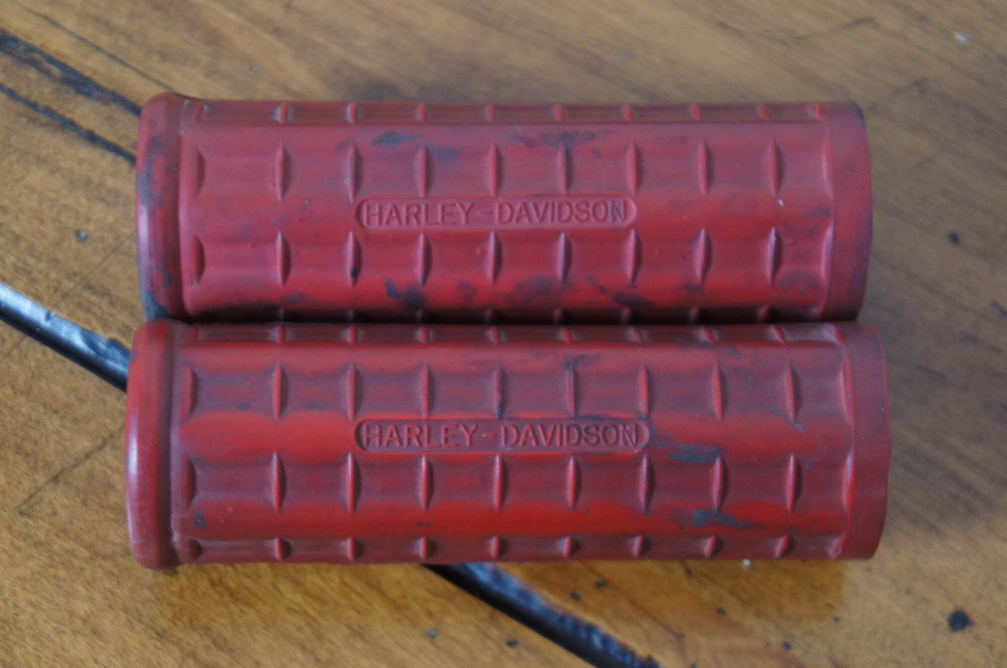Vintage Harley - Davidson Panhead or Knucklehead handle bars with control wires and red rubber grips. 1949-1960. Originally purchased in the 1980s from the Pennsylvania warehouse where a cache of old Harley parts were discovered.