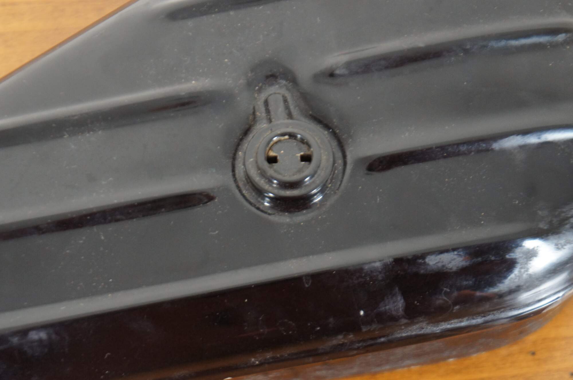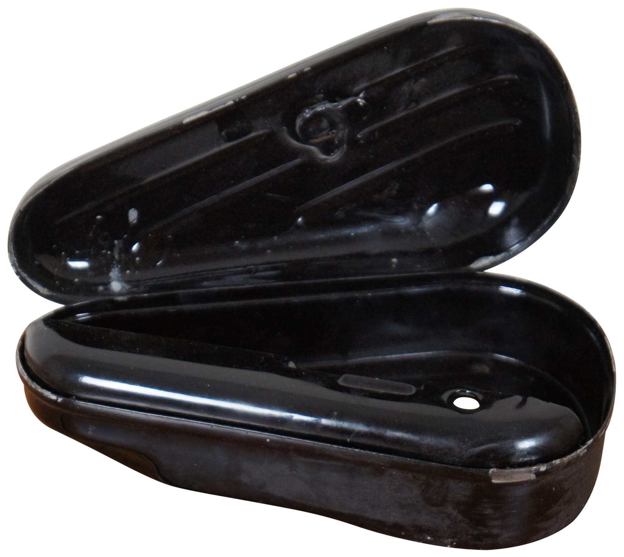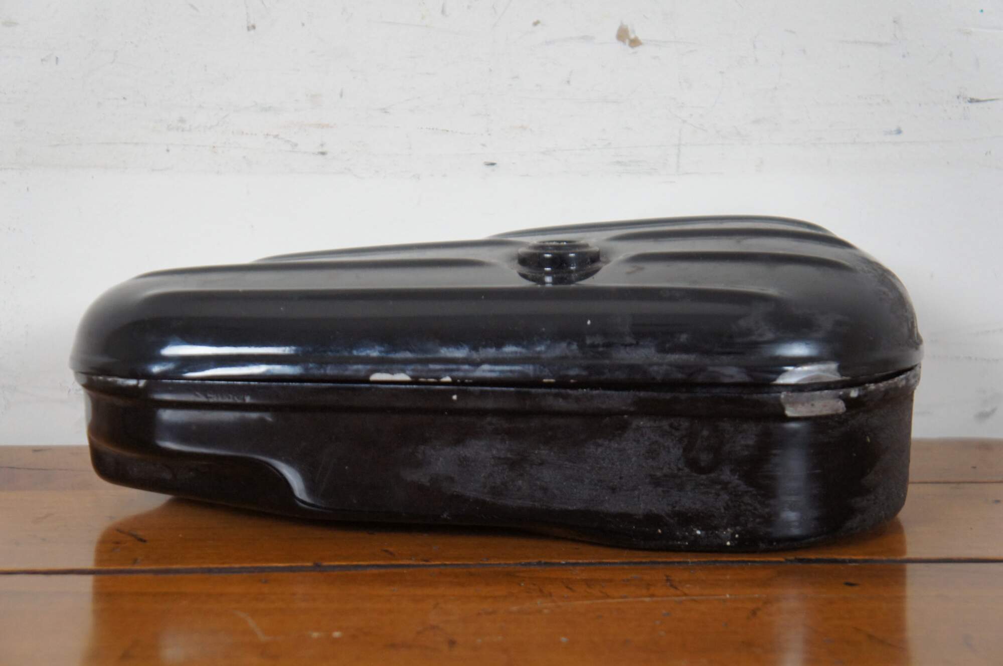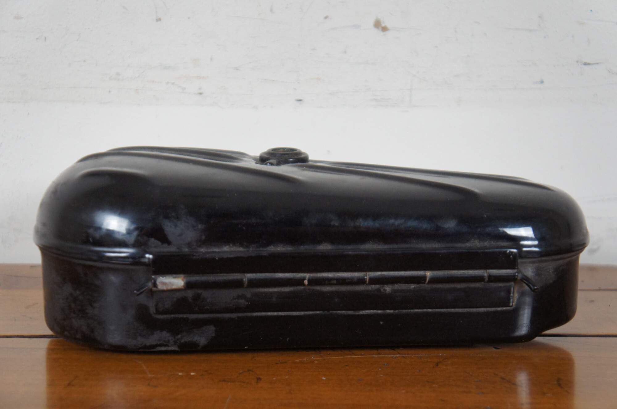 1950s Rare Vintage Harley-Davidson black ribbed kidney shaped OEM Hydraglide metal tool box for all Panhead motorcycles from 1940-1964. Originally purchased in the 1980s from the Pennsylvania warehouse where a cache of old Harley parts were discovered.