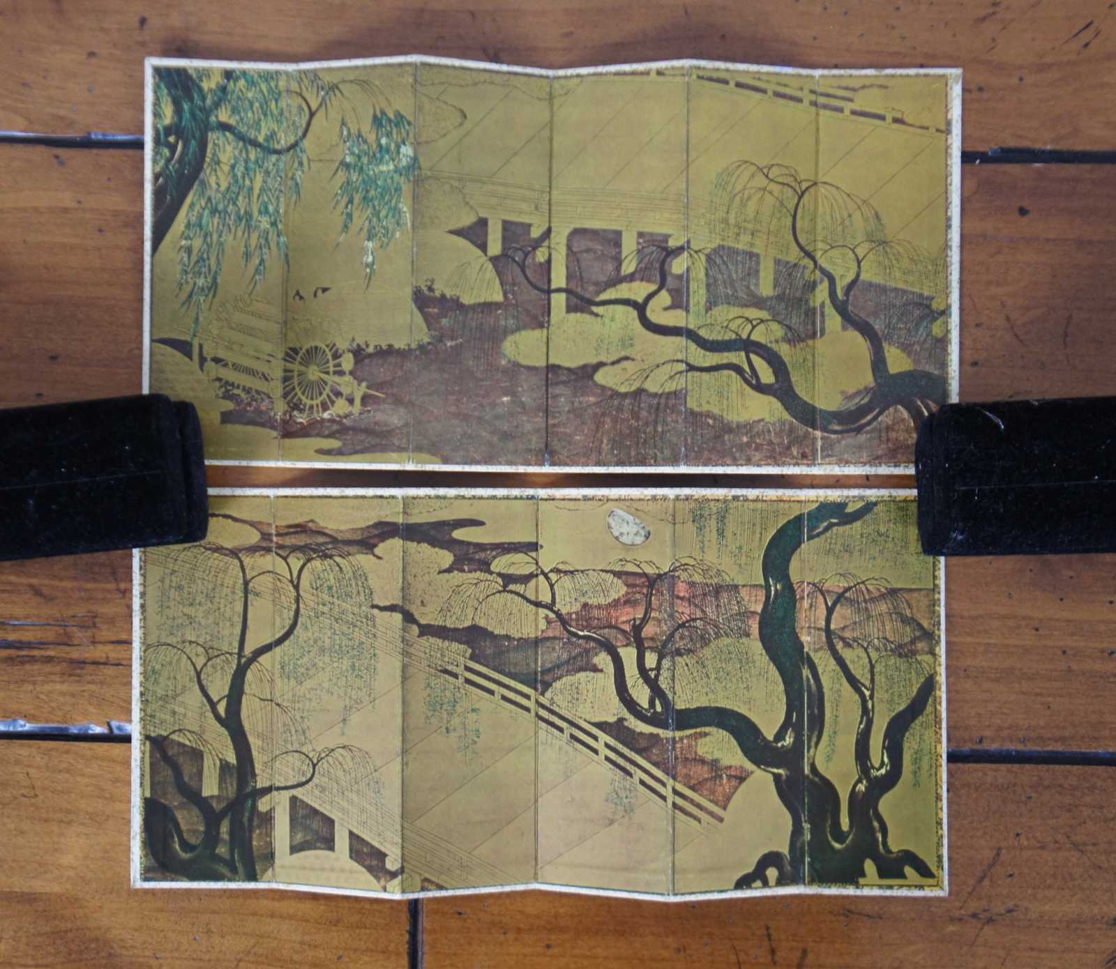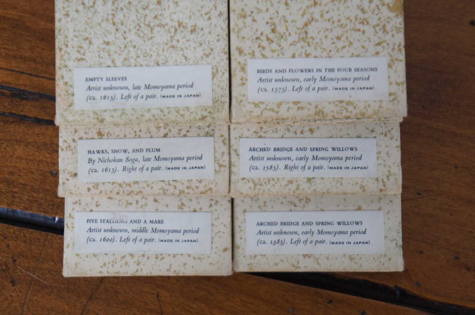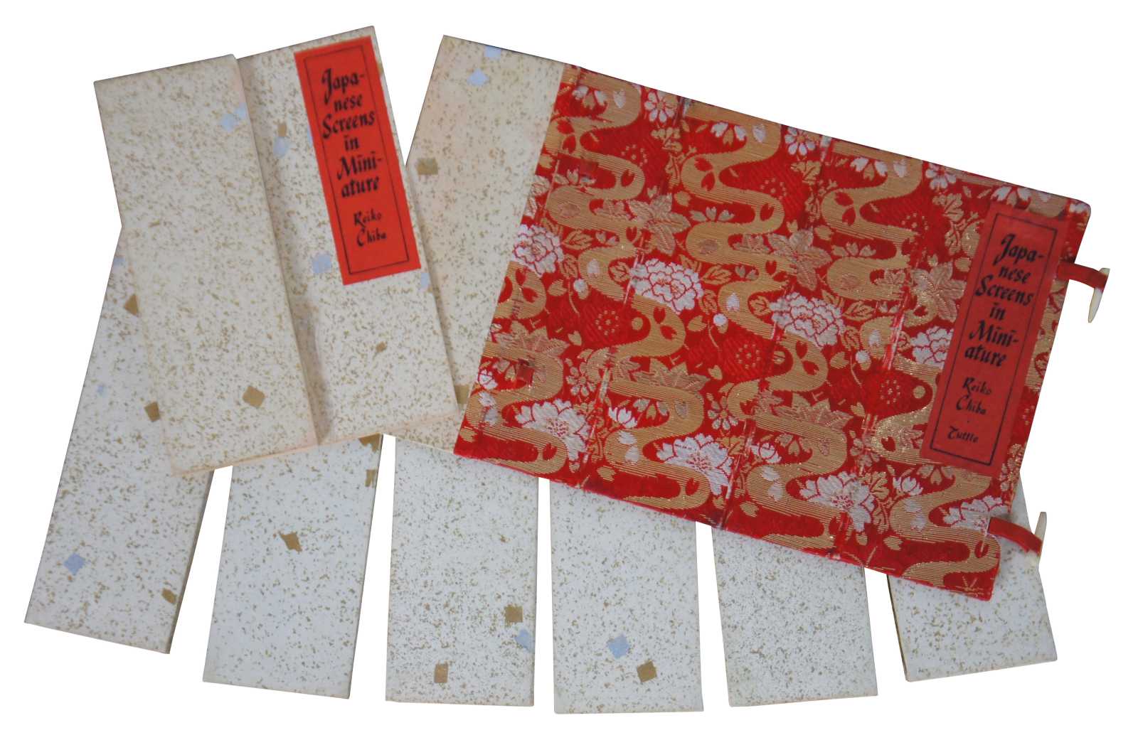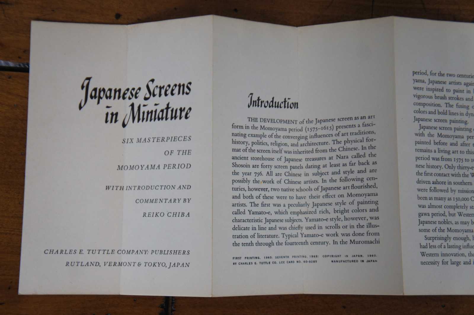 Vintage set of 6 Japanese Screens in Miniature book set: Six Masterpieces of the Momoyama Period with fold out booklet containing commentary by Reiko Chuiba. Published by Charles E. Tuttle Company, 1963. The six reproduced screens are print on cardboard and contained in an embroidered silk box.