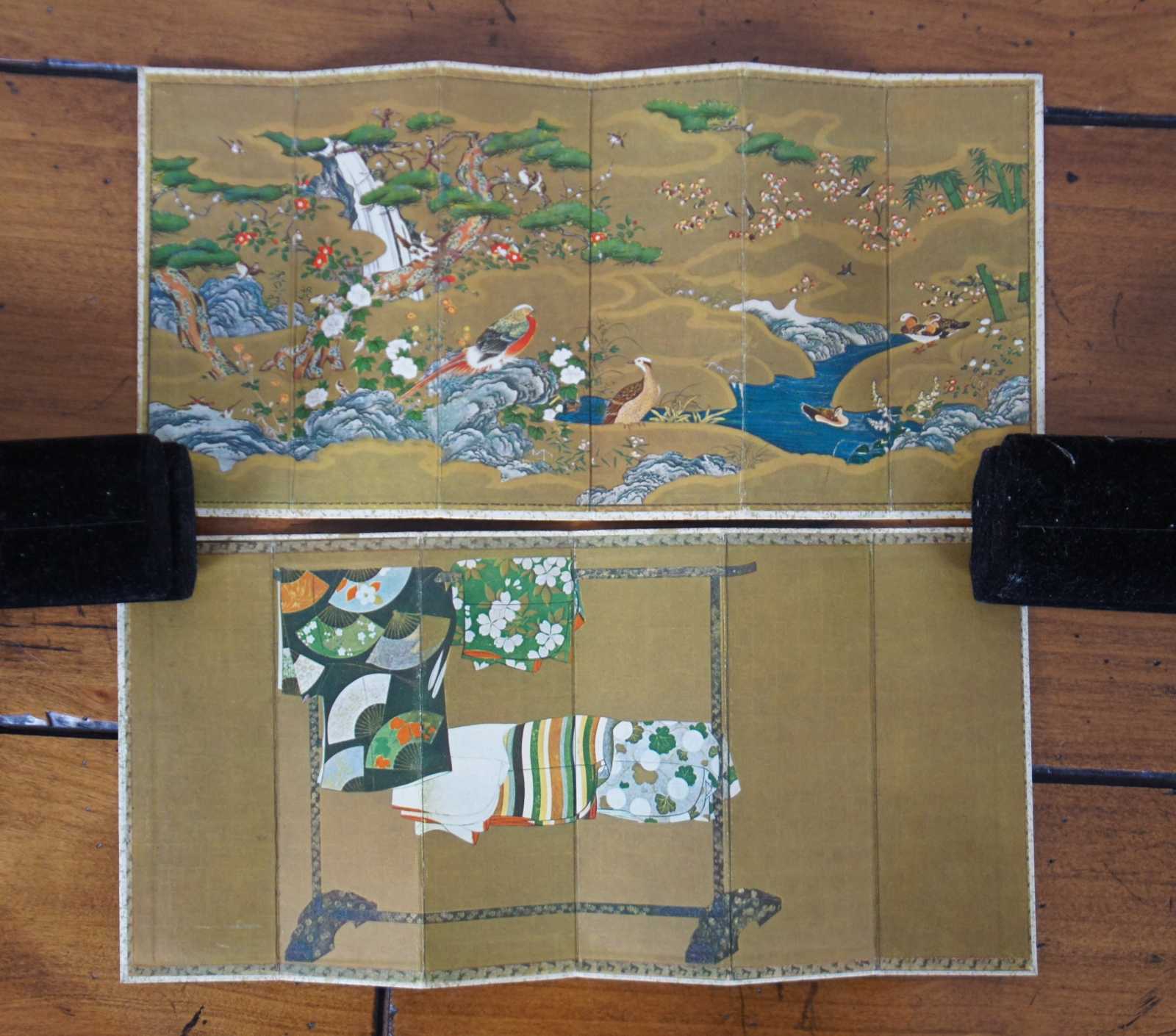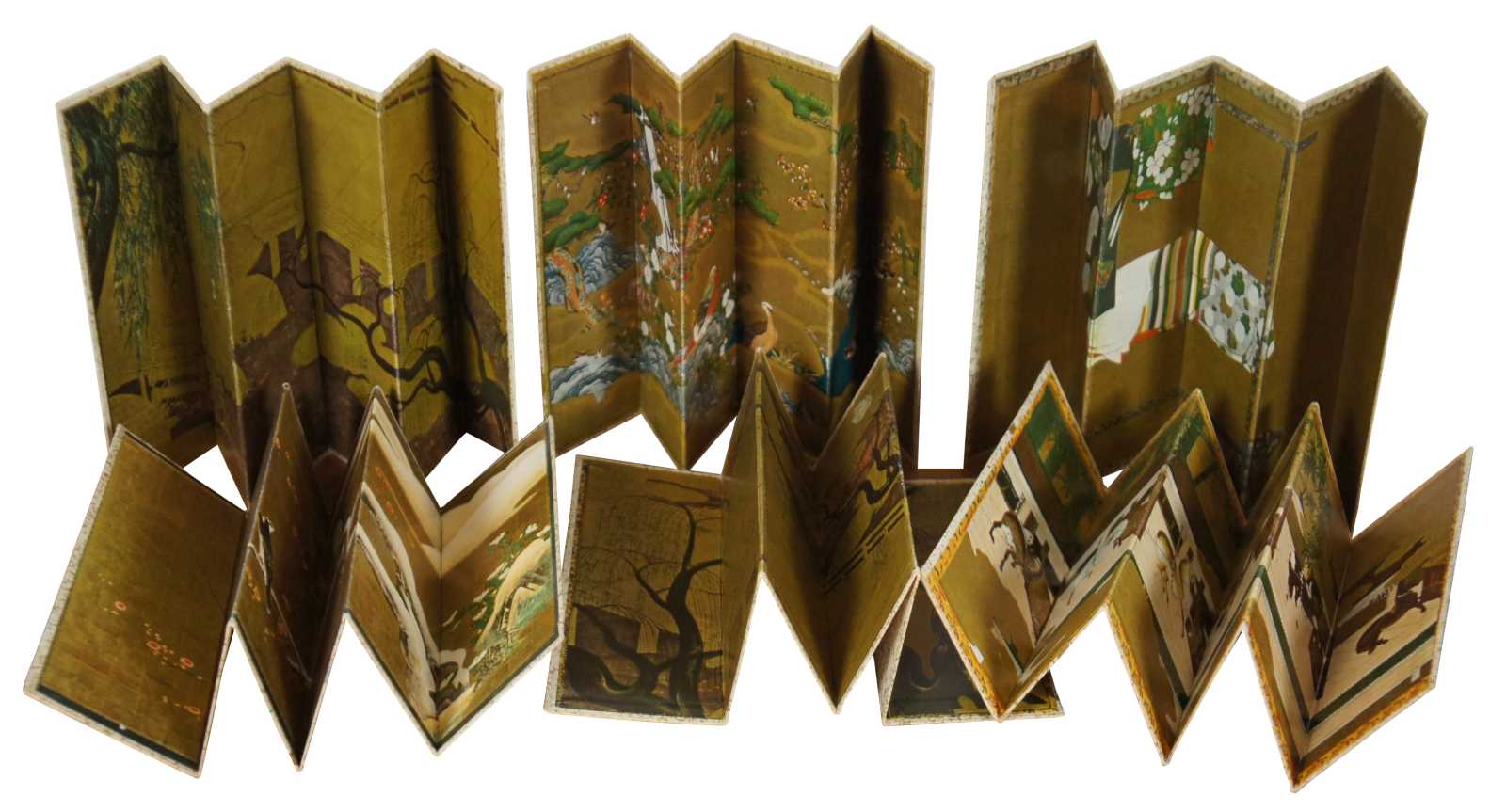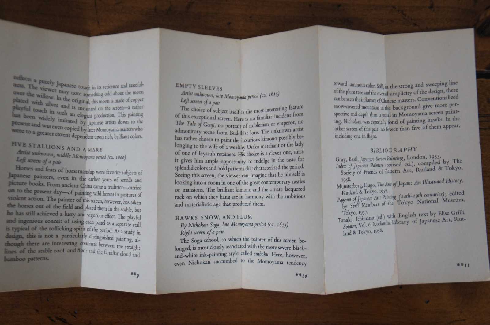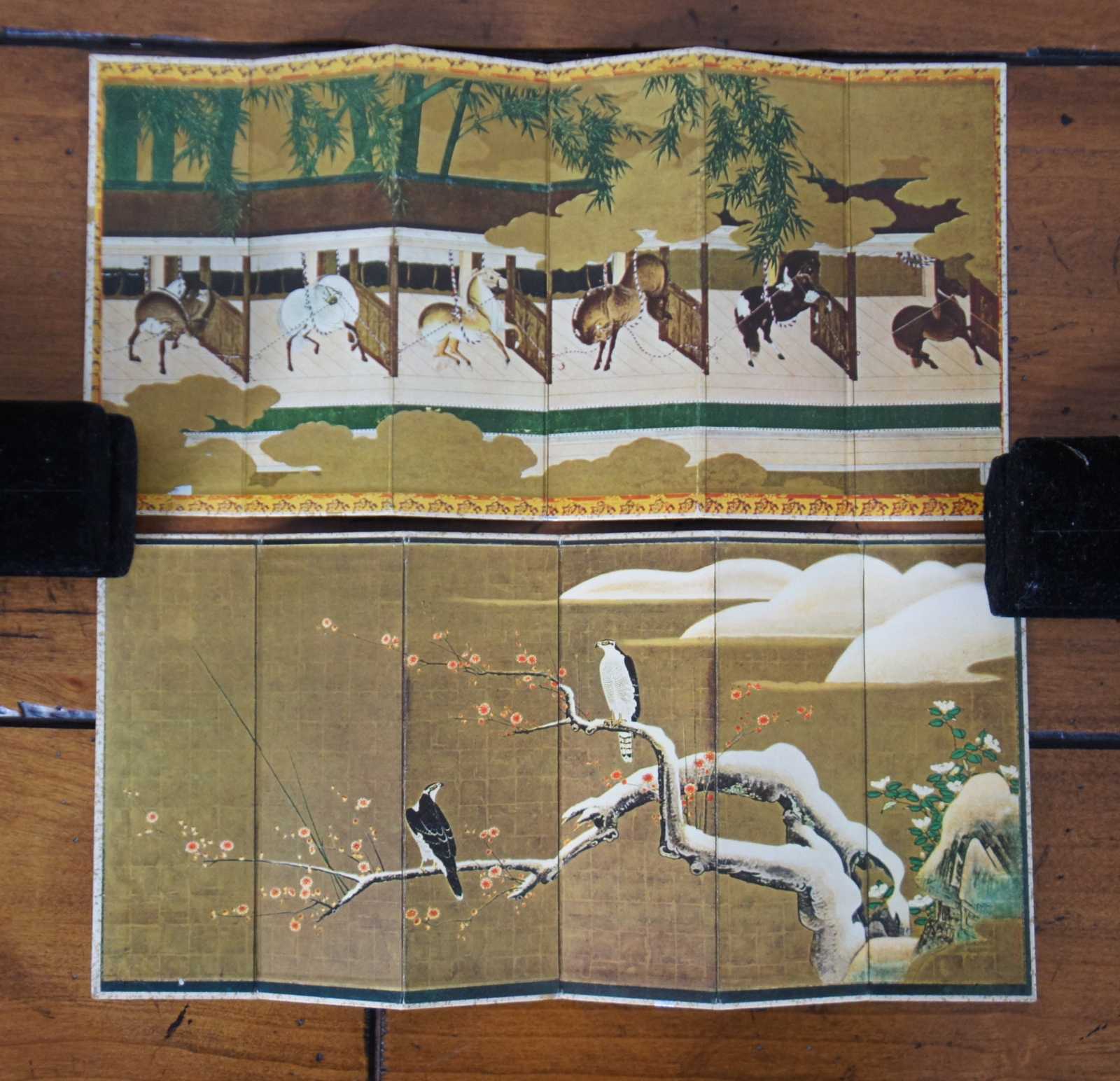 Vintage set of 6 Japanese Screens in Miniature book set: Six Masterpieces of the Momoyama Period with fold out booklet containing commentary by Reiko Chuiba. Published by Charles E. Tuttle Company, 1963. The six reproduced screens are print on cardboard and contained in an embroidered silk box.