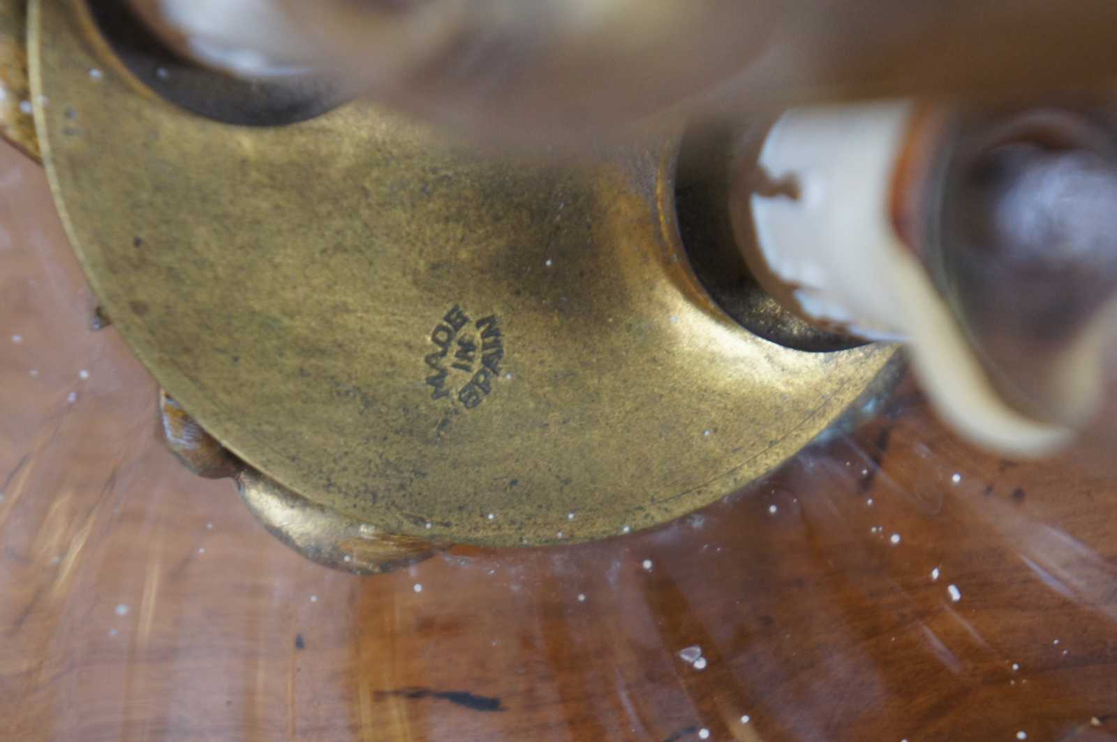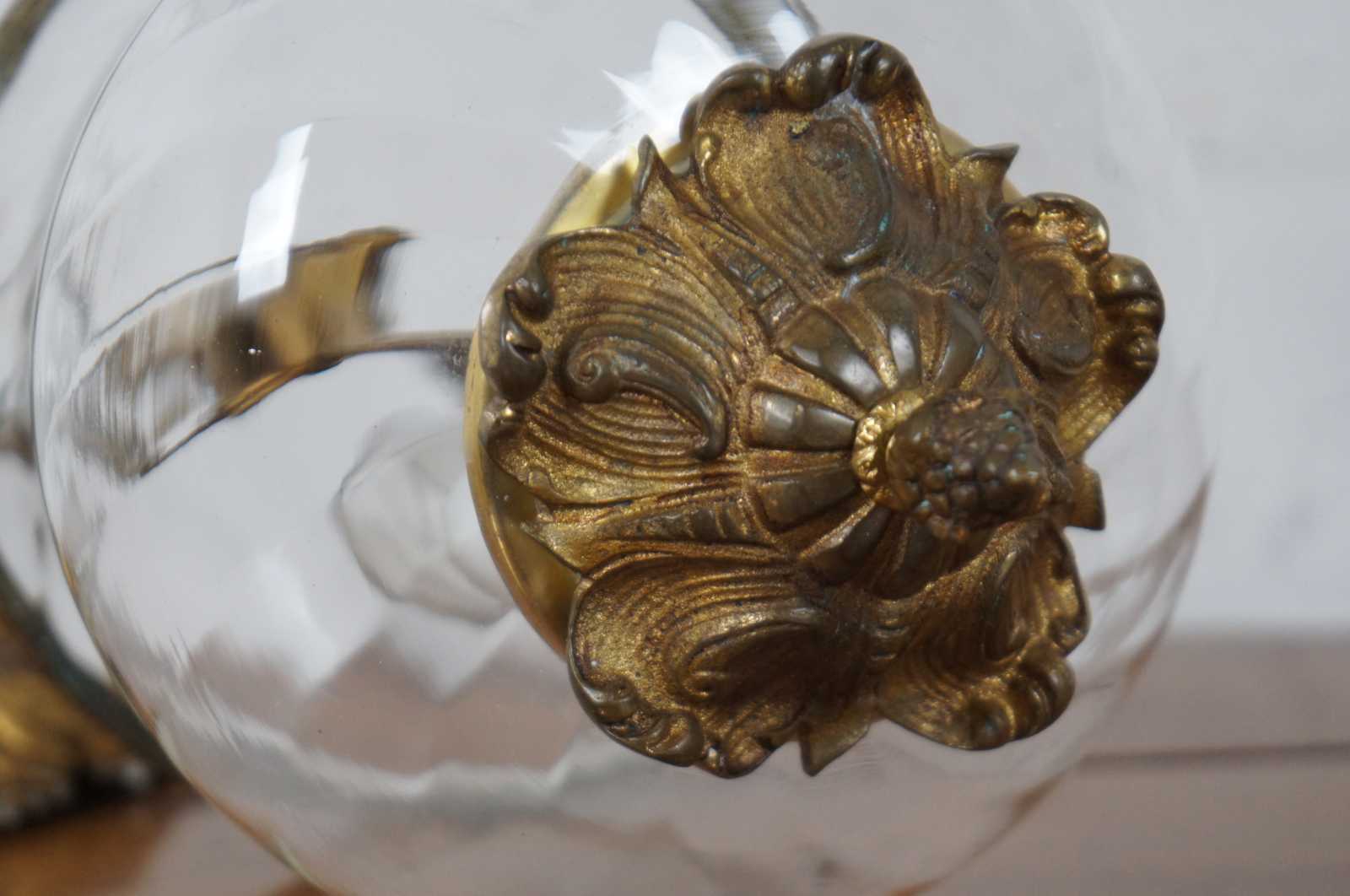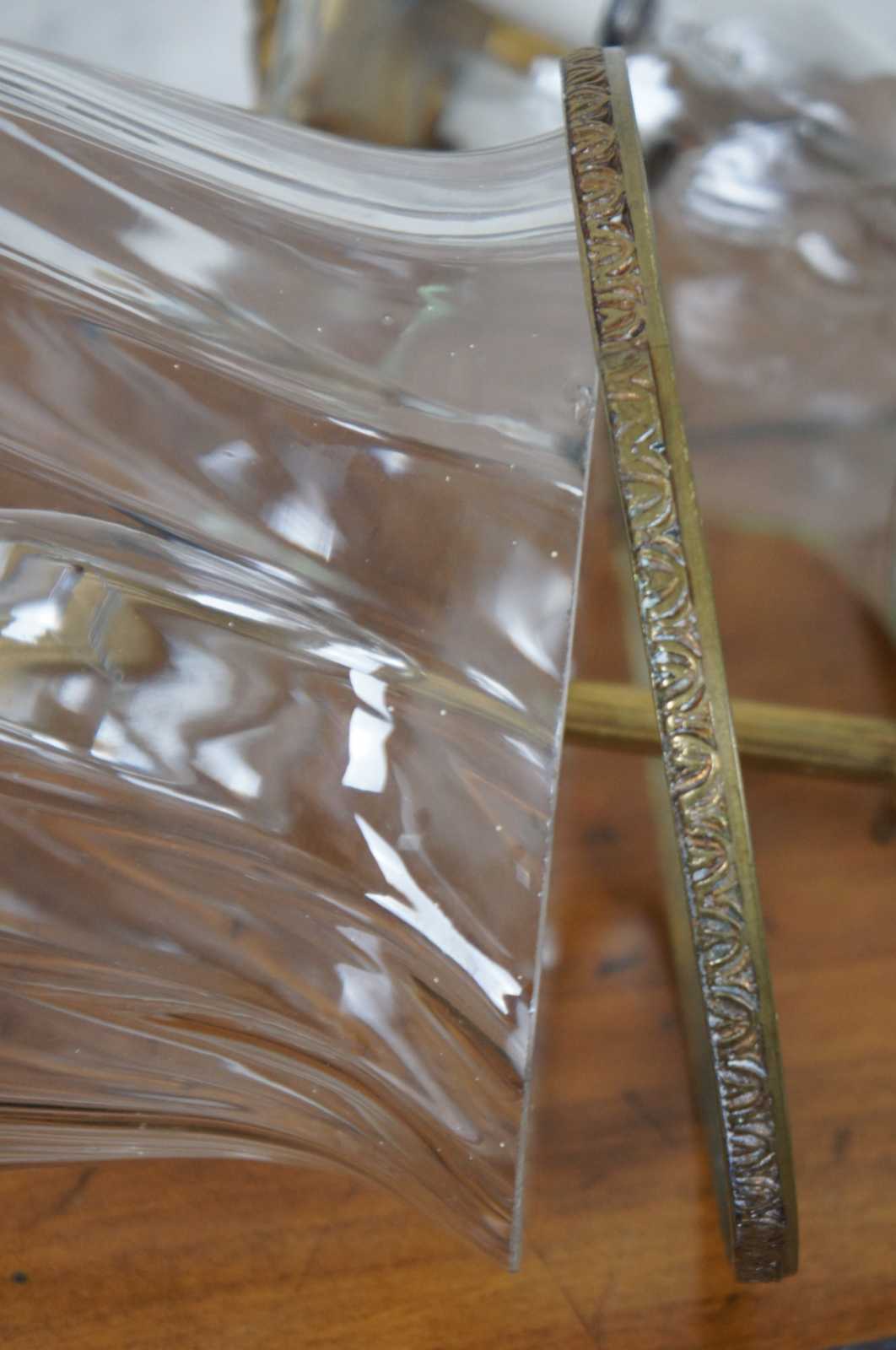 Pair of vintage two light candle bell jar / lantern style pendant lights fashioned of glass hurricanes with a twisted, rippled design, with ornate baroque brass accents. Made in Spain.