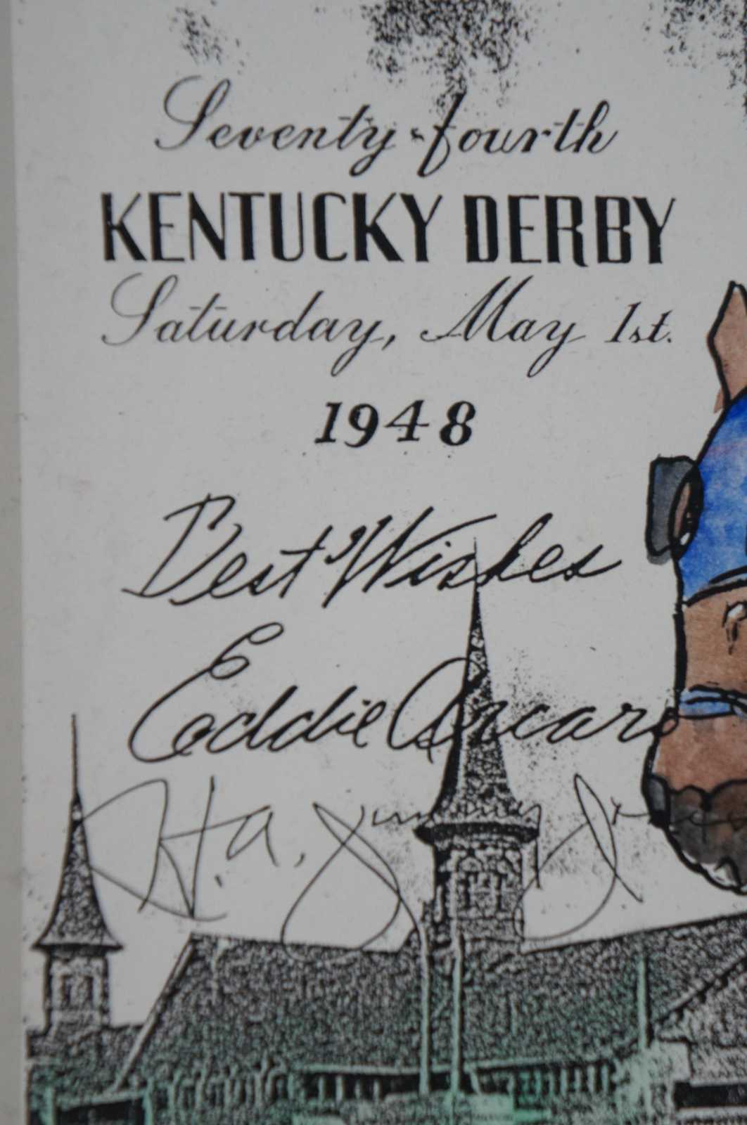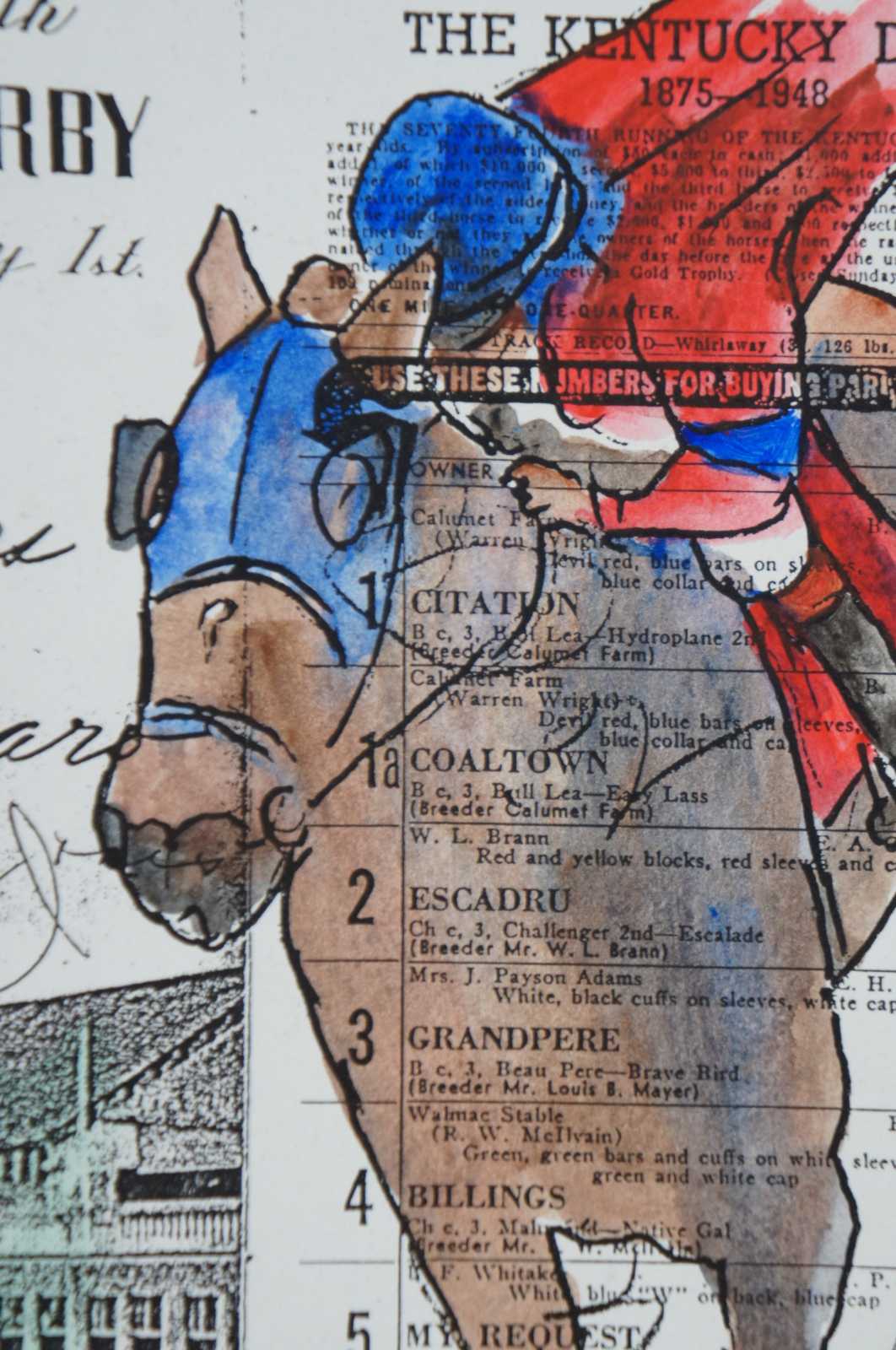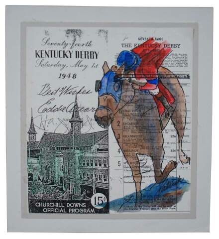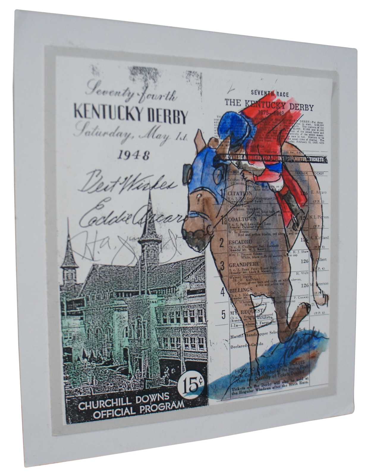 Vintage signed watercolor painting by American equestrian artist Patrish, showing winning jockey Eddie Arcaro on his horse Citation, painted on a photocopy of the 1948 Kentucky Derby Churchhill Downs program that was signed by Arcaro and someone else.