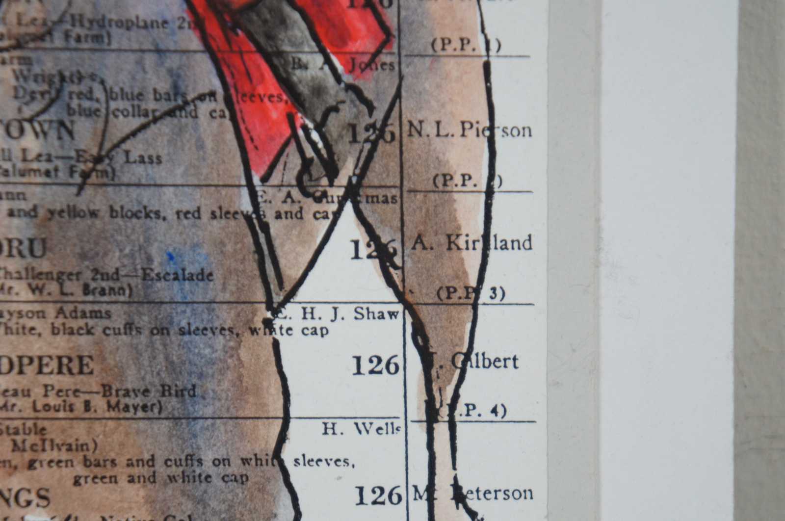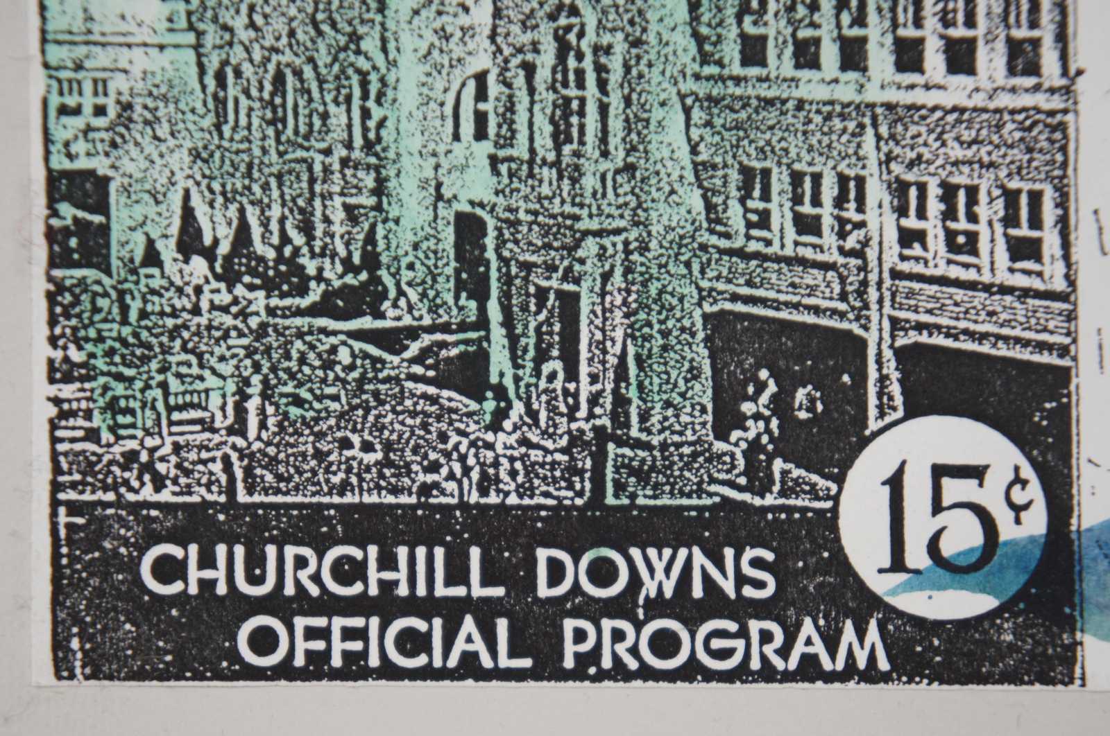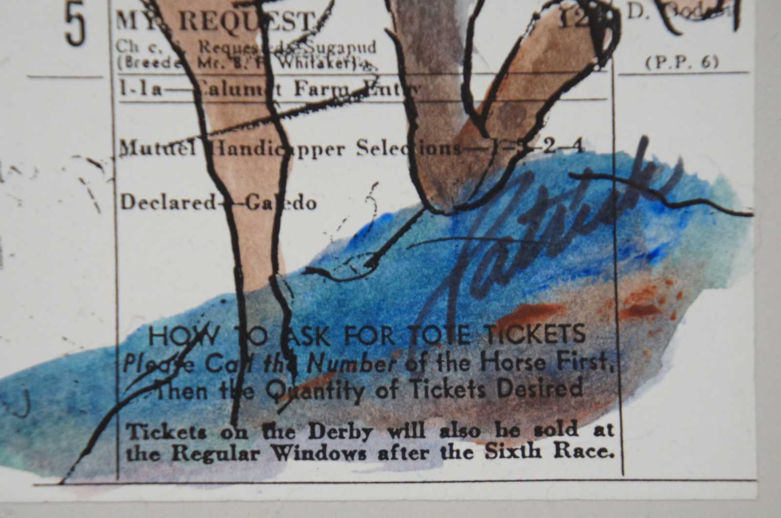 Vintage signed watercolor painting by American equestrian artist Patrish, showing winning jockey Eddie Arcaro on his horse Citation, painted on a photocopy of the 1948 Kentucky Derby Churchhill Downs program that was signed by Arcaro and someone else.