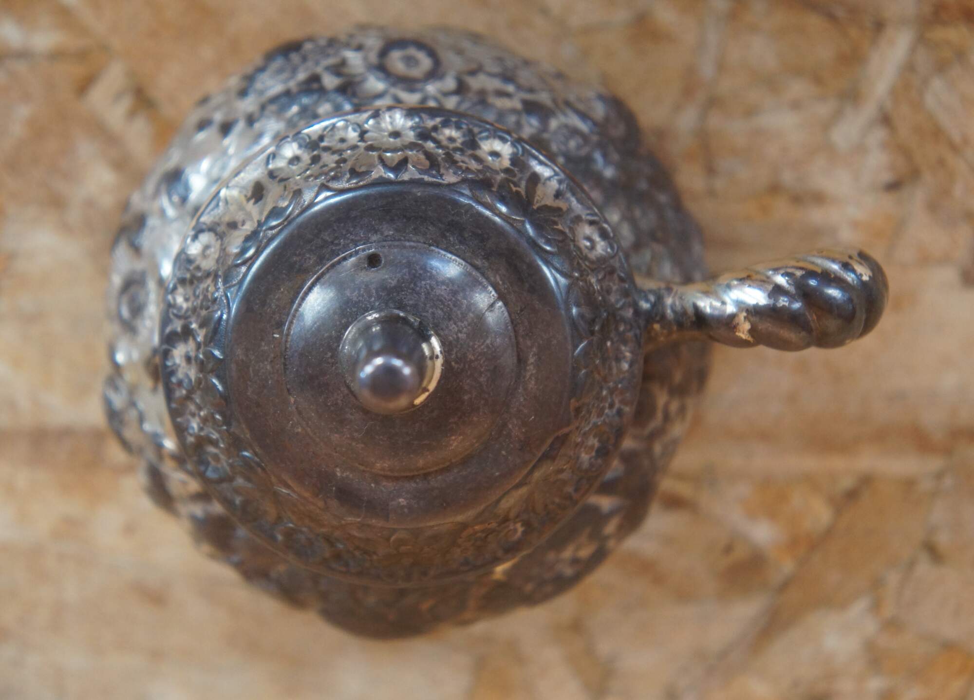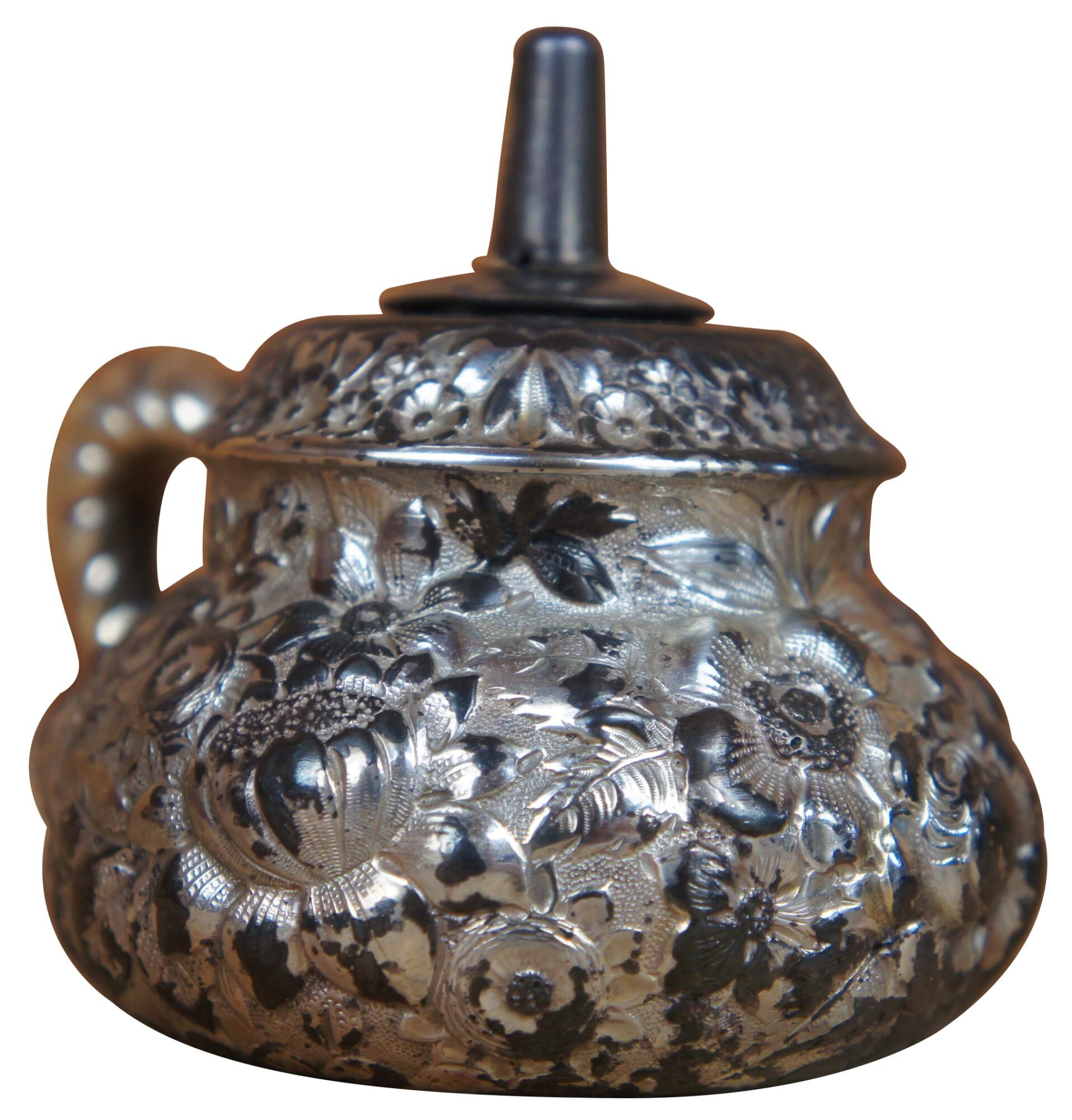 Antique Victorian Simpson Hall Miller Co quadruple silver plate oil lamp with cotton wick and ornate repousse floral design.