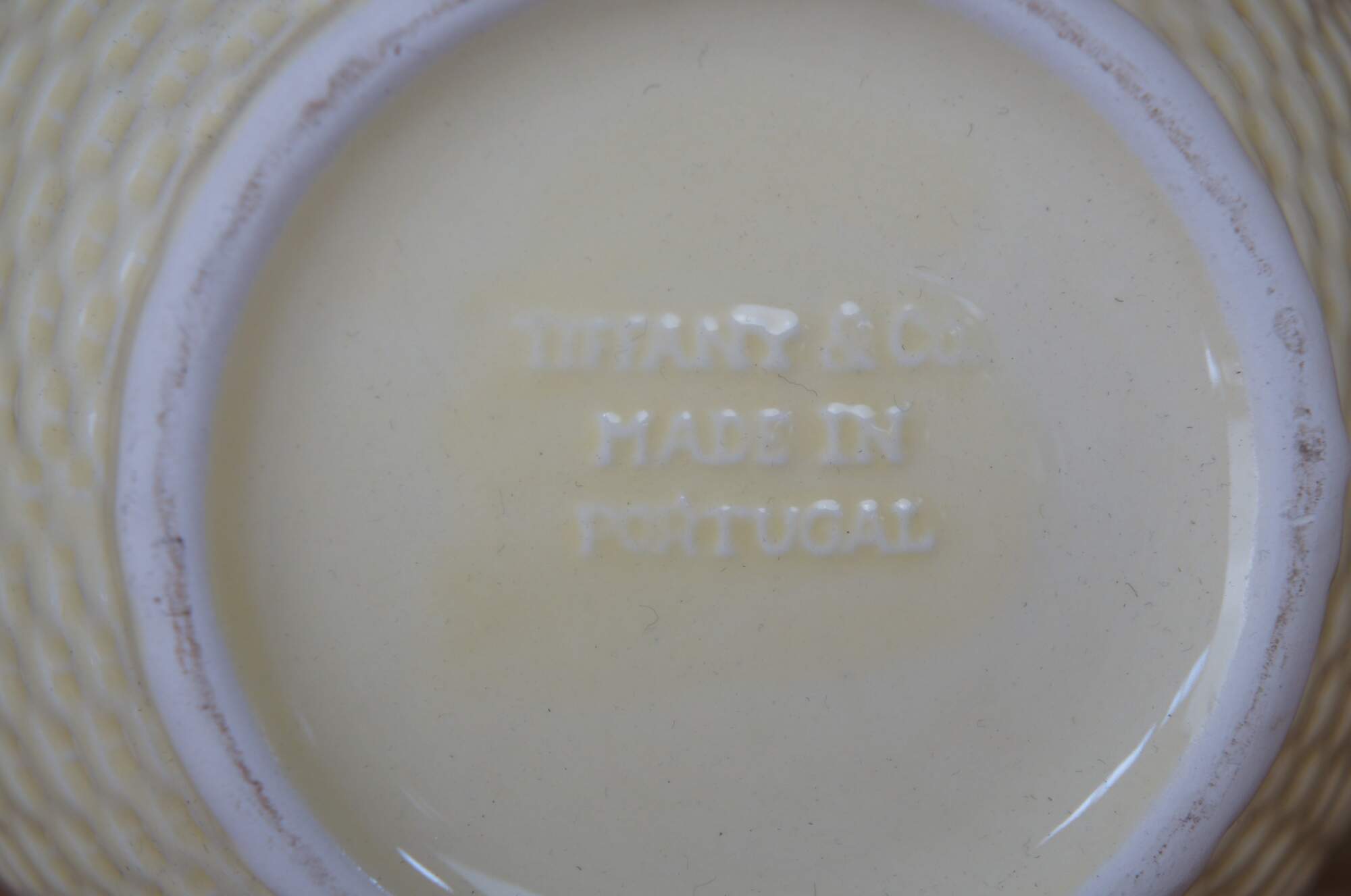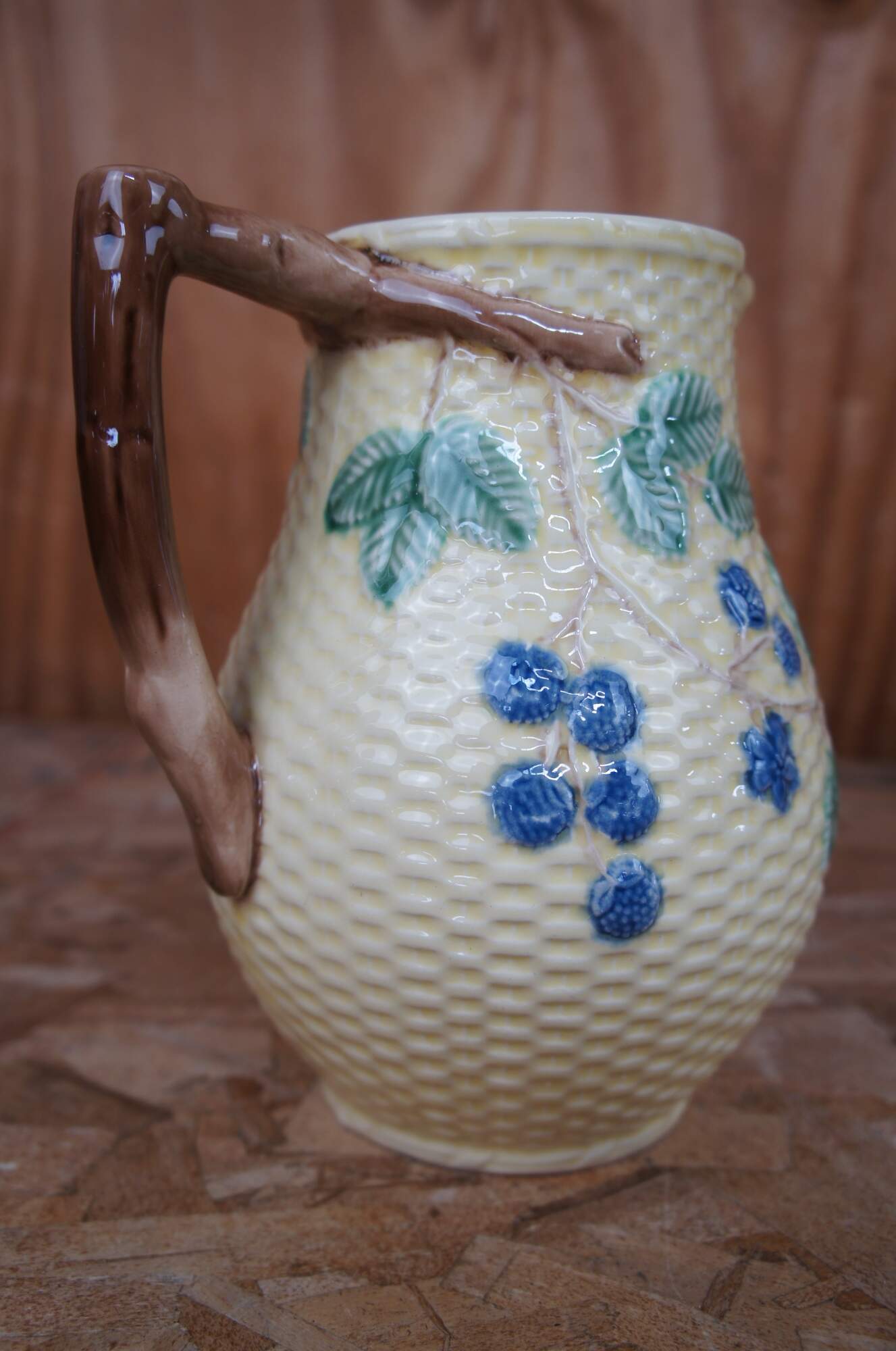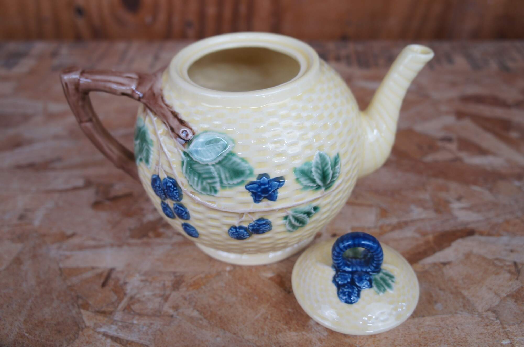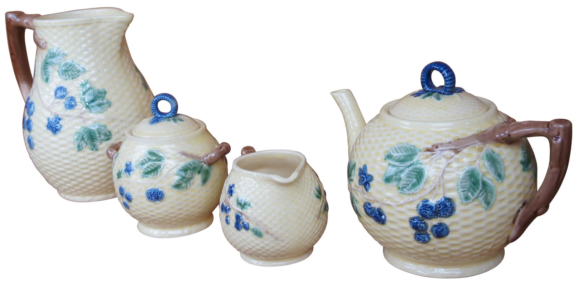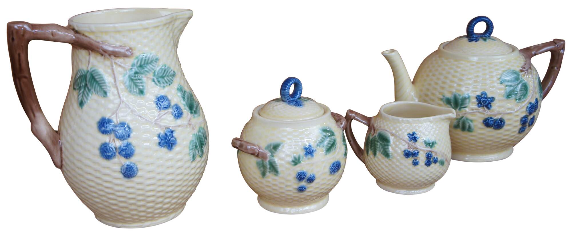 Vintage Majolica pitcher and tea / coffee service set including cream, sugar and teapot by Tiffany & Co in the Blackberries Lisbon pattern, featuring the fruit on vines with leaves on a yellow basketweave background. Made in Portugal.
