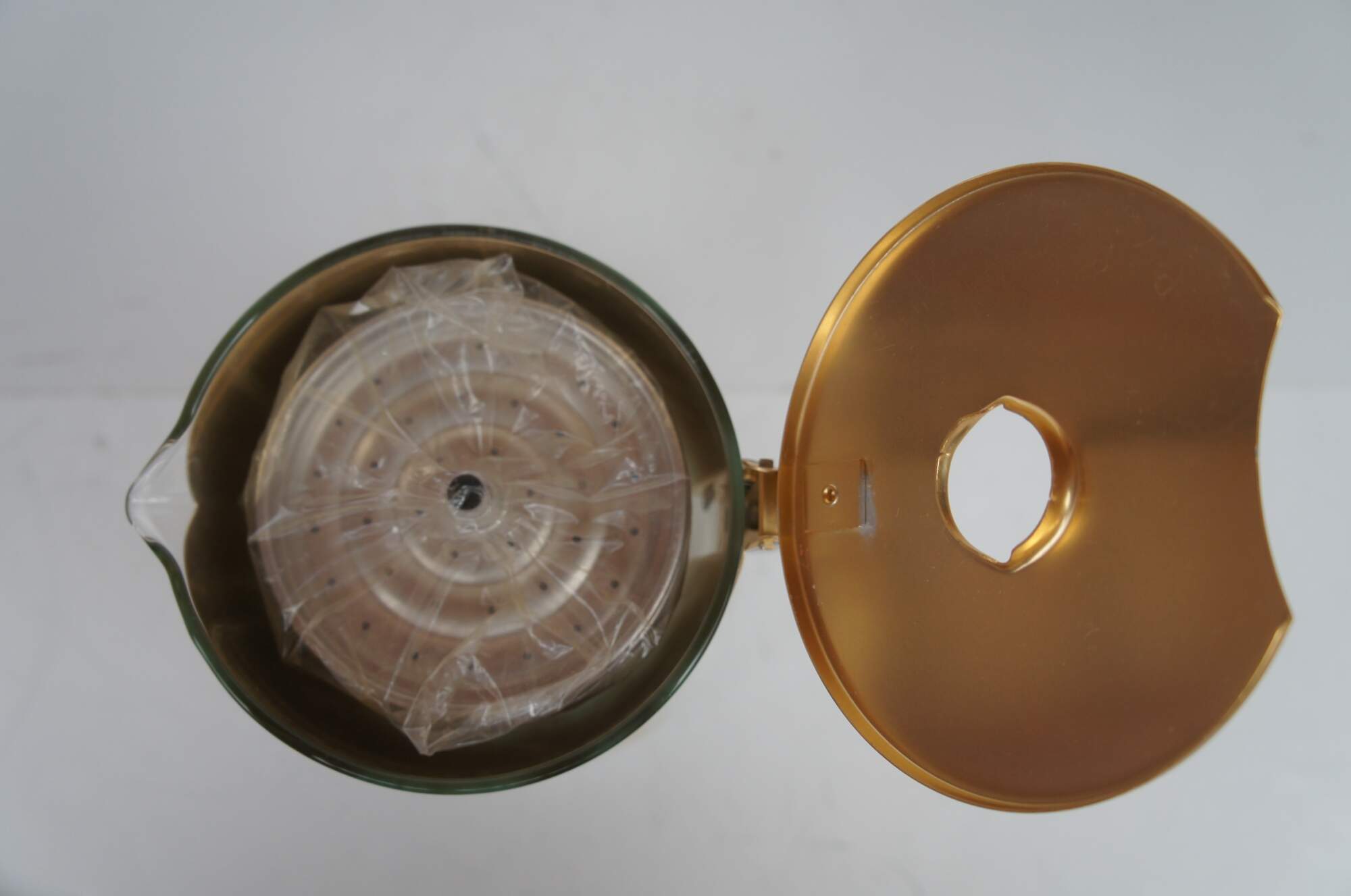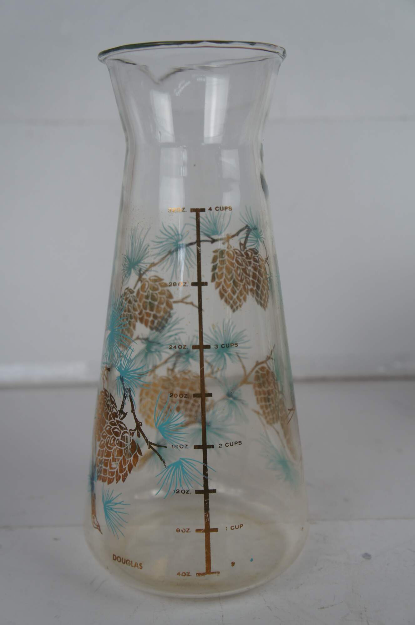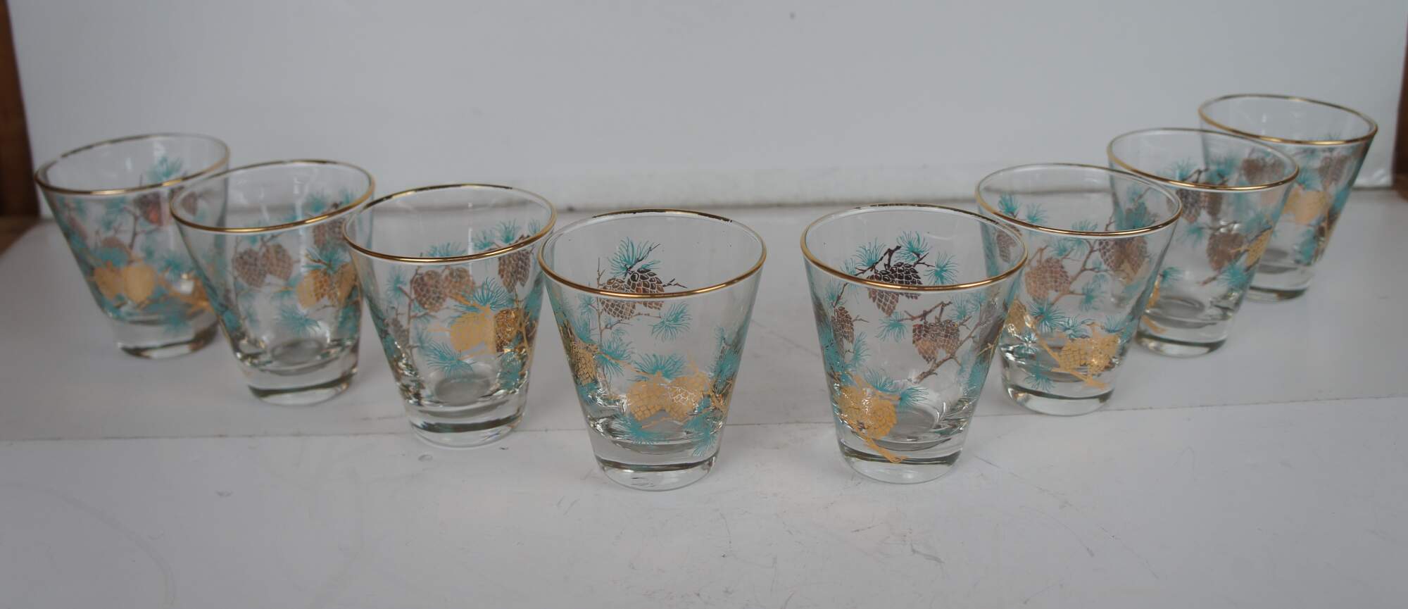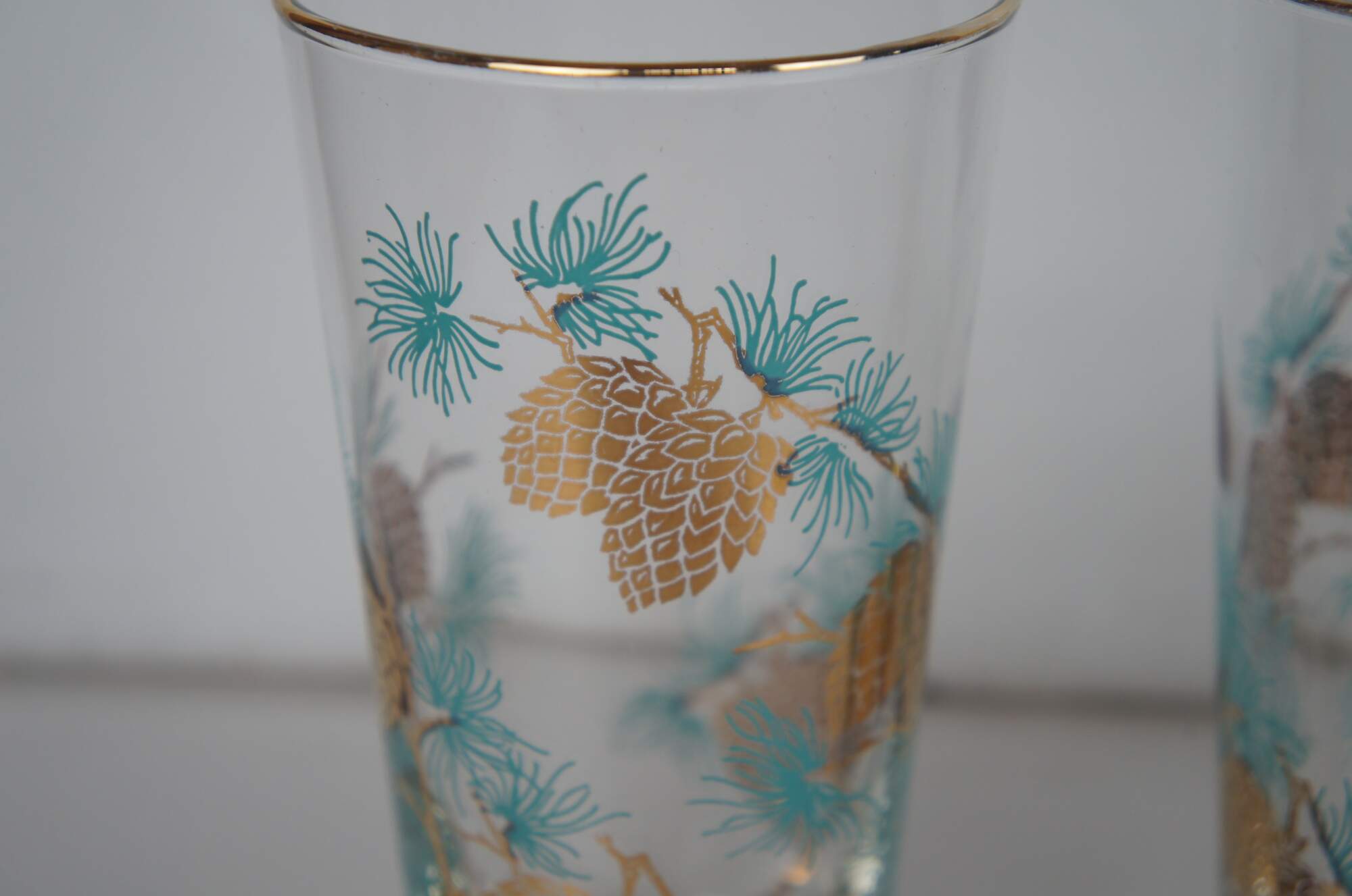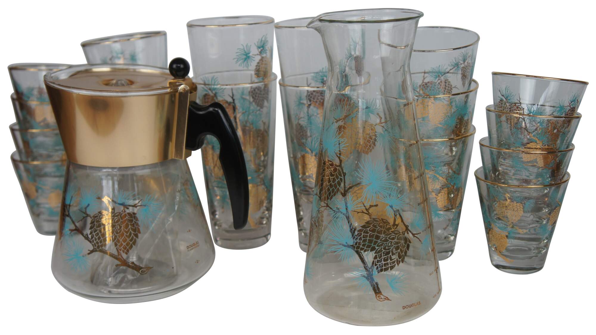 Mid century Libbey glass barware set by David Douglas featuring glasses in assorted sizes with a tea / coffee pot or percolator and pitcher decorated with aqua and gold pine cone and needle design.