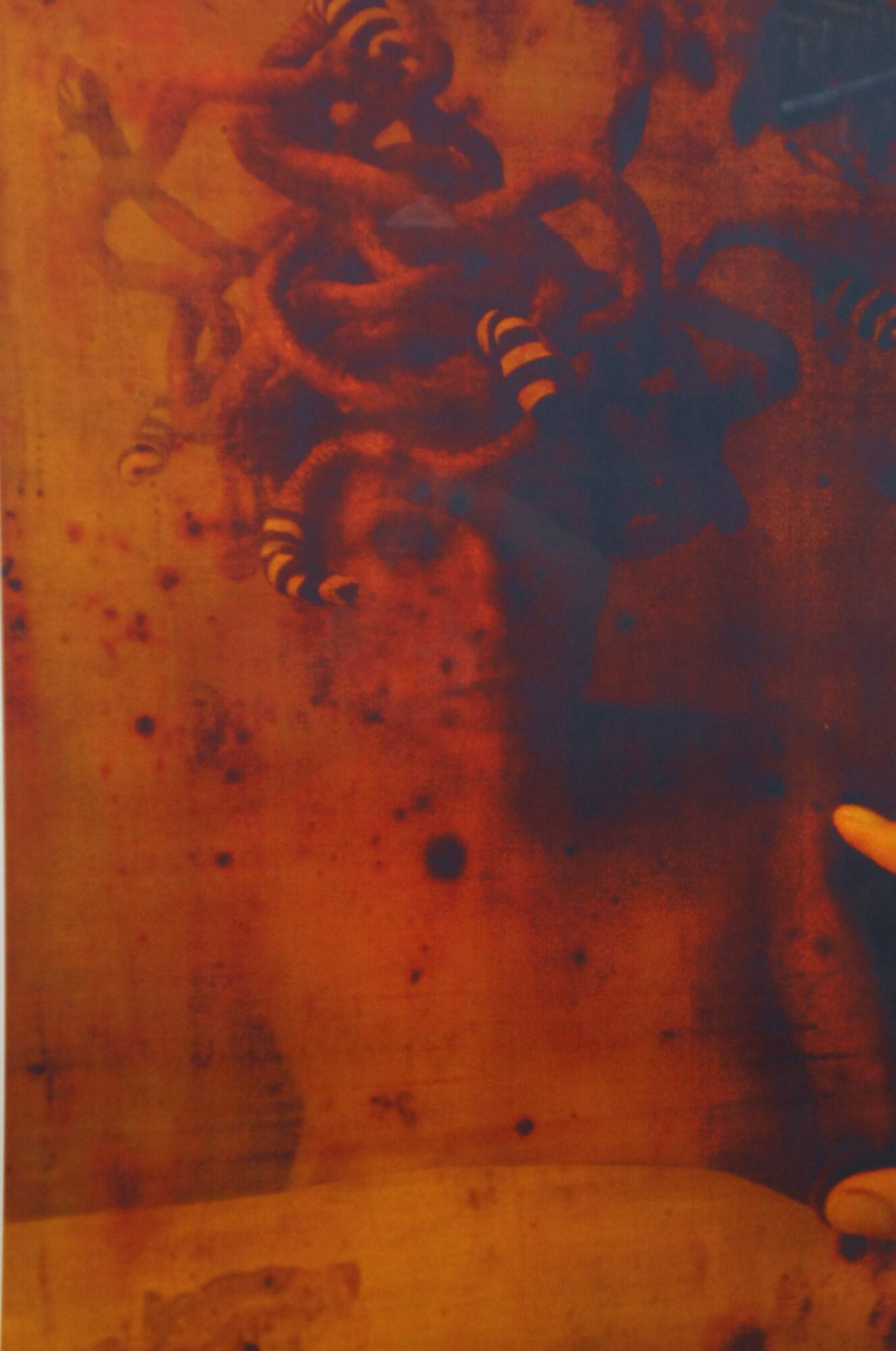 Set of three modern surrealist double exposure prints in shade of orange and red, showing a female figure with Medusa-like serpentine hair accented with peculiar ring-tailed segments.