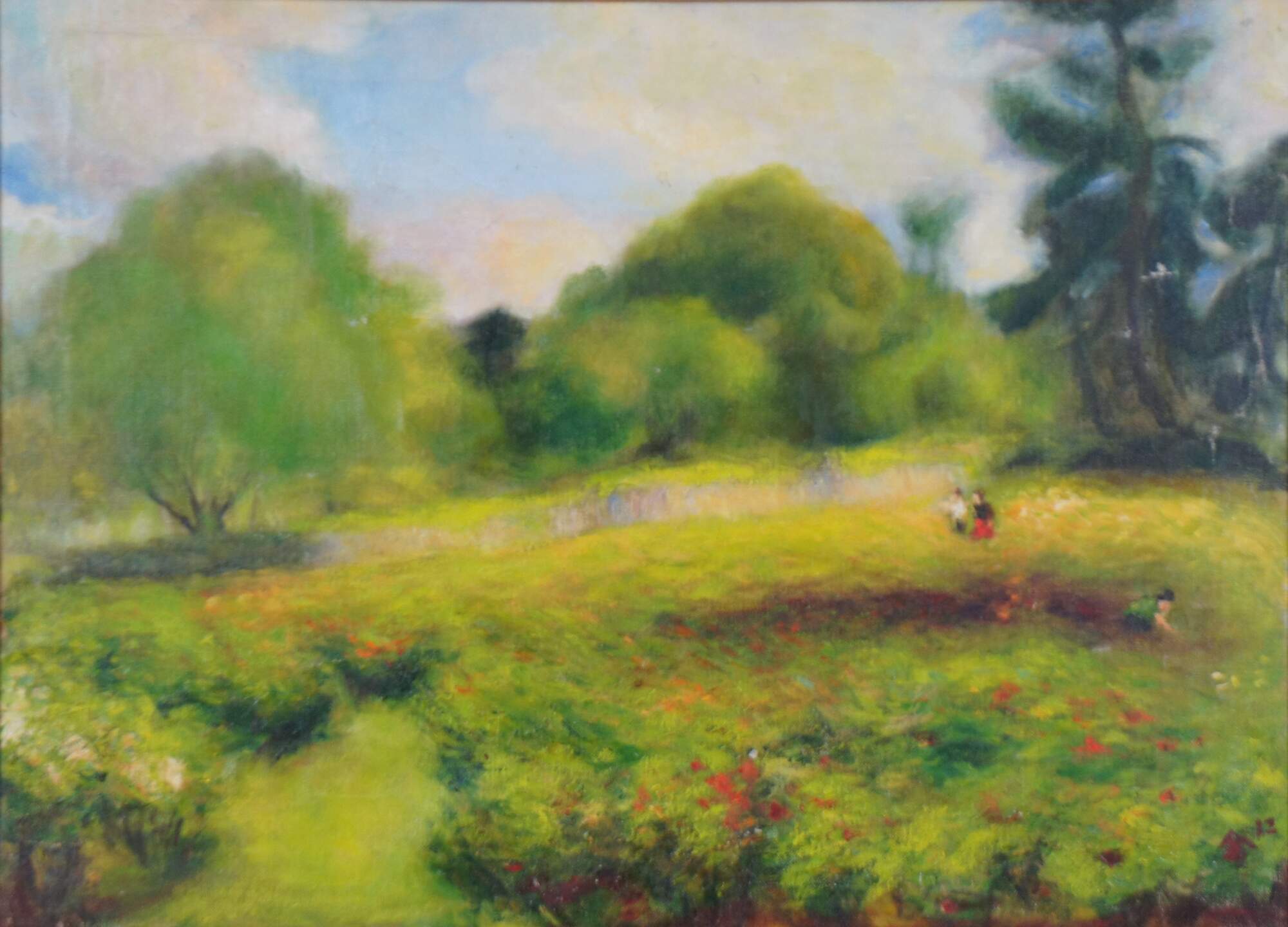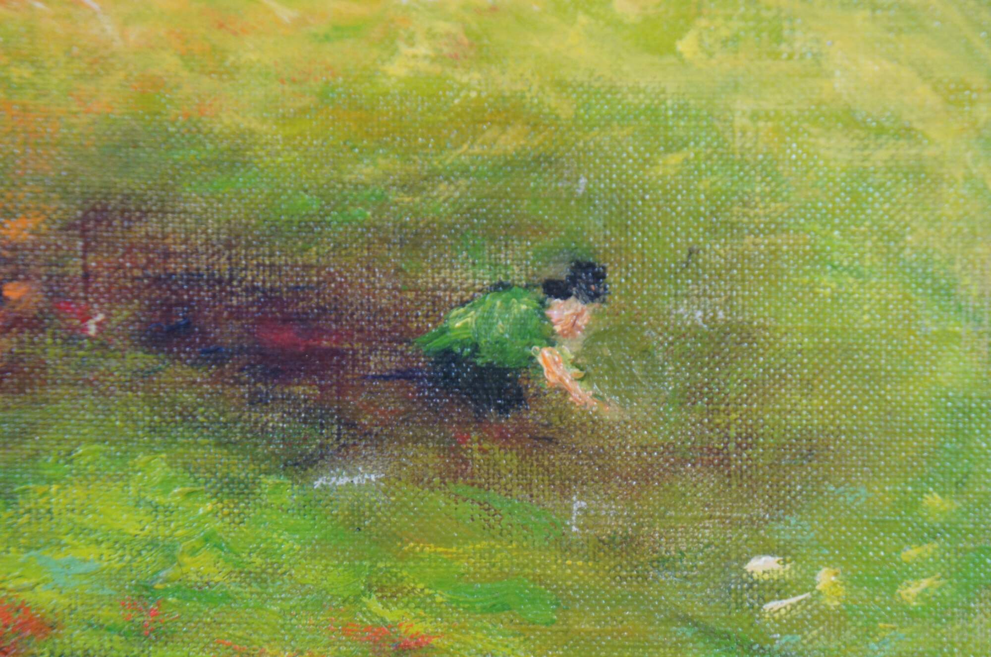 Rare and vintage 1982 Korean Chun Hwa Hwang impressionist oil painting on canvas featuring a lucious green landscape of trees and flowers with a pond and three figures.