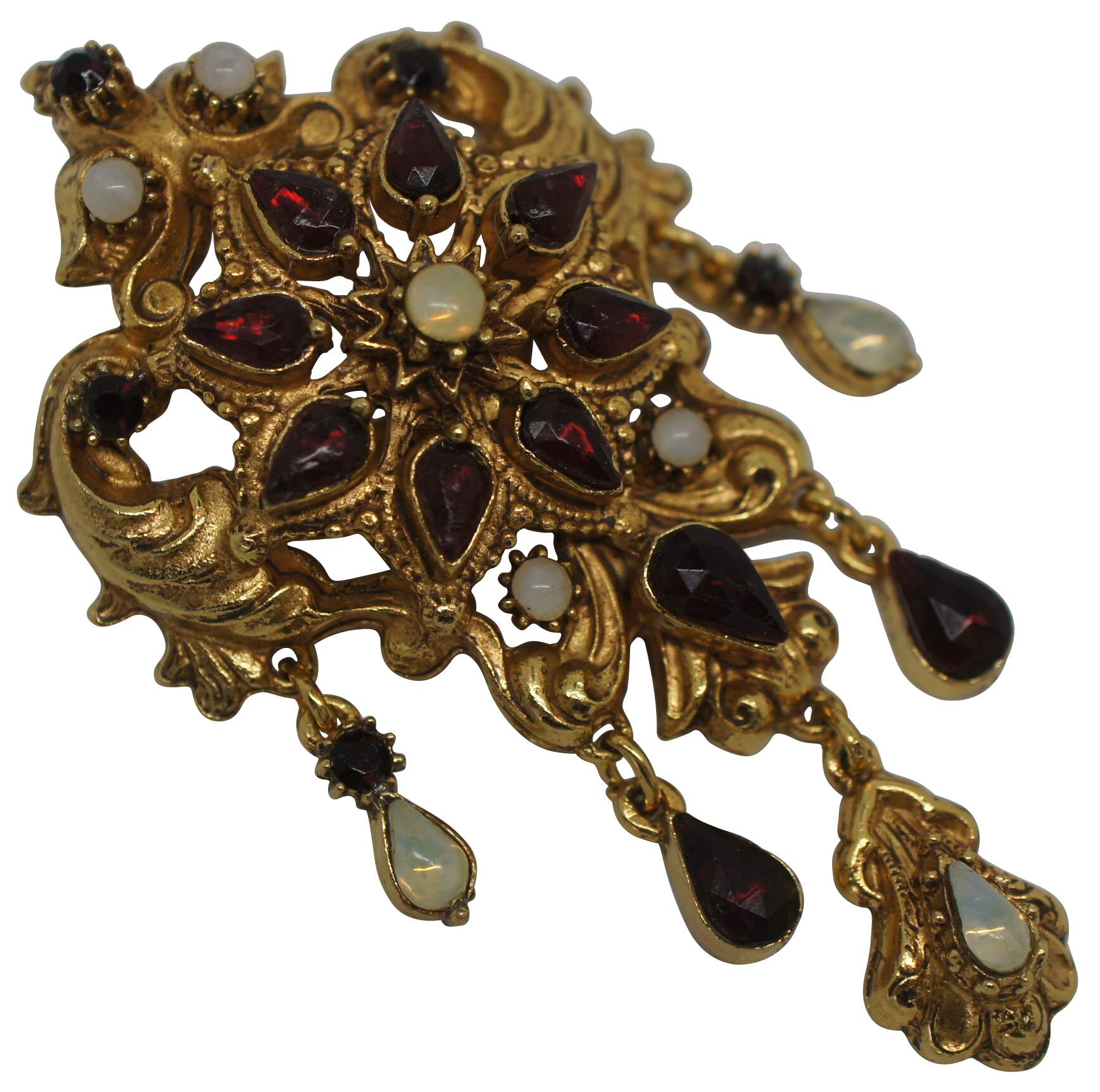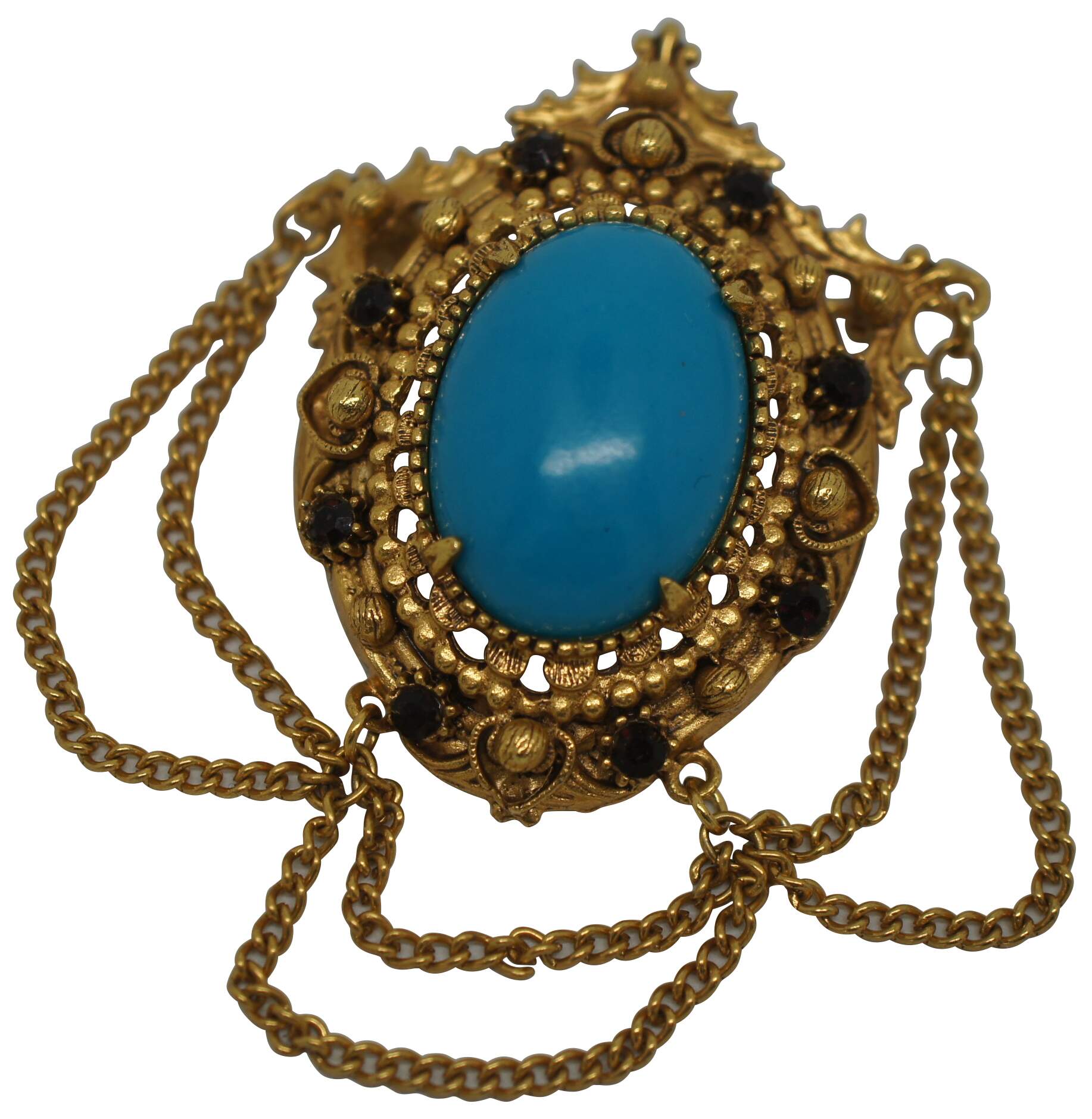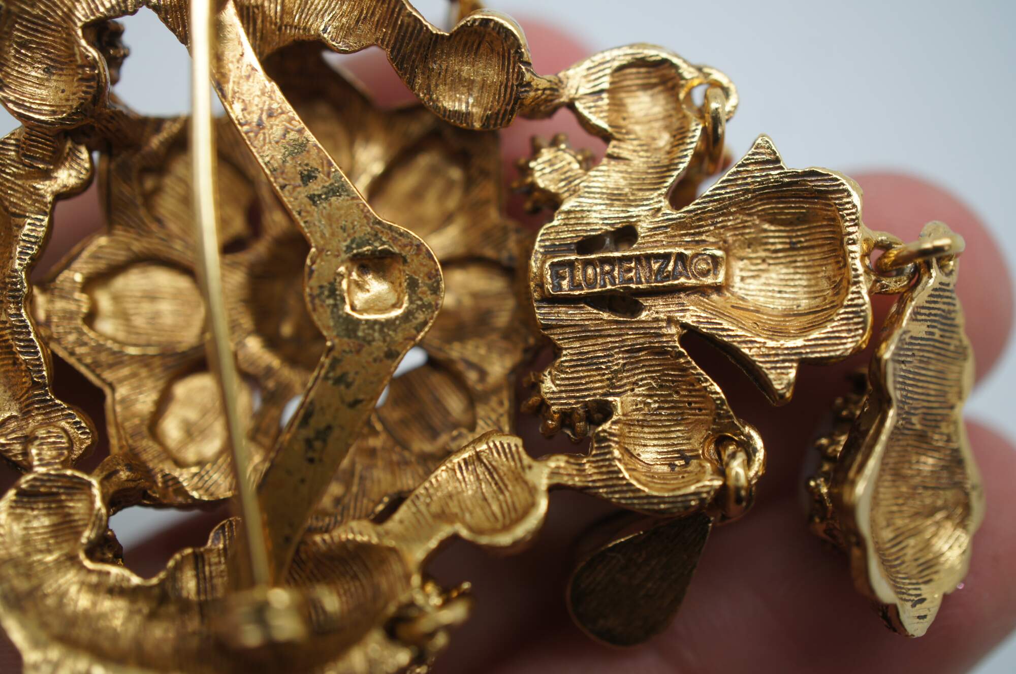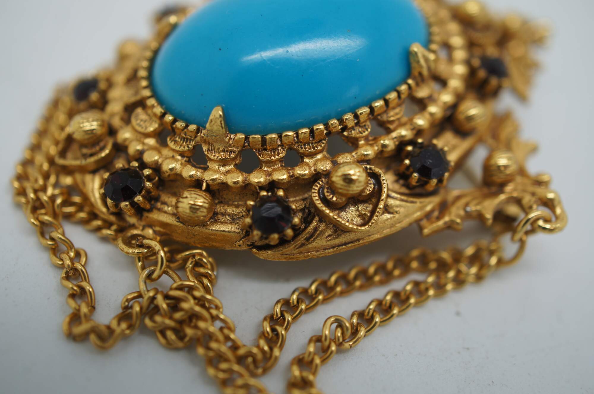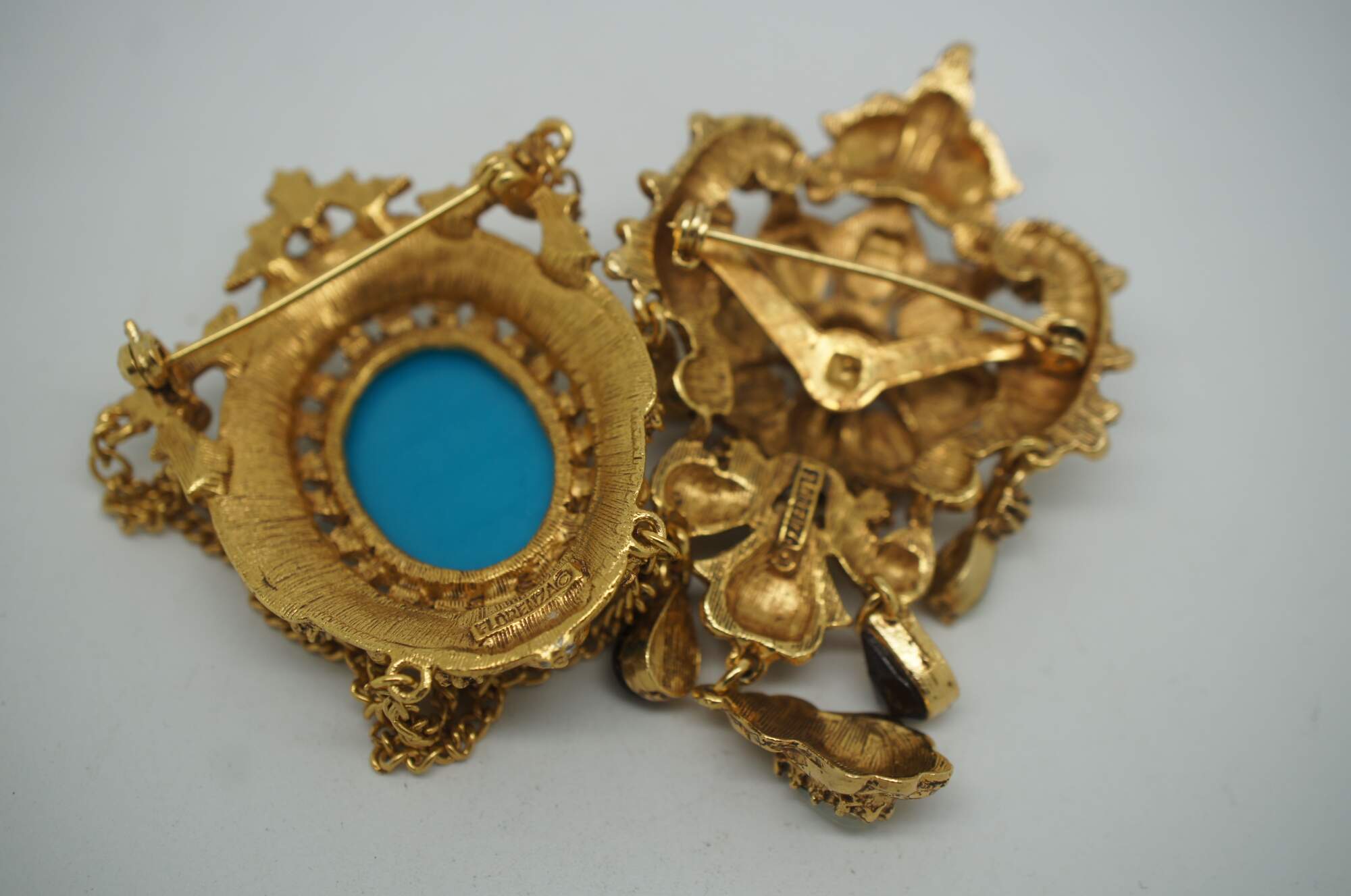 Pair of ornate vintage Florenza pins, one with swag chains featuring a large turquoise stone surrounded by red rhinestones, the other featuring a star shaped flower of red rhinestones and faux opal drops.