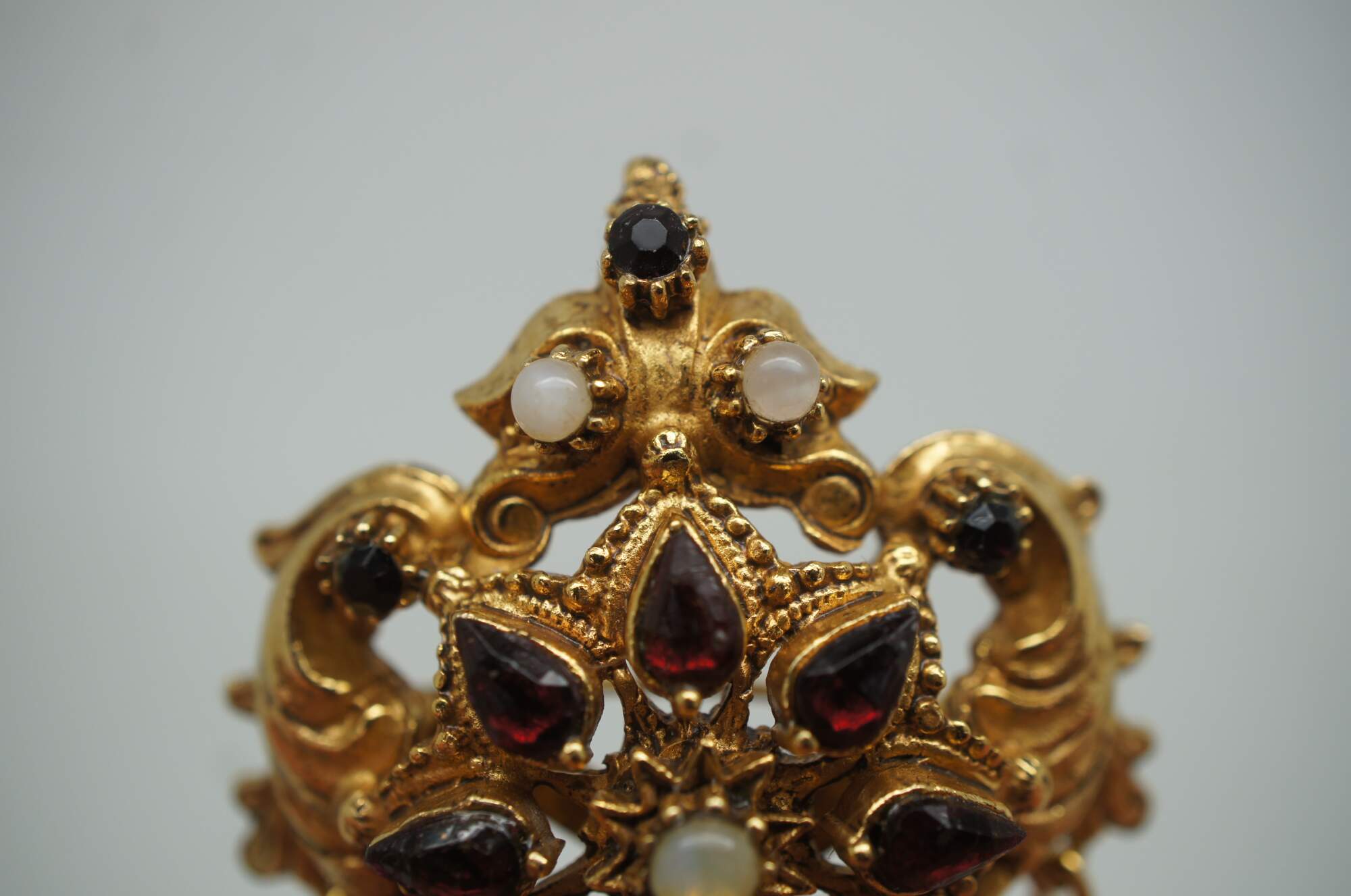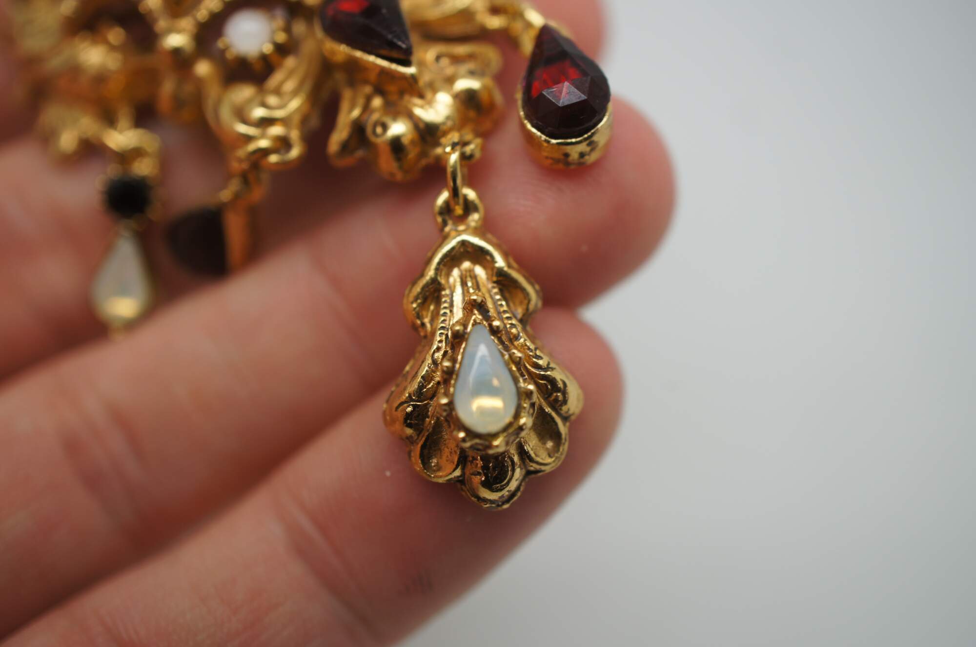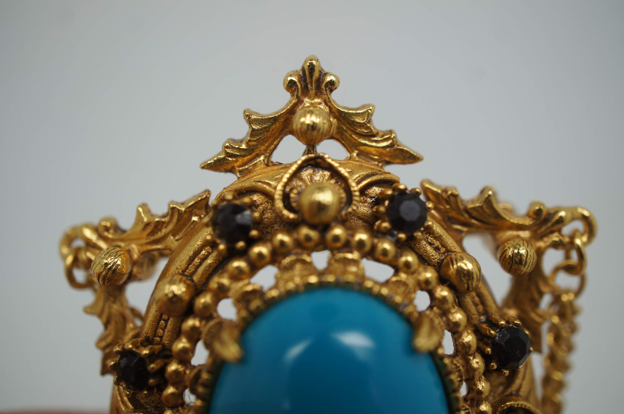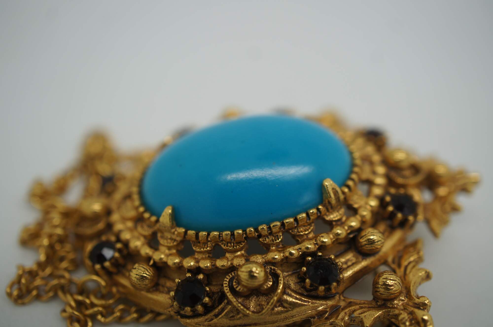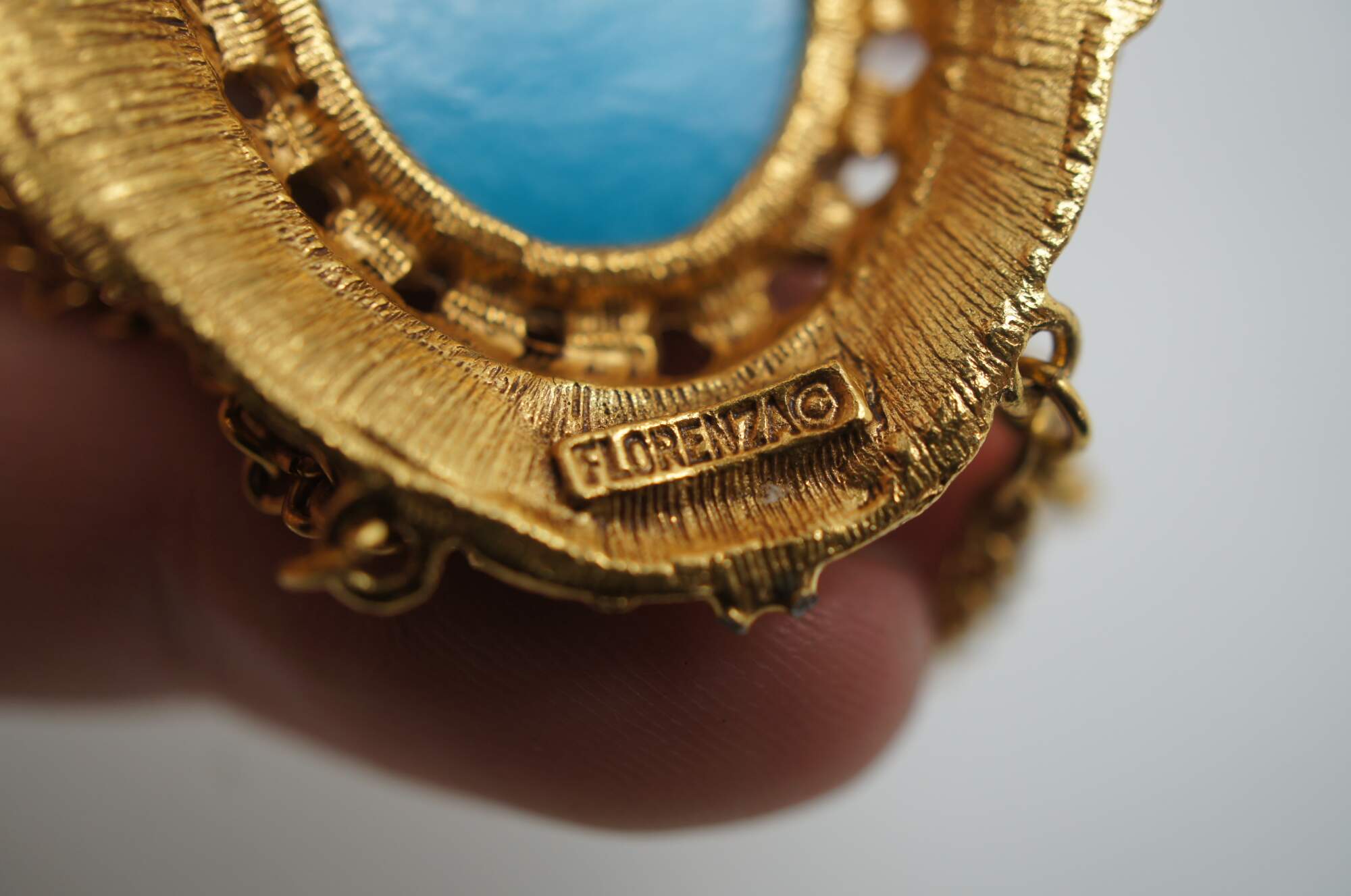 Pair of ornate vintage Florenza pins, one with swag chains featuring a large turquoise stone surrounded by red rhinestones, the other featuring a star shaped flower of red rhinestones and faux opal drops.