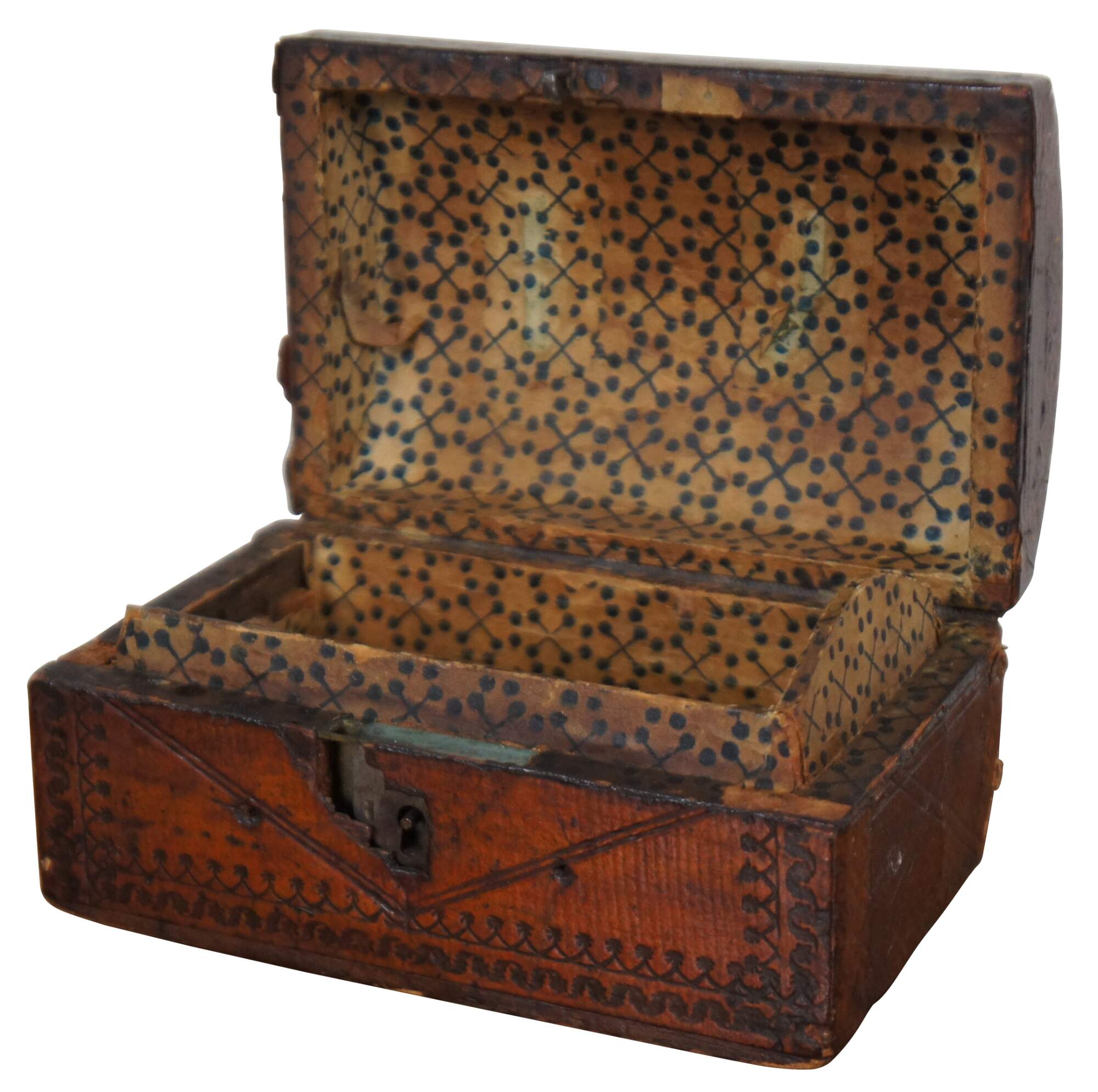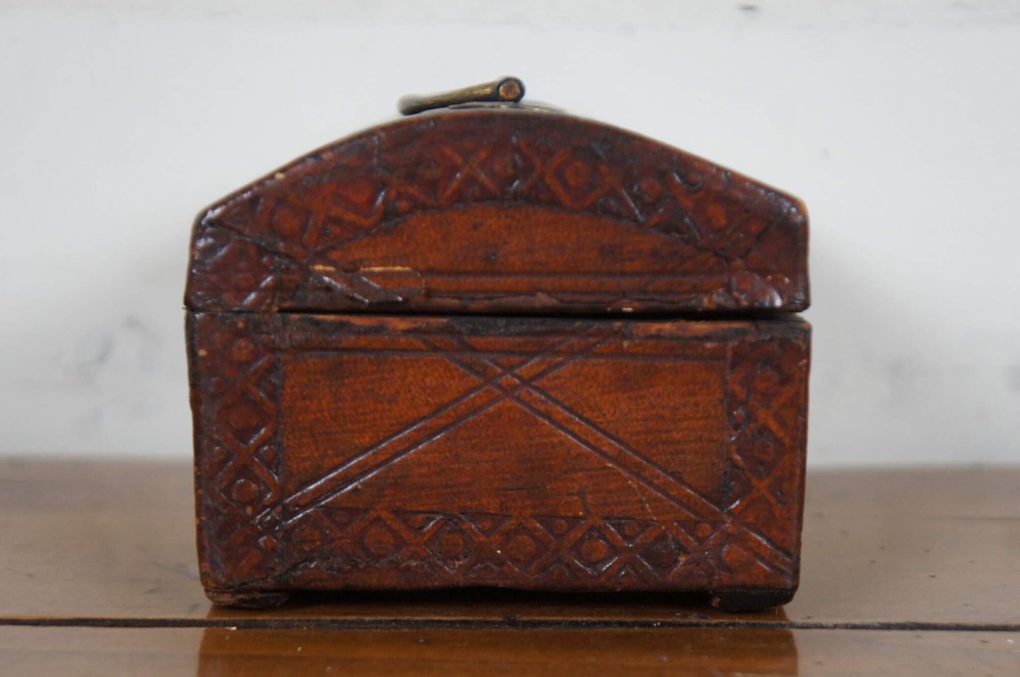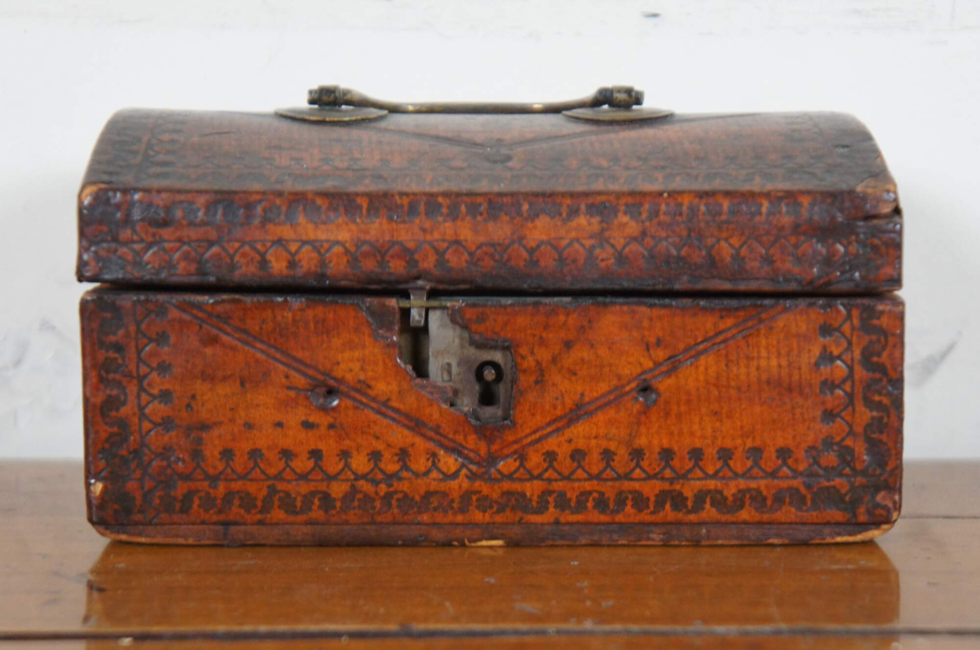 Antique 18th century tooled leather document dispatch box / camp chest, lock box / casket / coffer featuring domed rectangular form with geometric repeating accents, brass handle and paper lined interior. These boxes were used in the American Revolutionary War era by soldiers to store personal effects at army camps and for sending documents. This chest came from a prominent military family with multiple officers participating in wars throughout the 18th and 19th centuries. These boxes are now commonly used for storage of jewelry or trinkets.