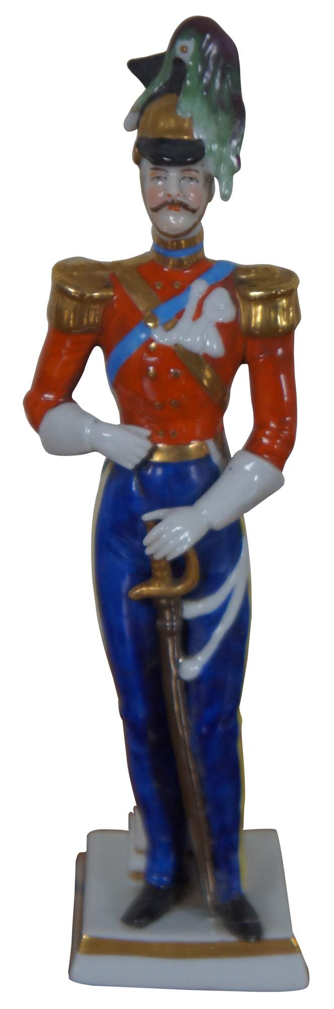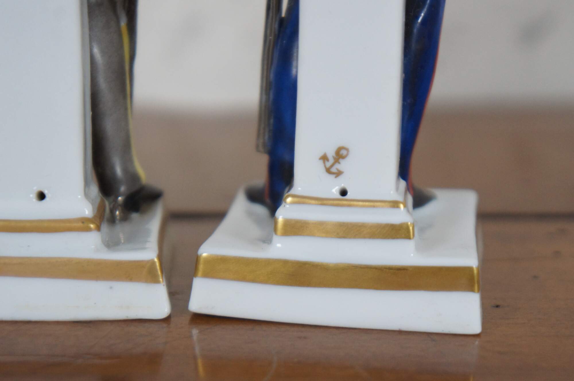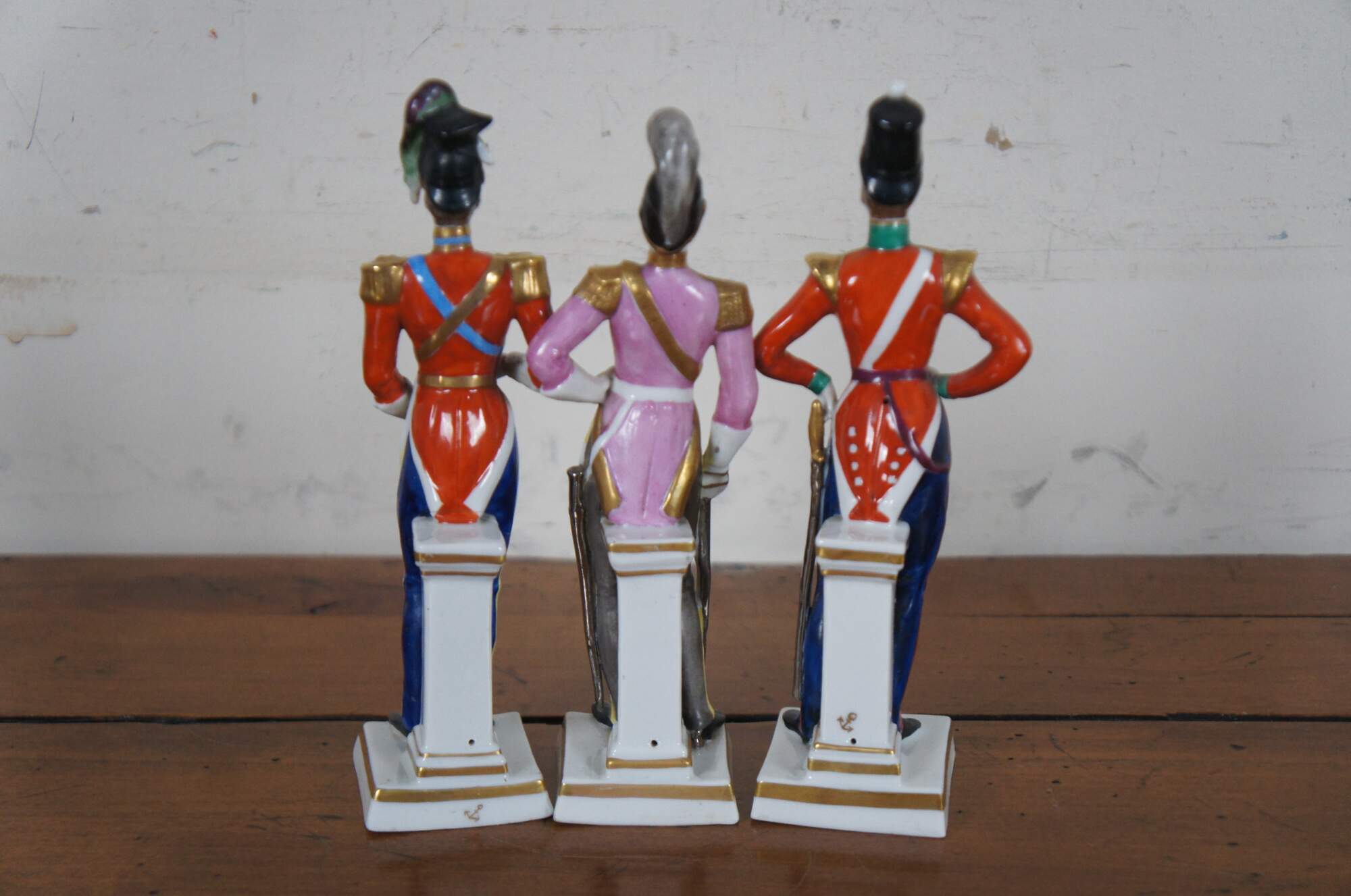 Set of three hand painted German porcelain soldier figurines standing against pillars, likely by A.J. Uffrecht & Company, marked with a gold anchor on the back and “Germany” with a five point crown over an N on the base.