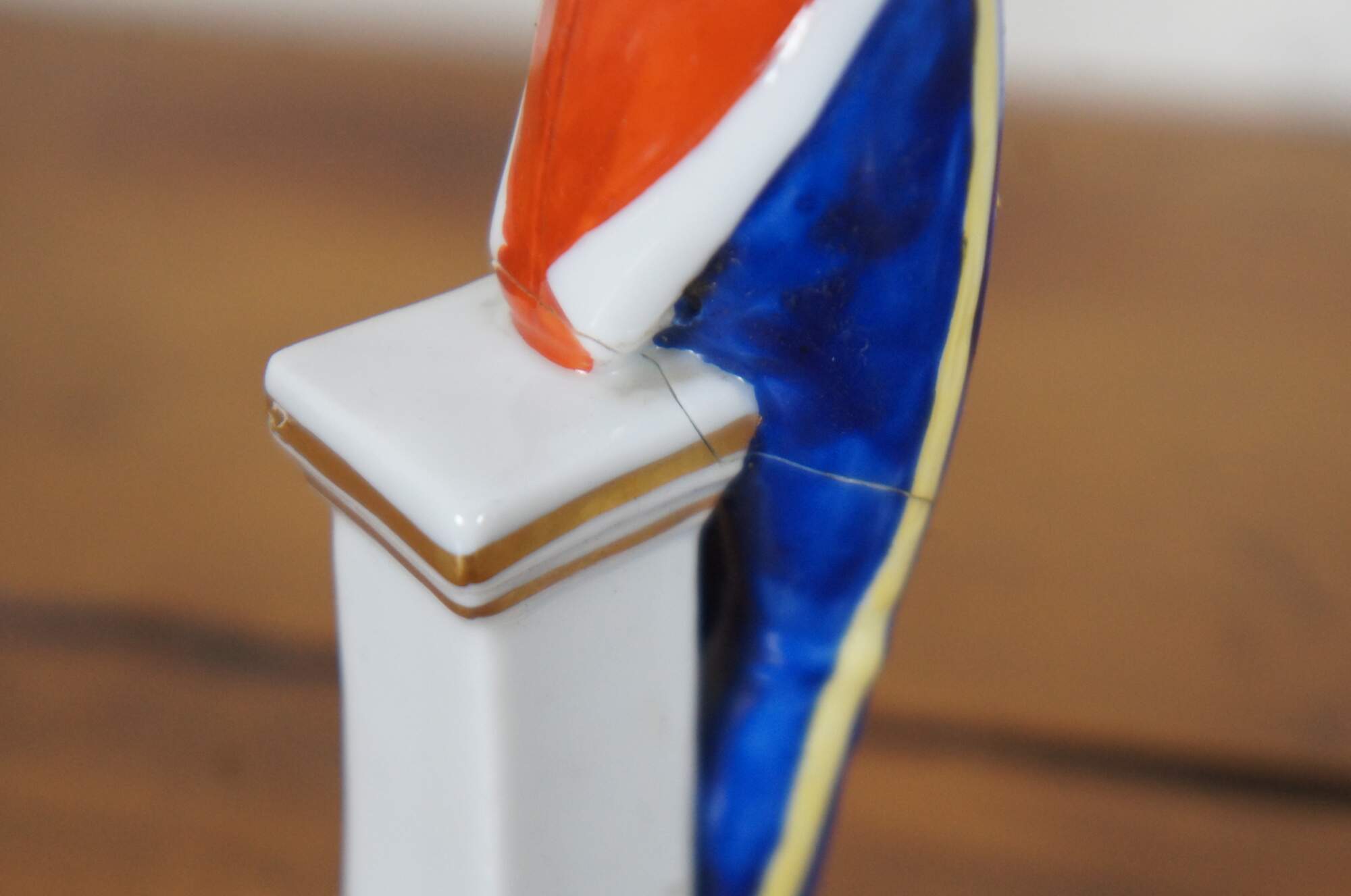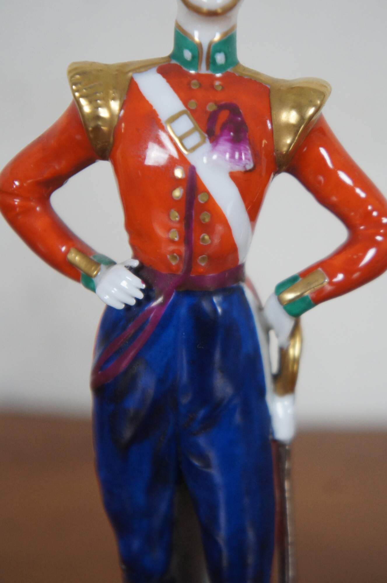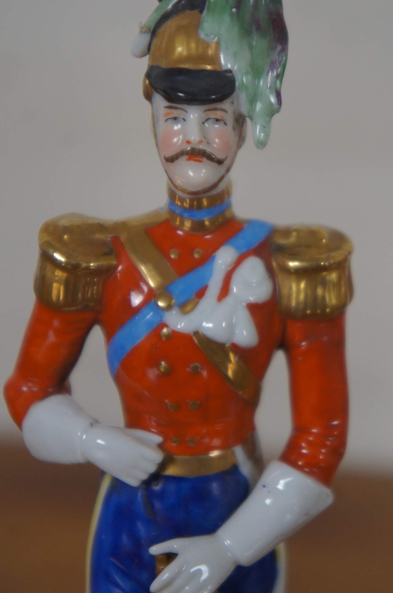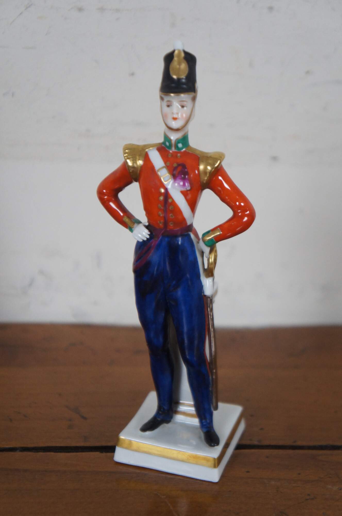 Set of three hand painted German porcelain soldier figurines standing against pillars, likely by A.J. Uffrecht & Company, marked with a gold anchor on the back and “Germany” with a five point crown over an N on the base.