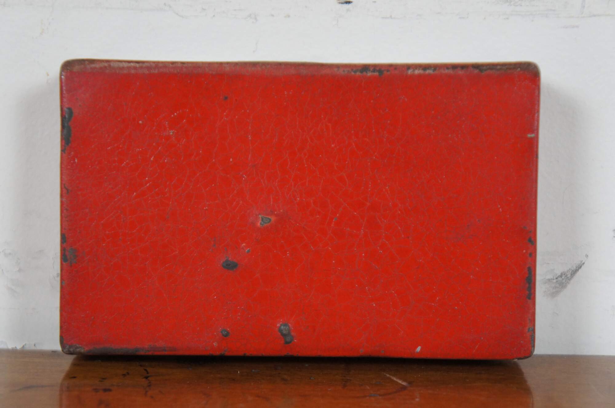 Rare antique metal tin tobacco cigar or cigarette box painted in red with an intricate scene on the lid of Napoleon Bonaparte surveying a map, with a white horse and soldiers at the ready.