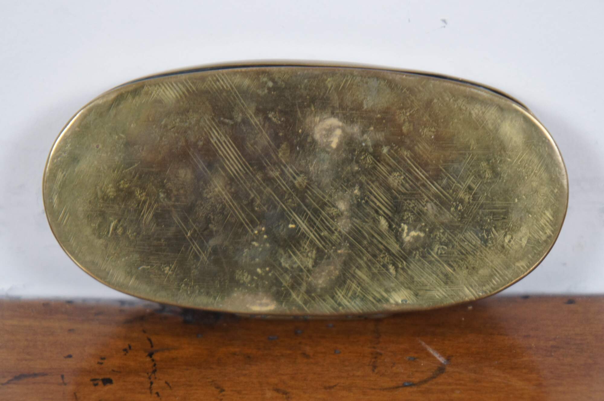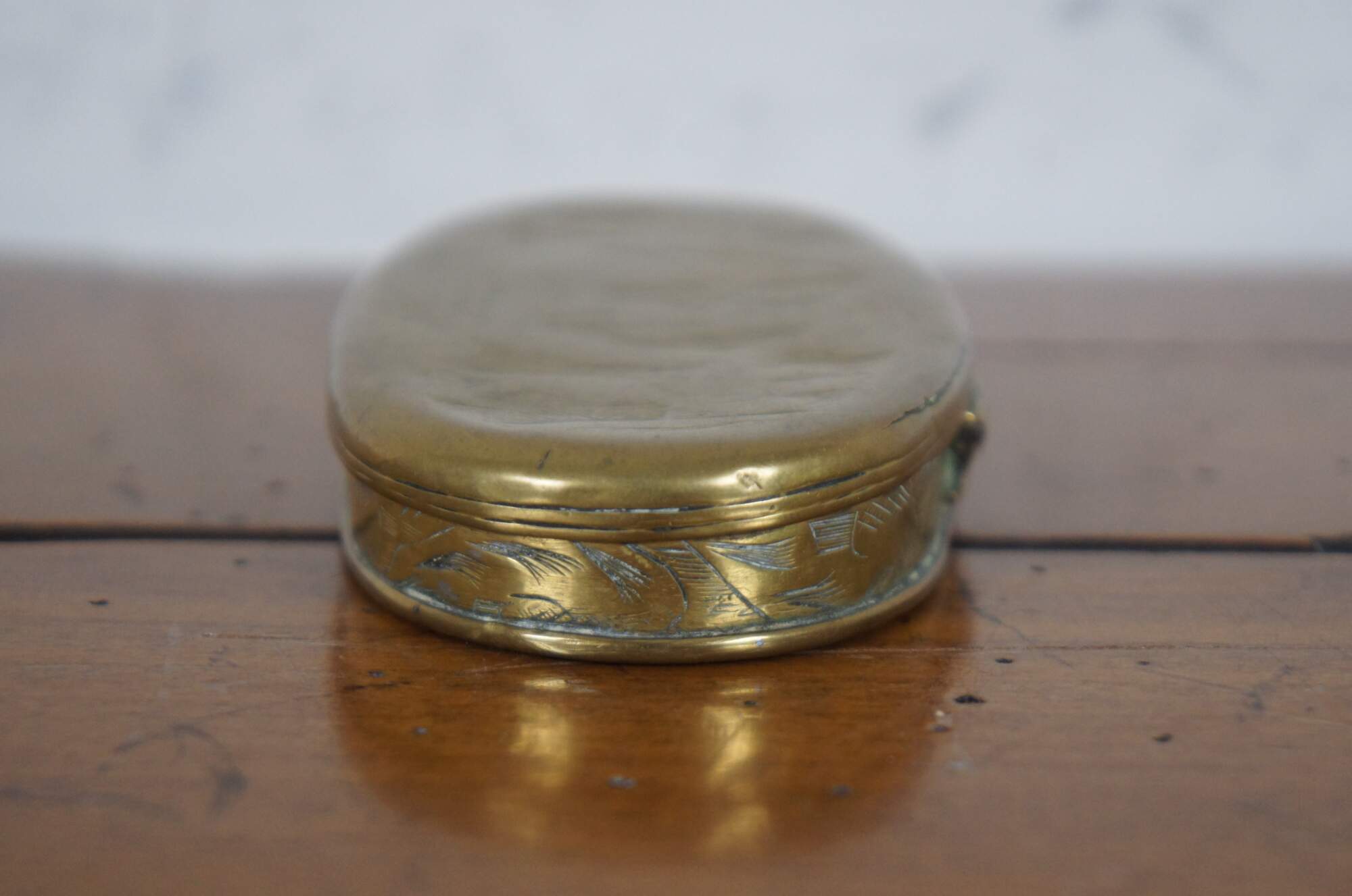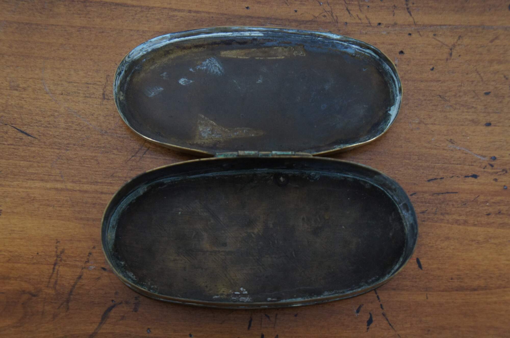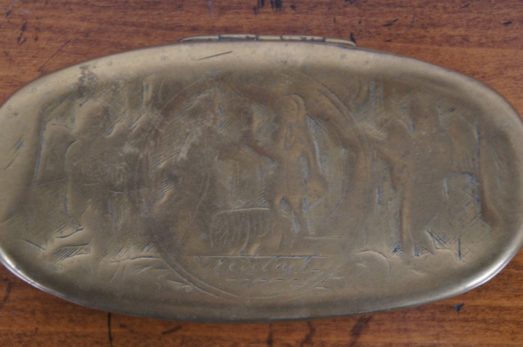 Antique Dutch 18th century oval shaped brass tobacco snuff box with hinged lid, engraved with a low relief pattern of two figures flanked by angels.