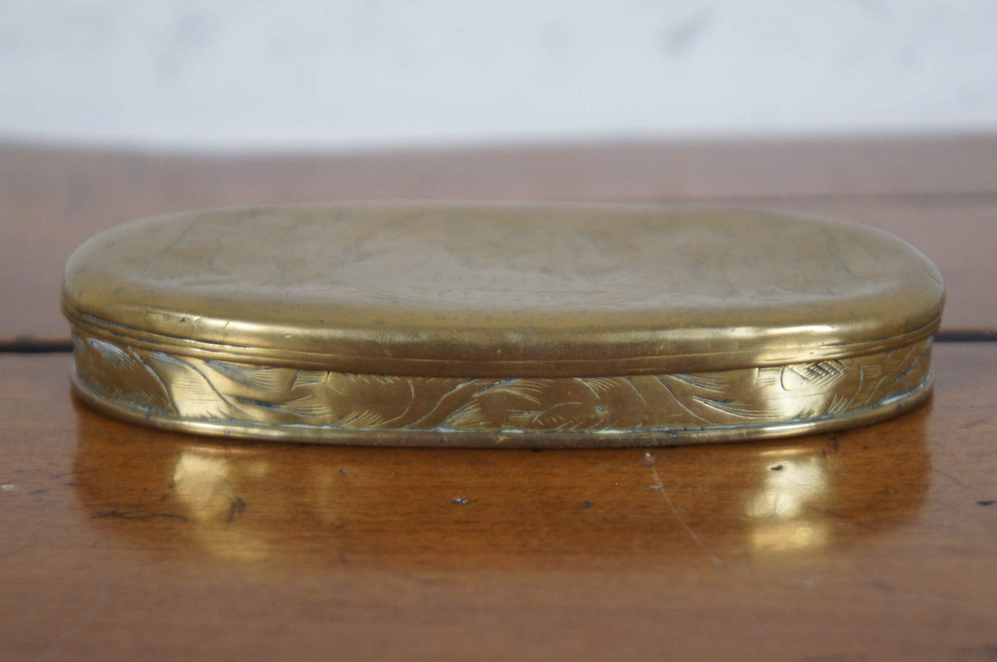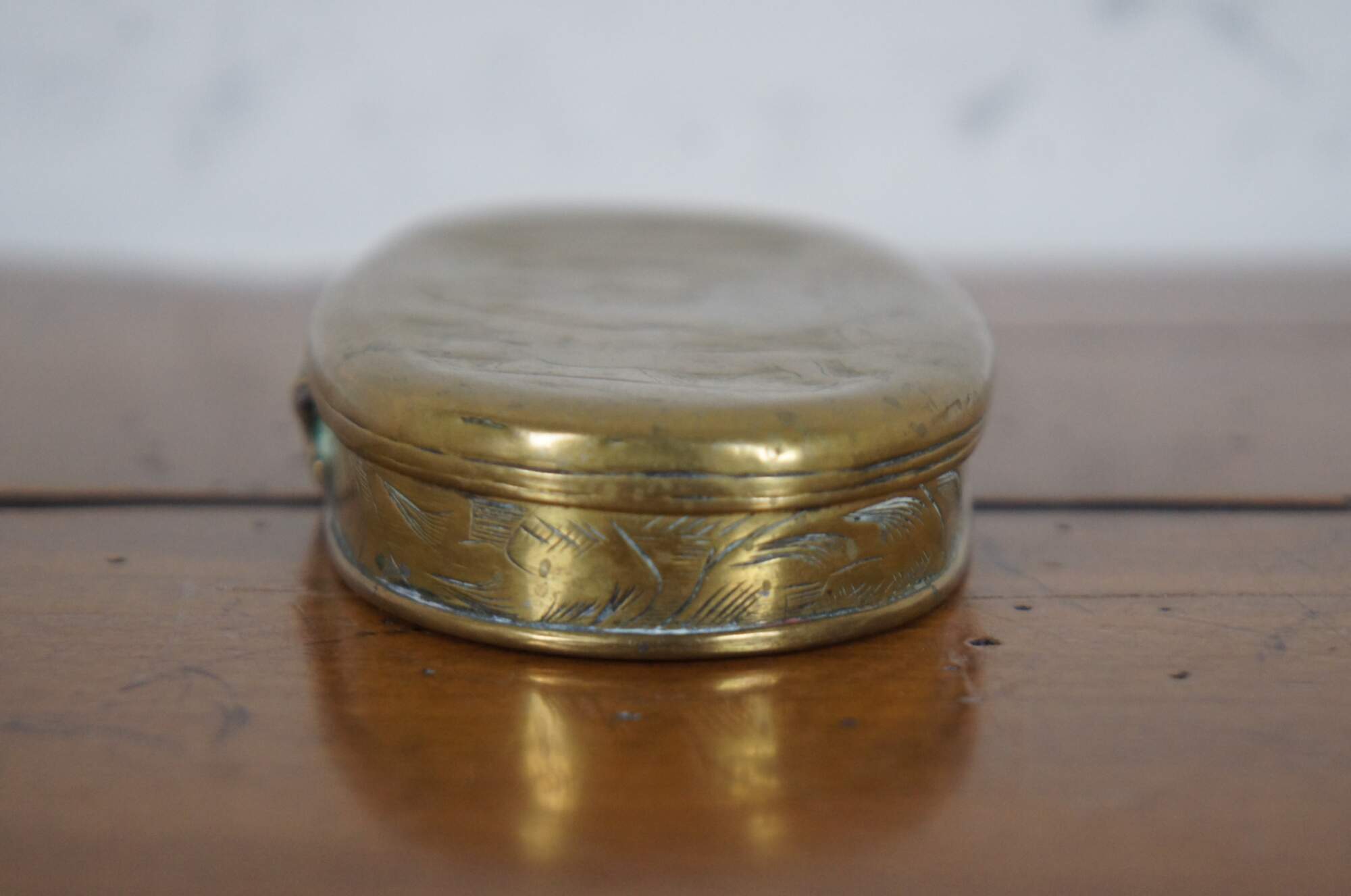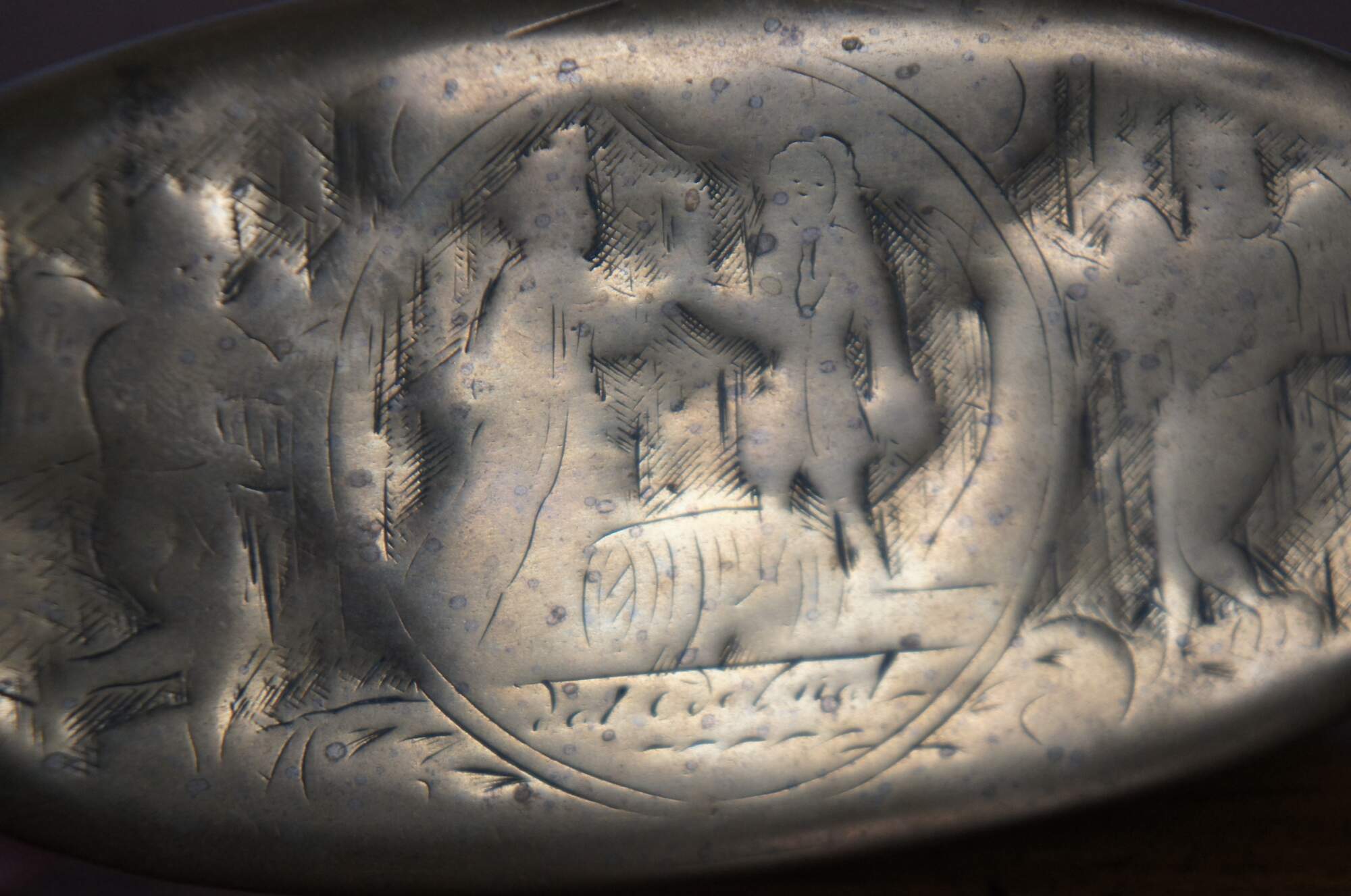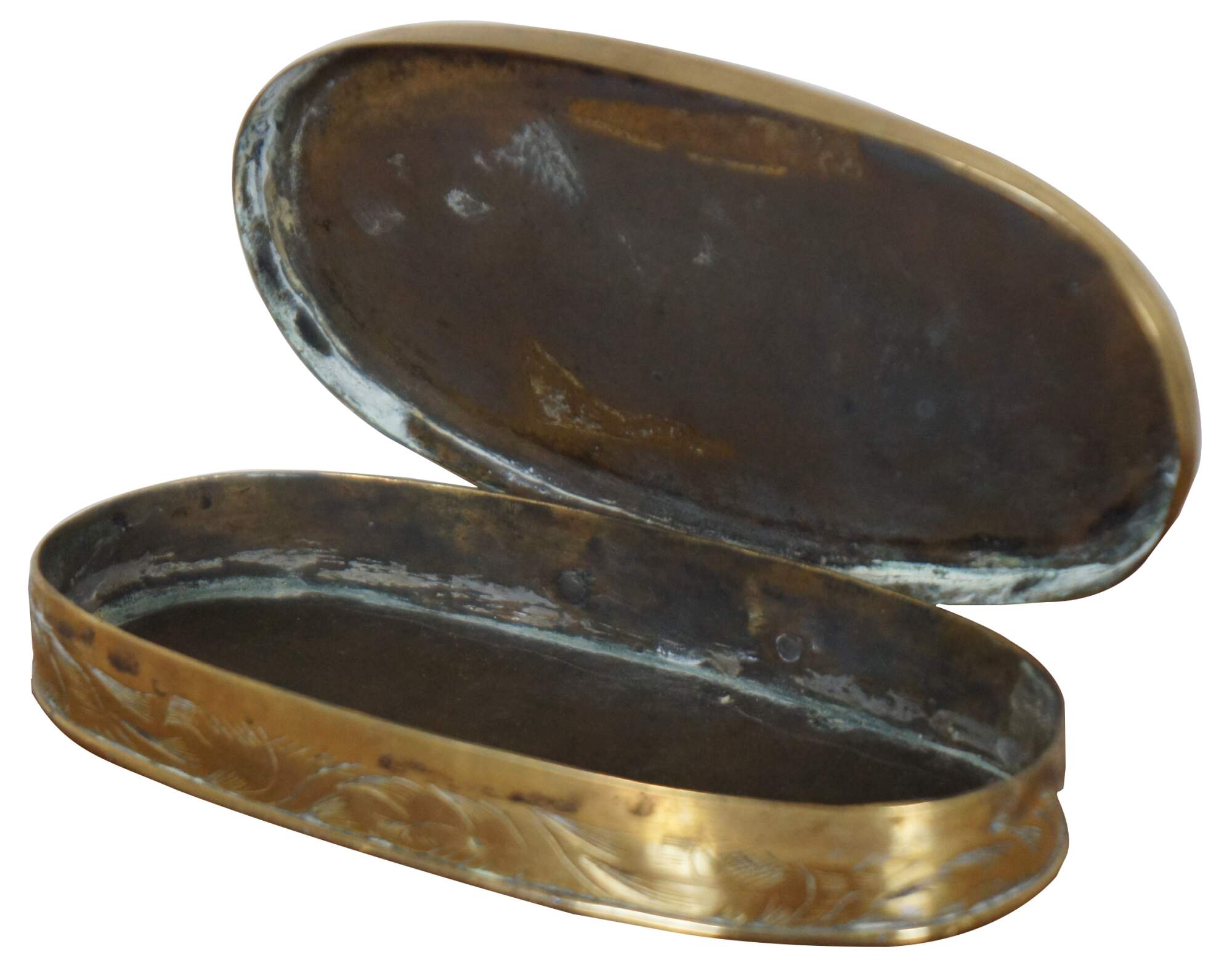 Antique Dutch 18th century oval shaped brass tobacco snuff box with hinged lid, engraved with a low relief pattern of two figures flanked by angels.