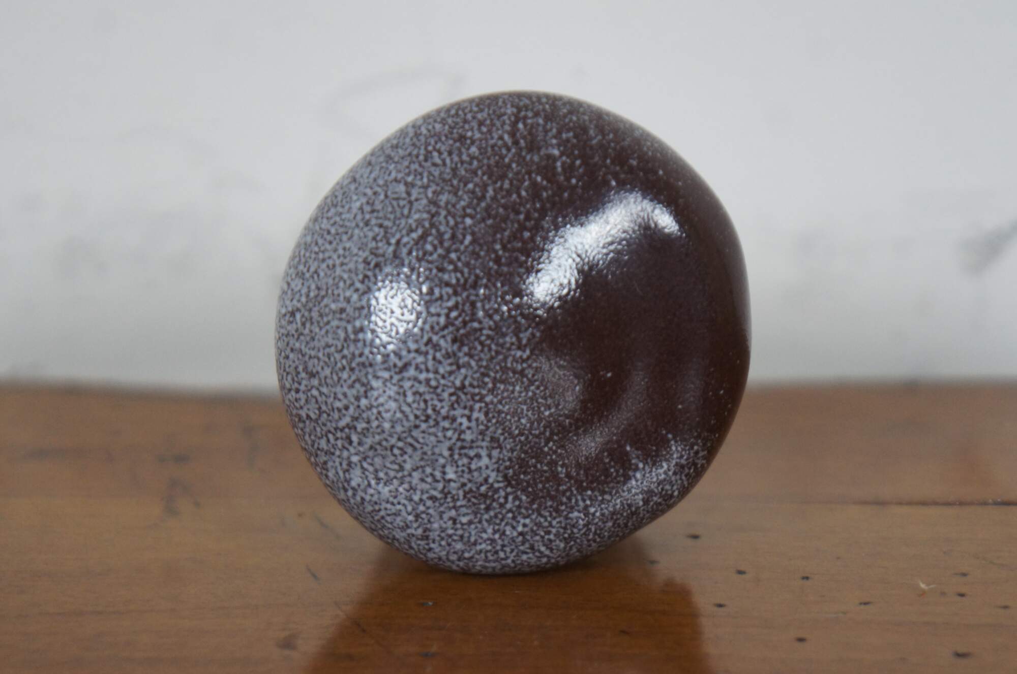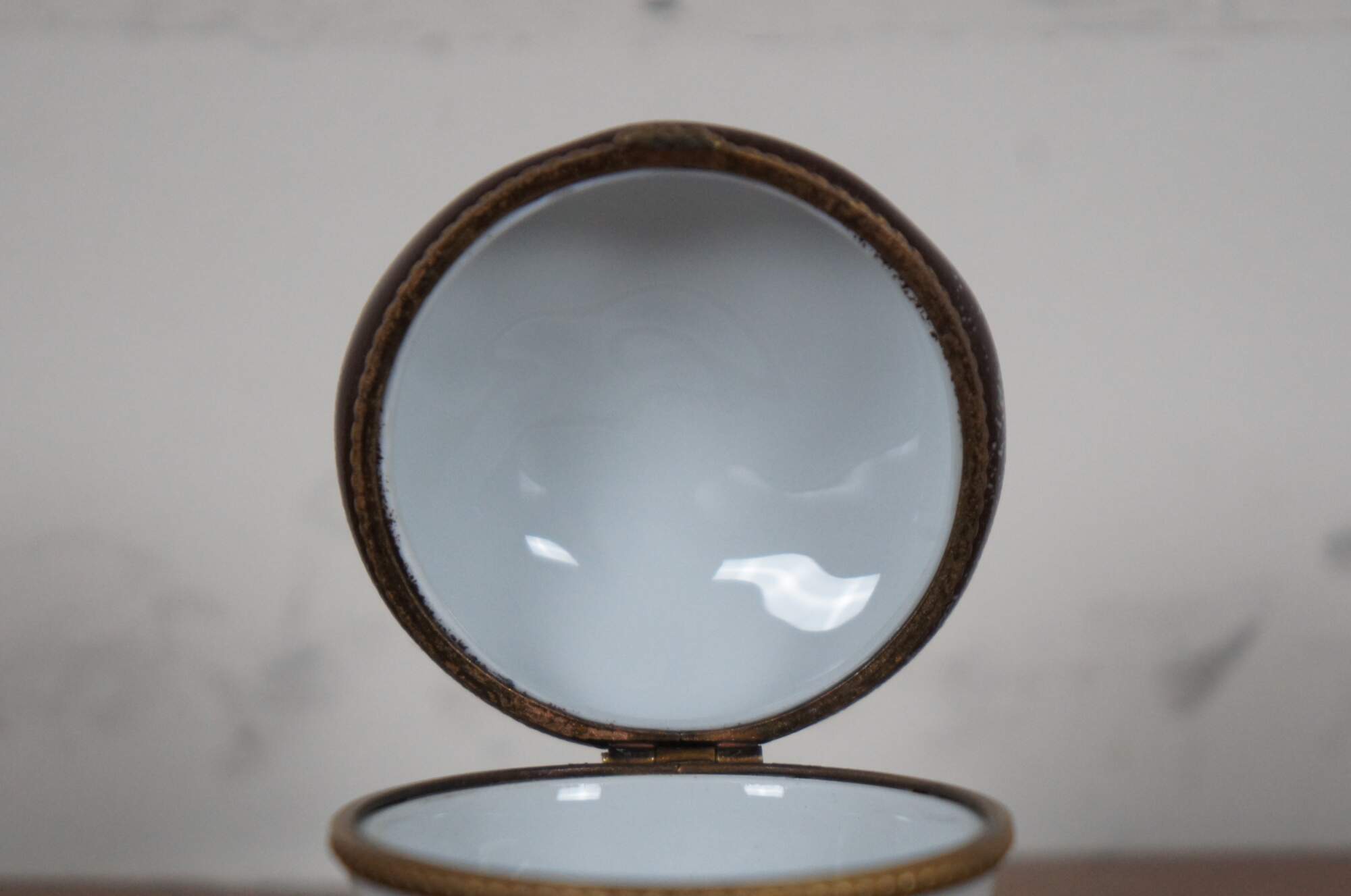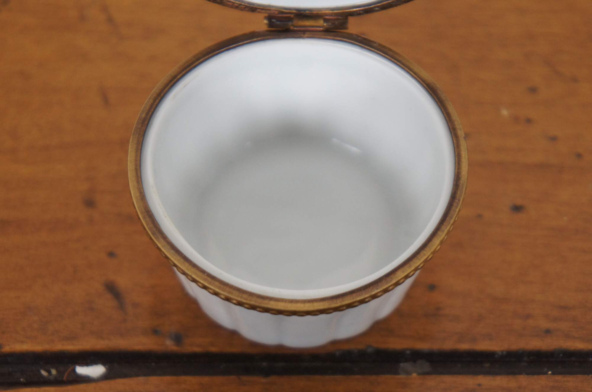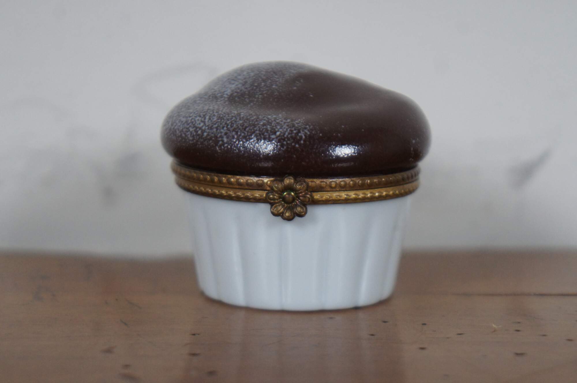 Vintage Peint Main Eximious Limoges France porcelain trinket box in the shape of a chocolate souffle or cupcake in white paper with a chocolate iced top sprinkled with powered sugar.