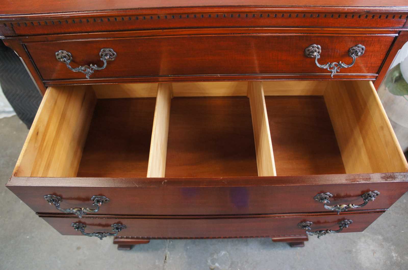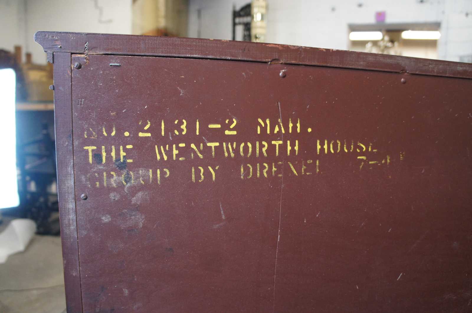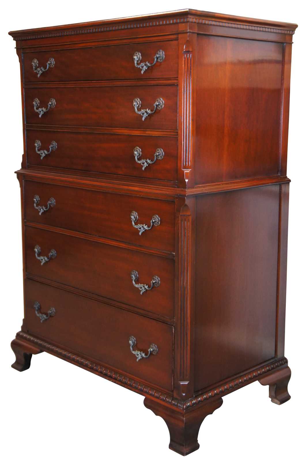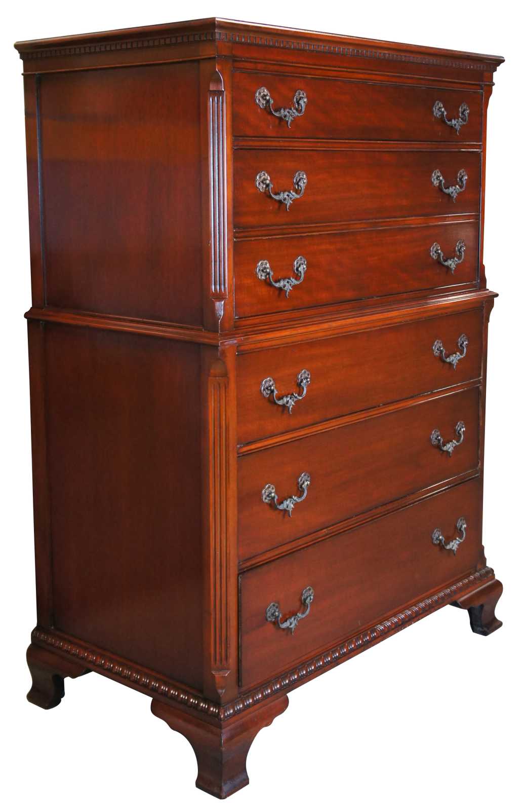 The Wentworth House Group Mid century chest of six drawers by Drexel Furniture. Made of mahogany featuring rectangular form with a chest on chest style design accented with fluted stiles terminating into rams tongues. Upper molding is highlighted by dentil carving while lower molding shows gadrooning. Includes ornate brass drawer pulls and bracket feet. No. 2131-2, Circa 1940s.