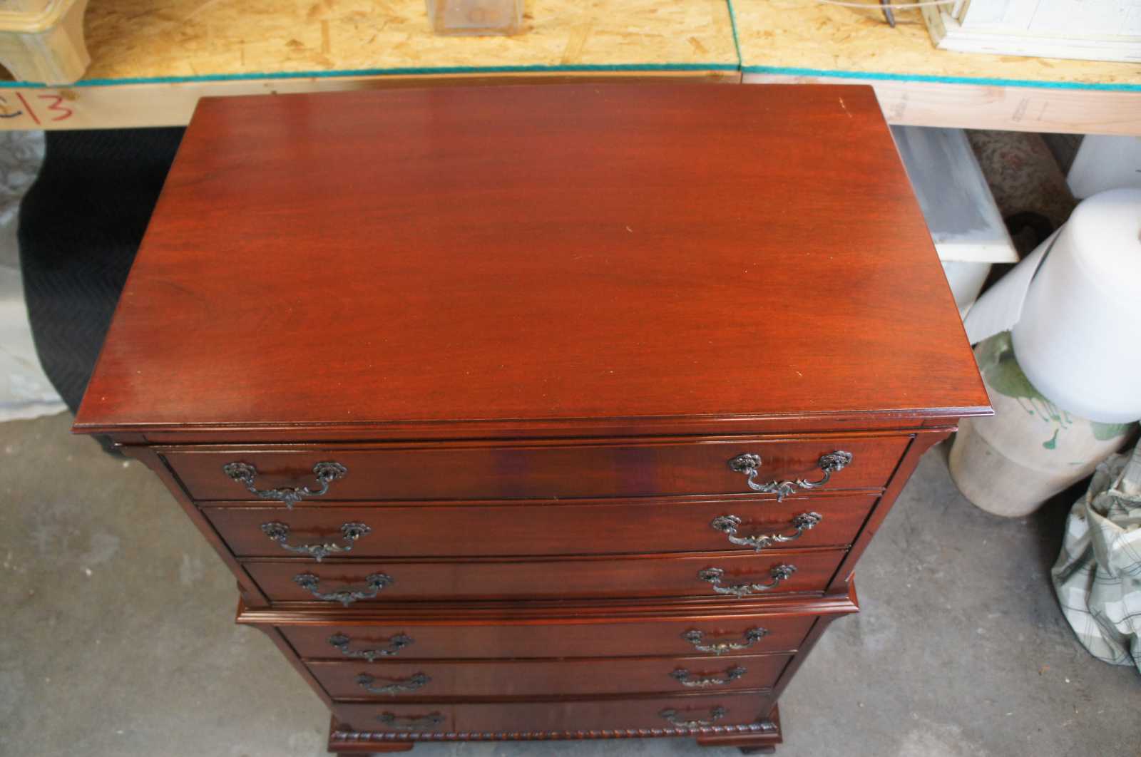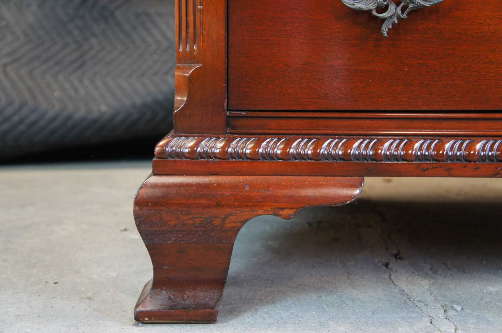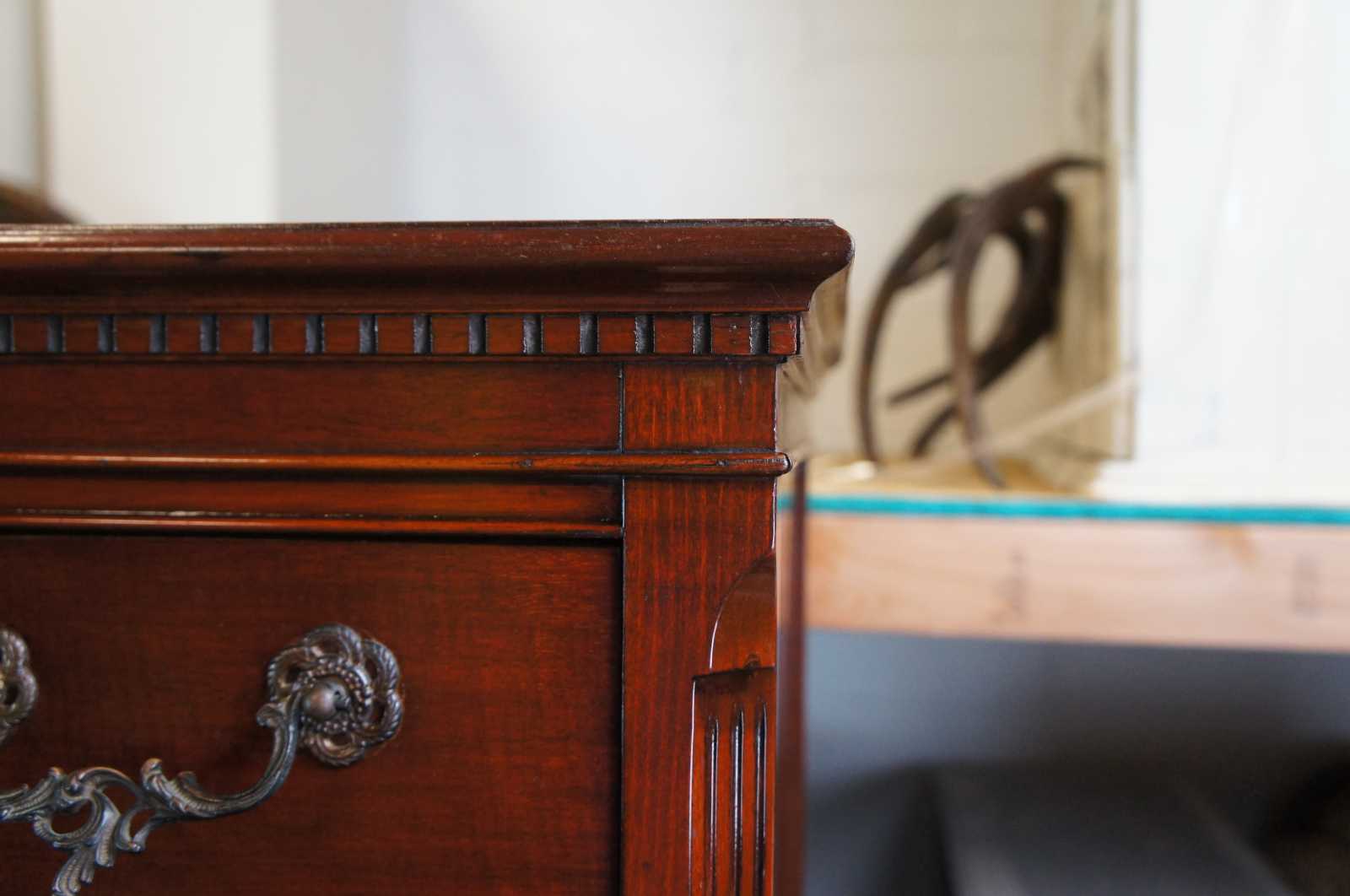 The Wentworth House Group Mid century chest of six drawers by Drexel Furniture. Made of mahogany featuring rectangular form with a chest on chest style design accented with fluted stiles terminating into rams tongues. Upper molding is highlighted by dentil carving while lower molding shows gadrooning. Includes ornate brass drawer pulls and bracket feet. No. 2131-2, Circa 1940s.