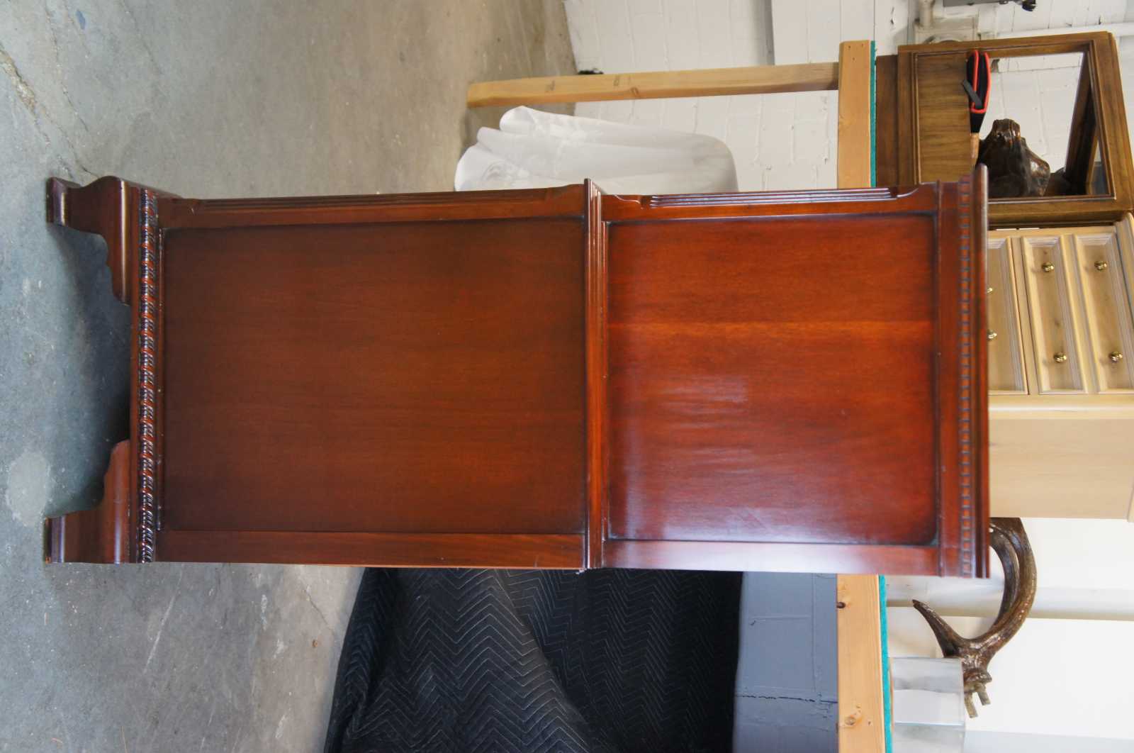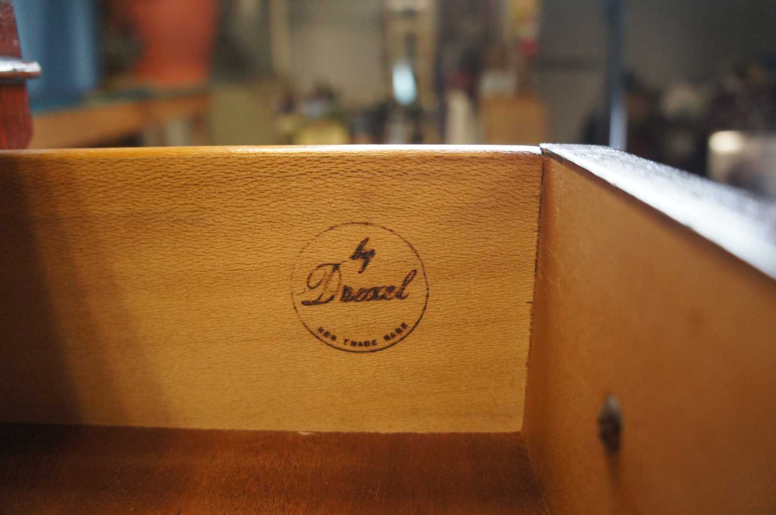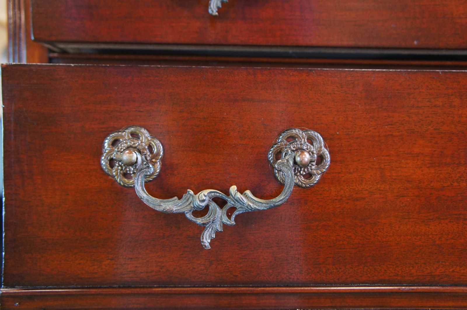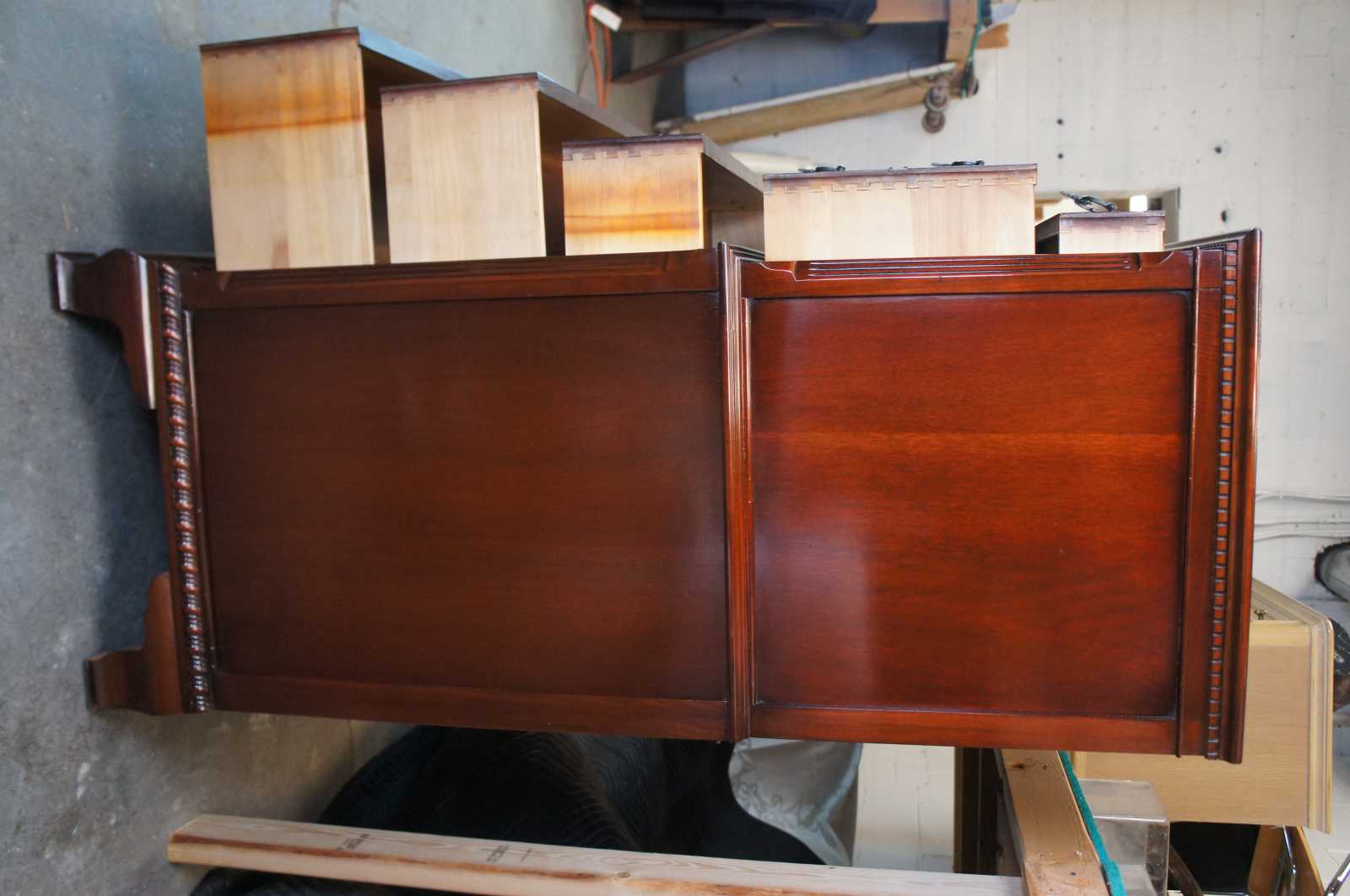 The Wentworth House Group Mid century chest of six drawers by Drexel Furniture. Made of mahogany featuring rectangular form with a chest on chest style design accented with fluted stiles terminating into rams tongues. Upper molding is highlighted by dentil carving while lower molding shows gadrooning. Includes ornate brass drawer pulls and bracket feet. No. 2131-2, Circa 1940s.