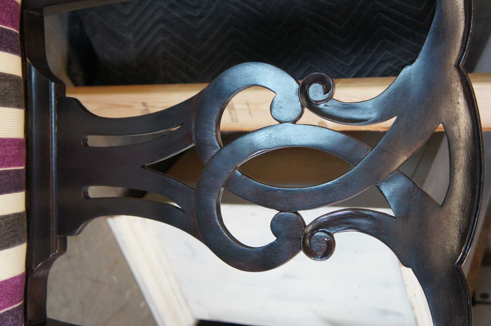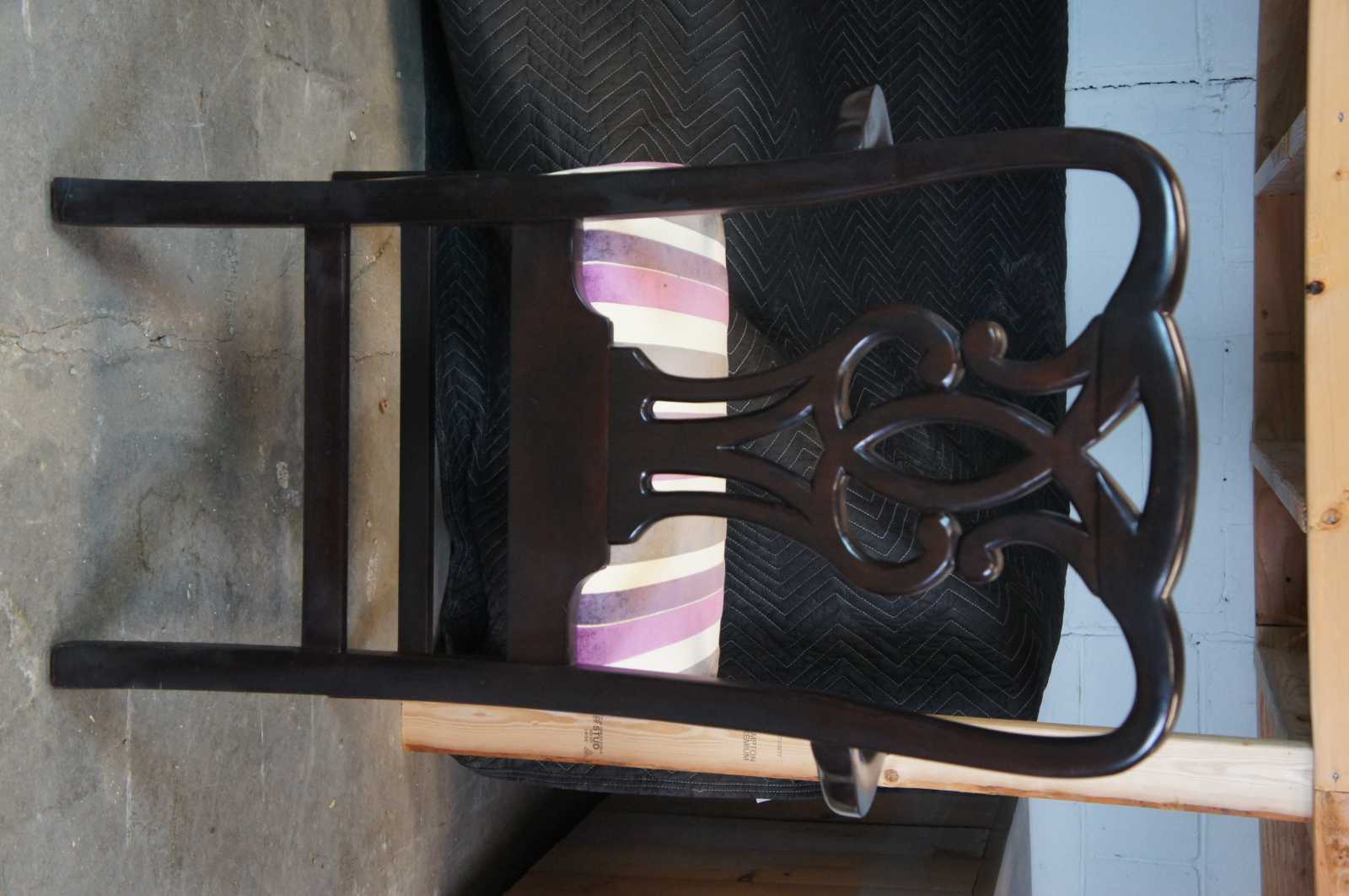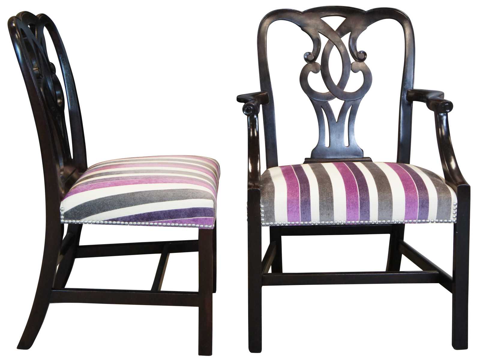 8 lovely English Georgian or chippendale style mahogany dining chairs by Baker Furniture. Features a dark brown finish, pierced pretzel back and straight legs connected by an H stretcher. Upholstered in a purple, gray and white striped design with nickel finished nailhead trim.