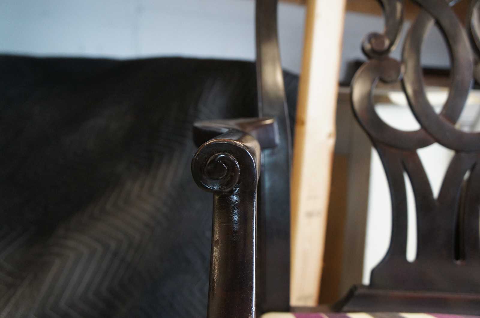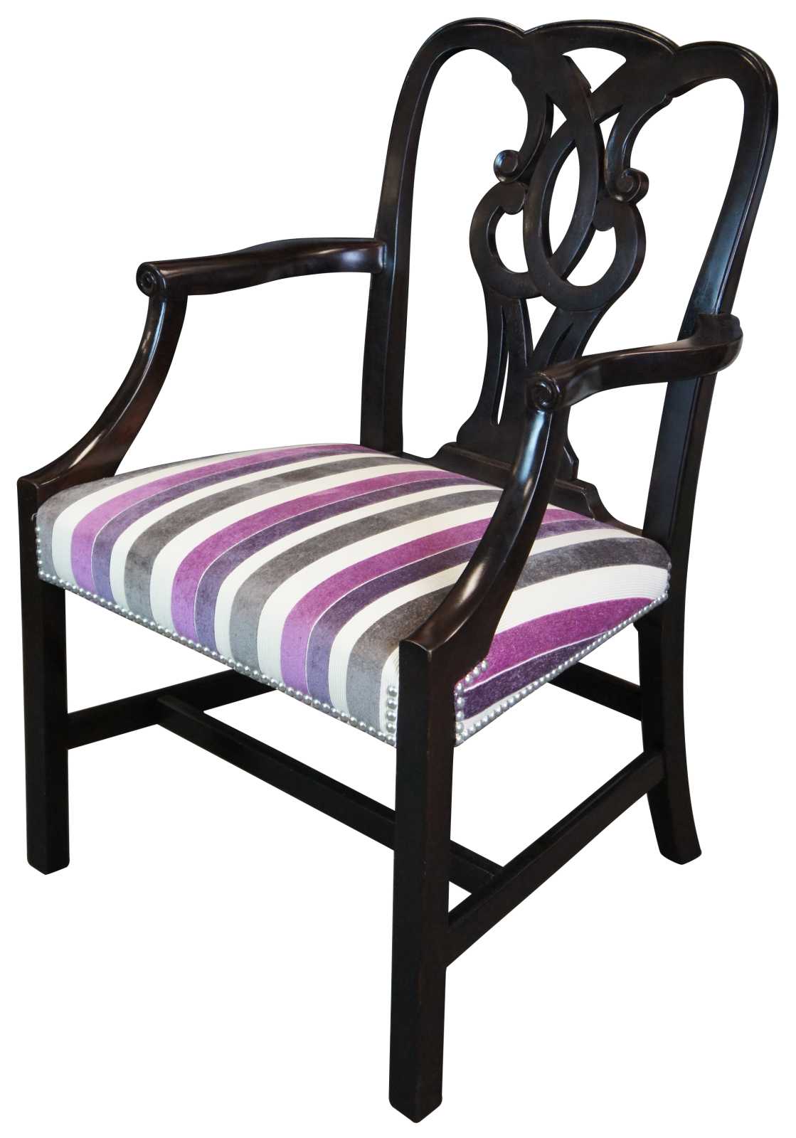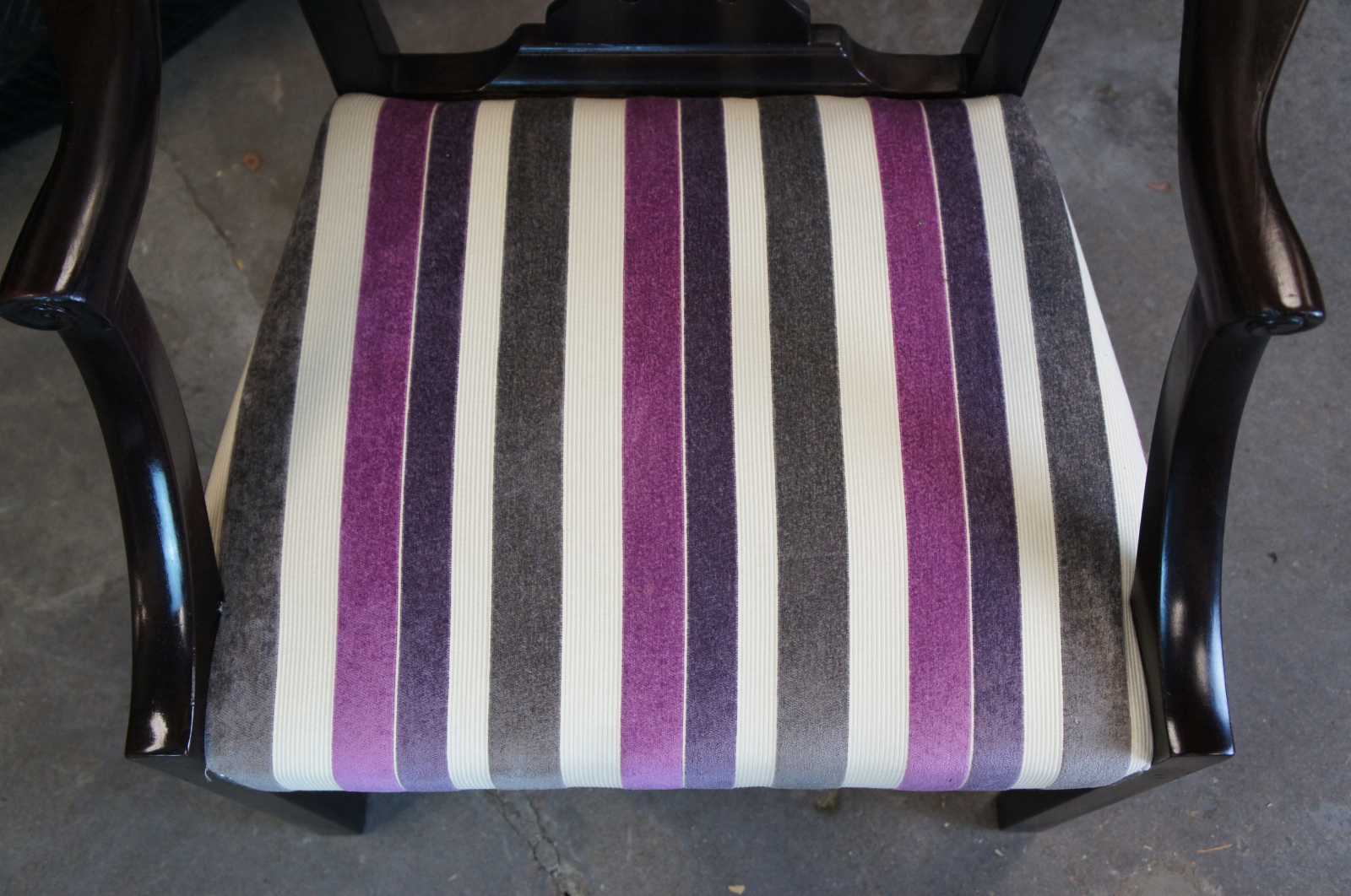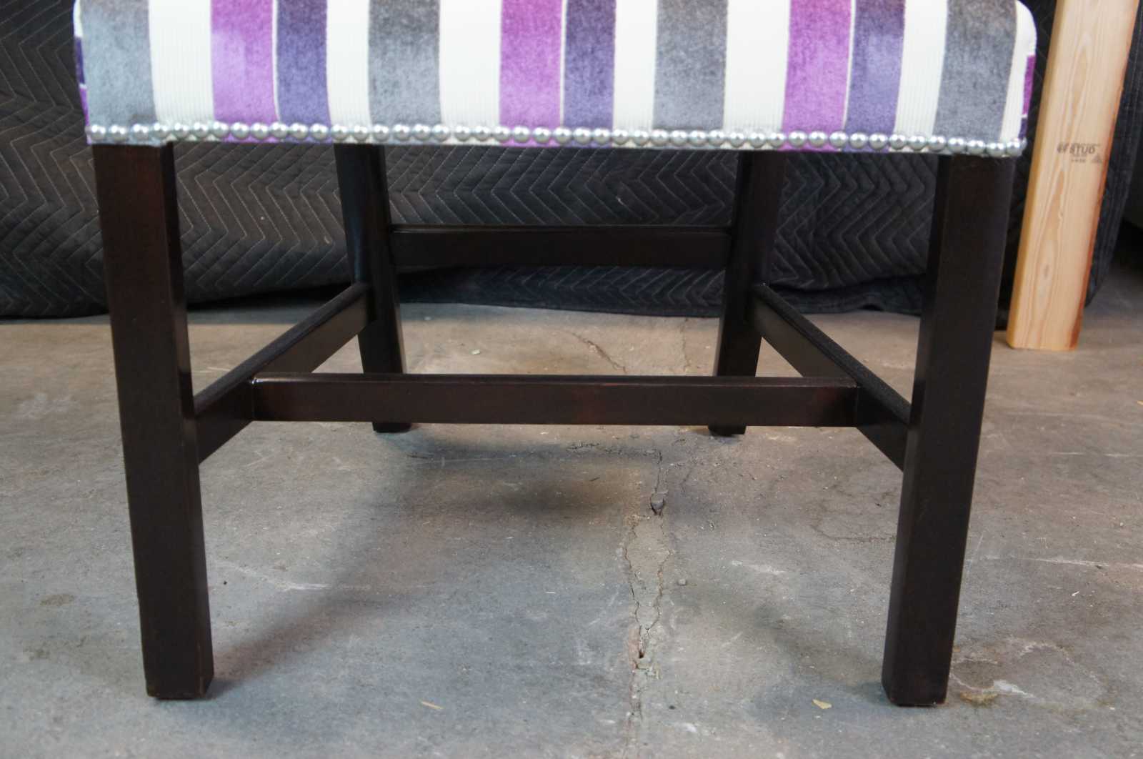 8 lovely English Georgian or chippendale style mahogany dining chairs by Baker Furniture. Features a dark brown finish, pierced pretzel back and straight legs connected by an H stretcher. Upholstered in a purple, gray and white striped design with nickel finished nailhead trim.