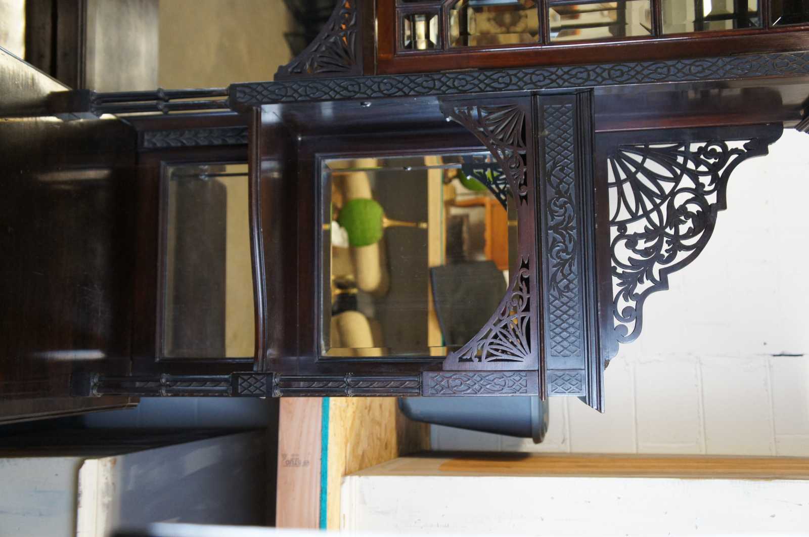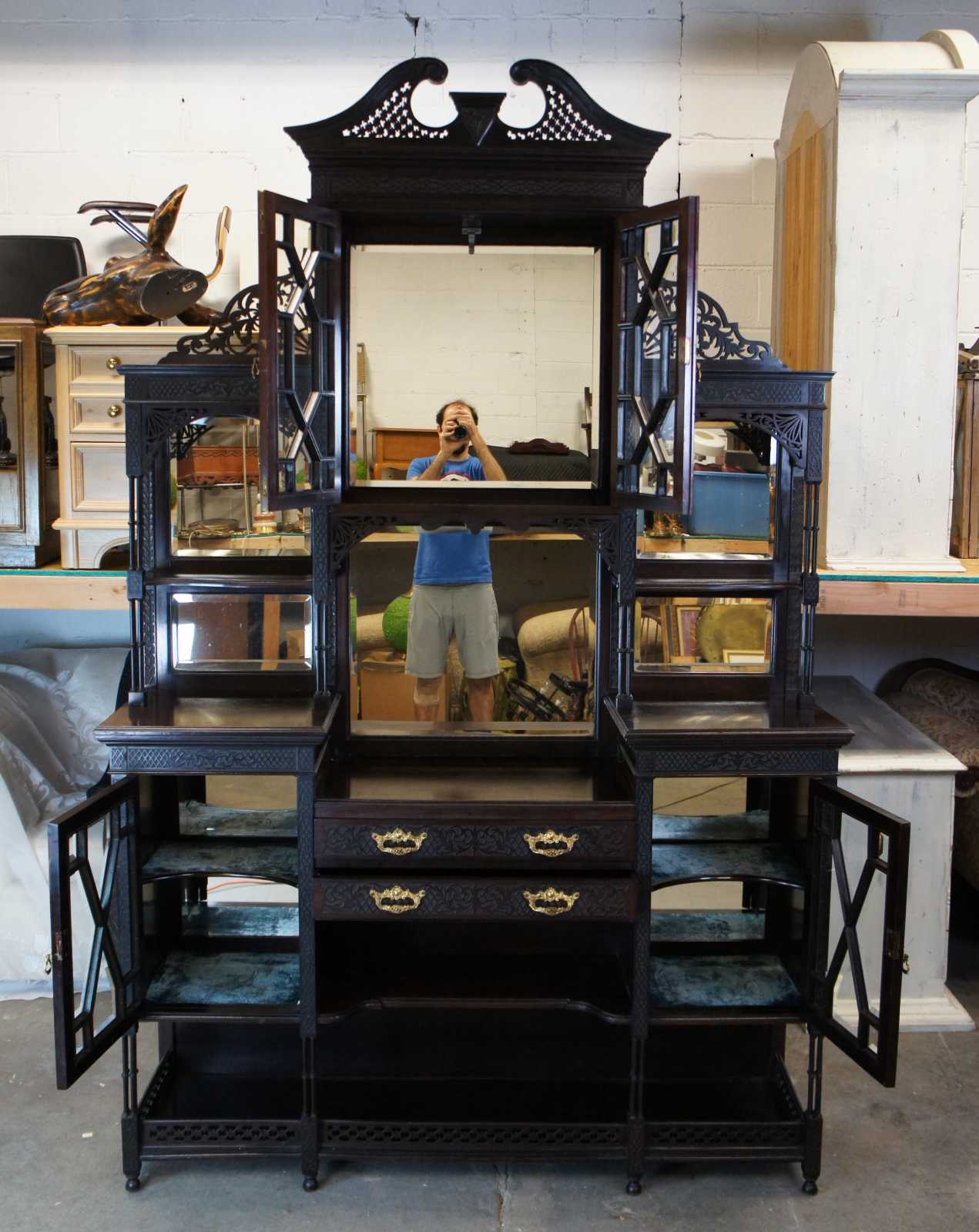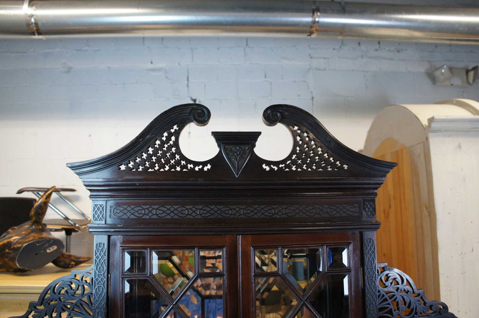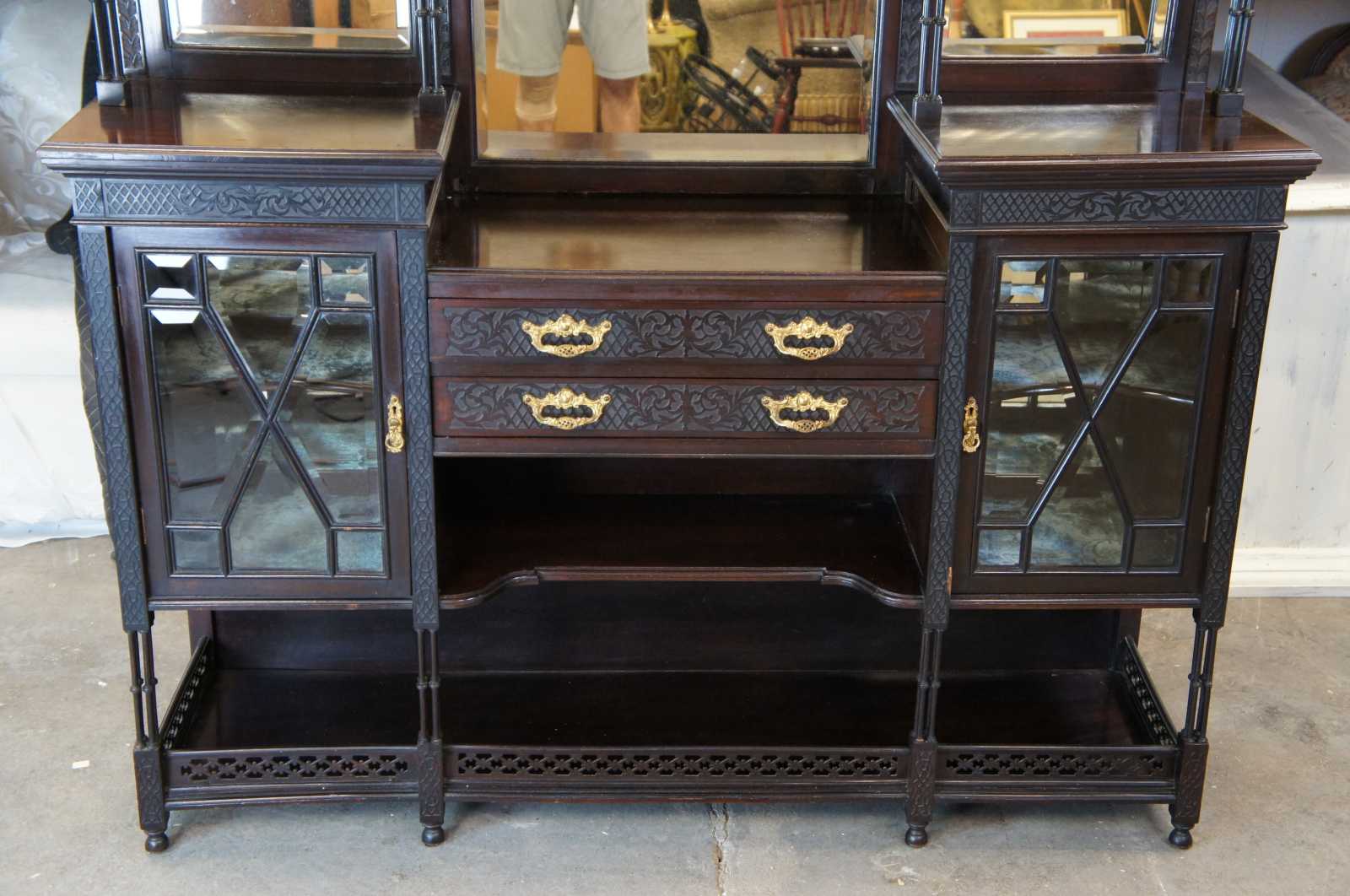 Antique 2 piece Edwardian mirrored china, curio cabinet, or barback, circa 1900s. Top section comprised of 6 beveled mirrors and large cabinet, surmounted by carved latice canopy, pierced floral spandrels and meticulous fretwork. Tiers are linked together by quad turned columns. Includes two lower hand dovetailed serving drawers flanked by velvet lined cabinets with shelf. Each display cabinet features beveled glass and applied fretwork in classic Chippendale form. Lower shelf is characterized by a pierced gallery. Brass hardware is in Baroque revival manner with a beautiful gold luster. Case is supported by petite bun feet.