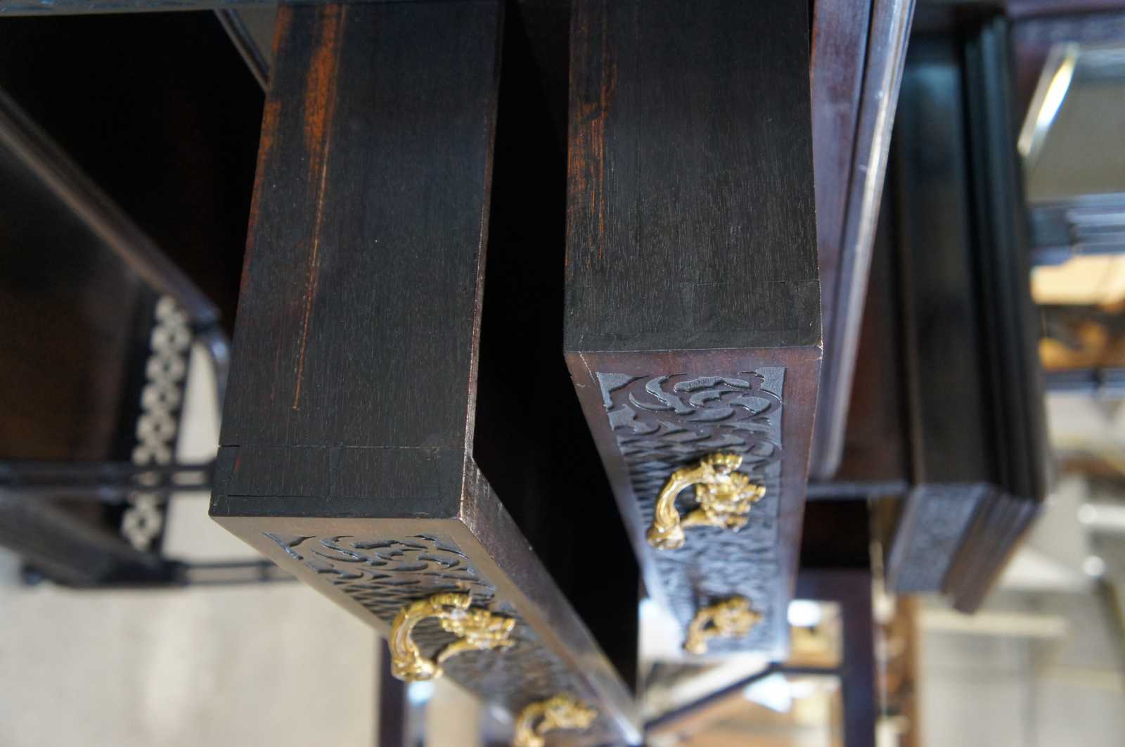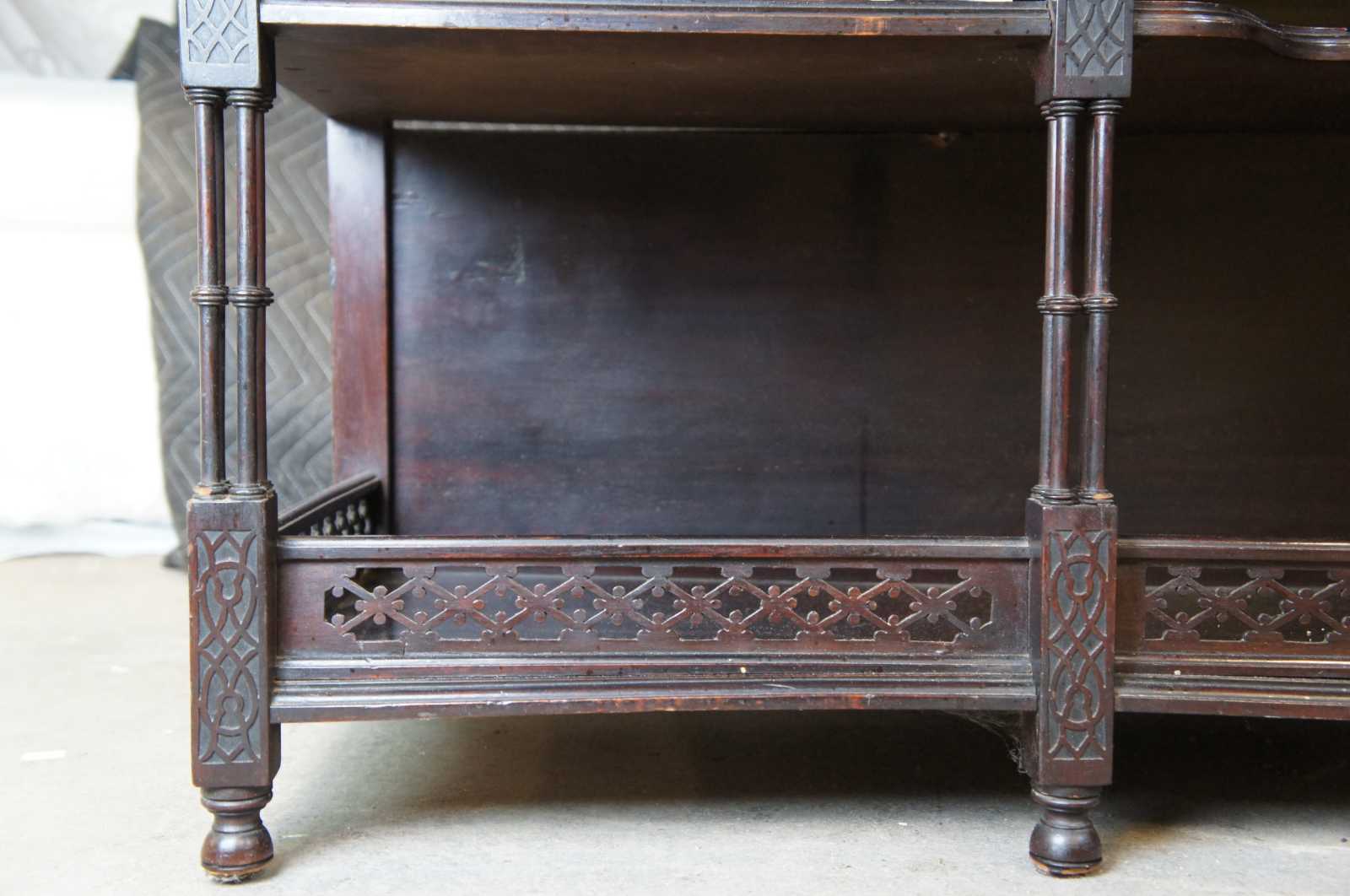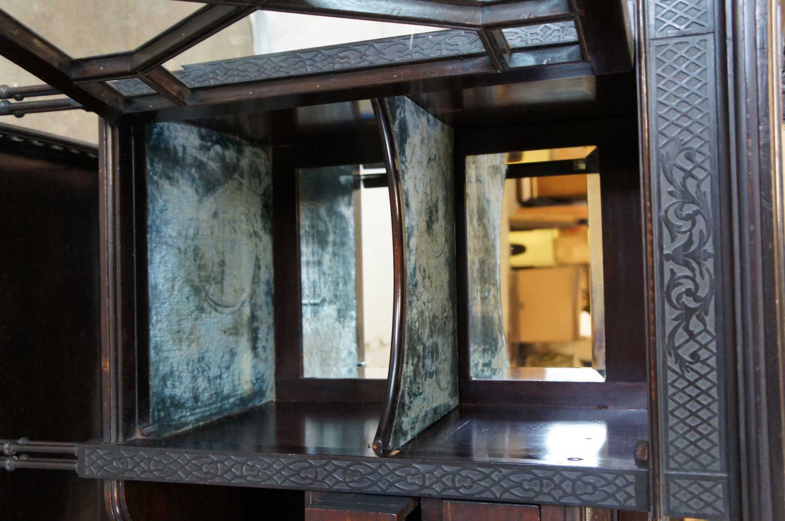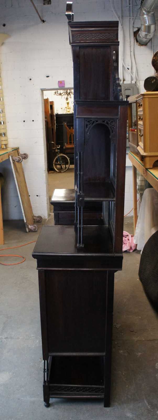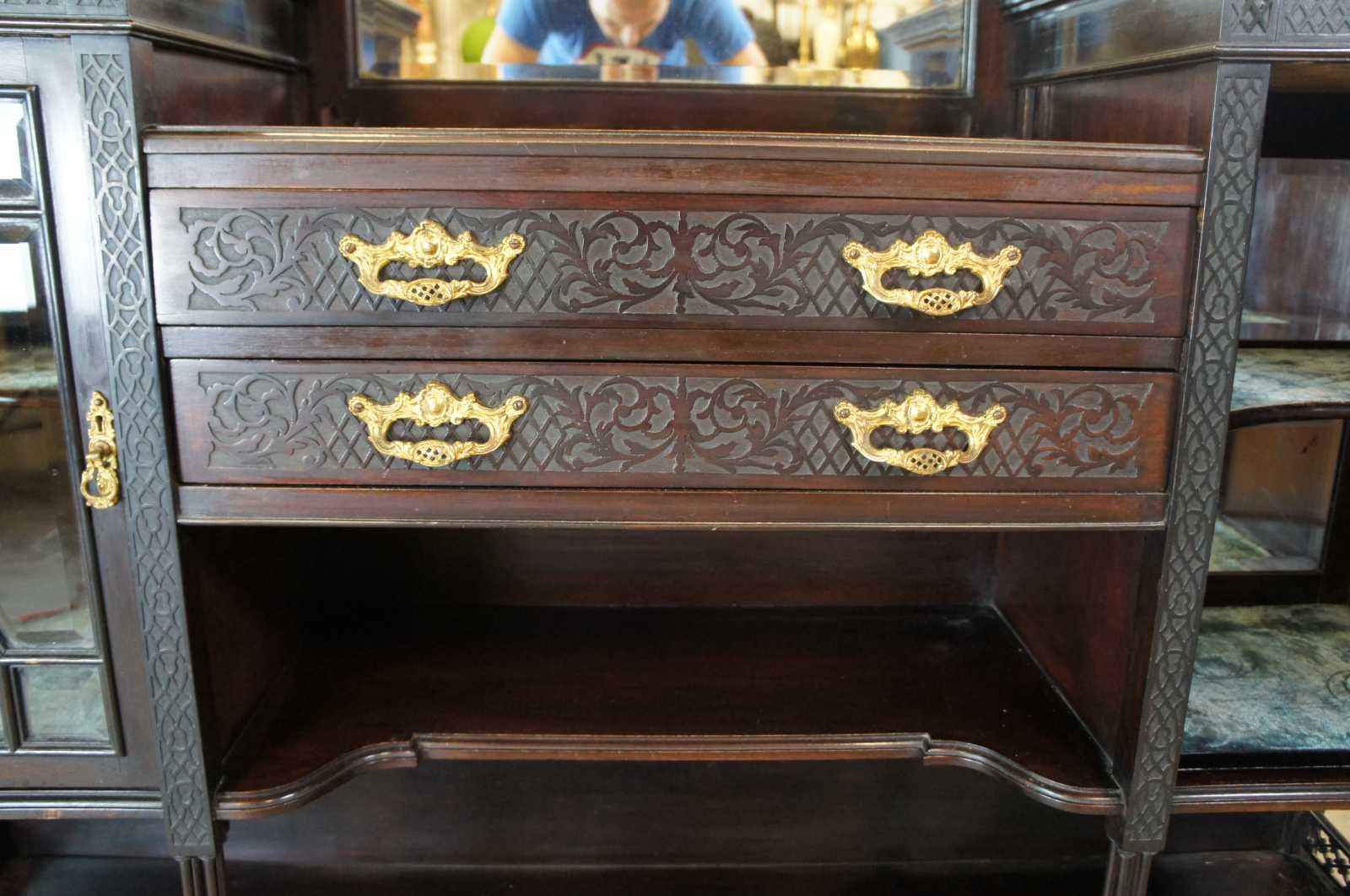 Antique 2 piece Edwardian mirrored china, curio cabinet, or barback, circa 1900s. Top section comprised of 6 beveled mirrors and large cabinet, surmounted by carved latice canopy, pierced floral spandrels and meticulous fretwork. Tiers are linked together by quad turned columns. Includes two lower hand dovetailed serving drawers flanked by velvet lined cabinets with shelf. Each display cabinet features beveled glass and applied fretwork in classic Chippendale form. Lower shelf is characterized by a pierced gallery. Brass hardware is in Baroque revival manner with a beautiful gold luster. Case is supported by petite bun feet.