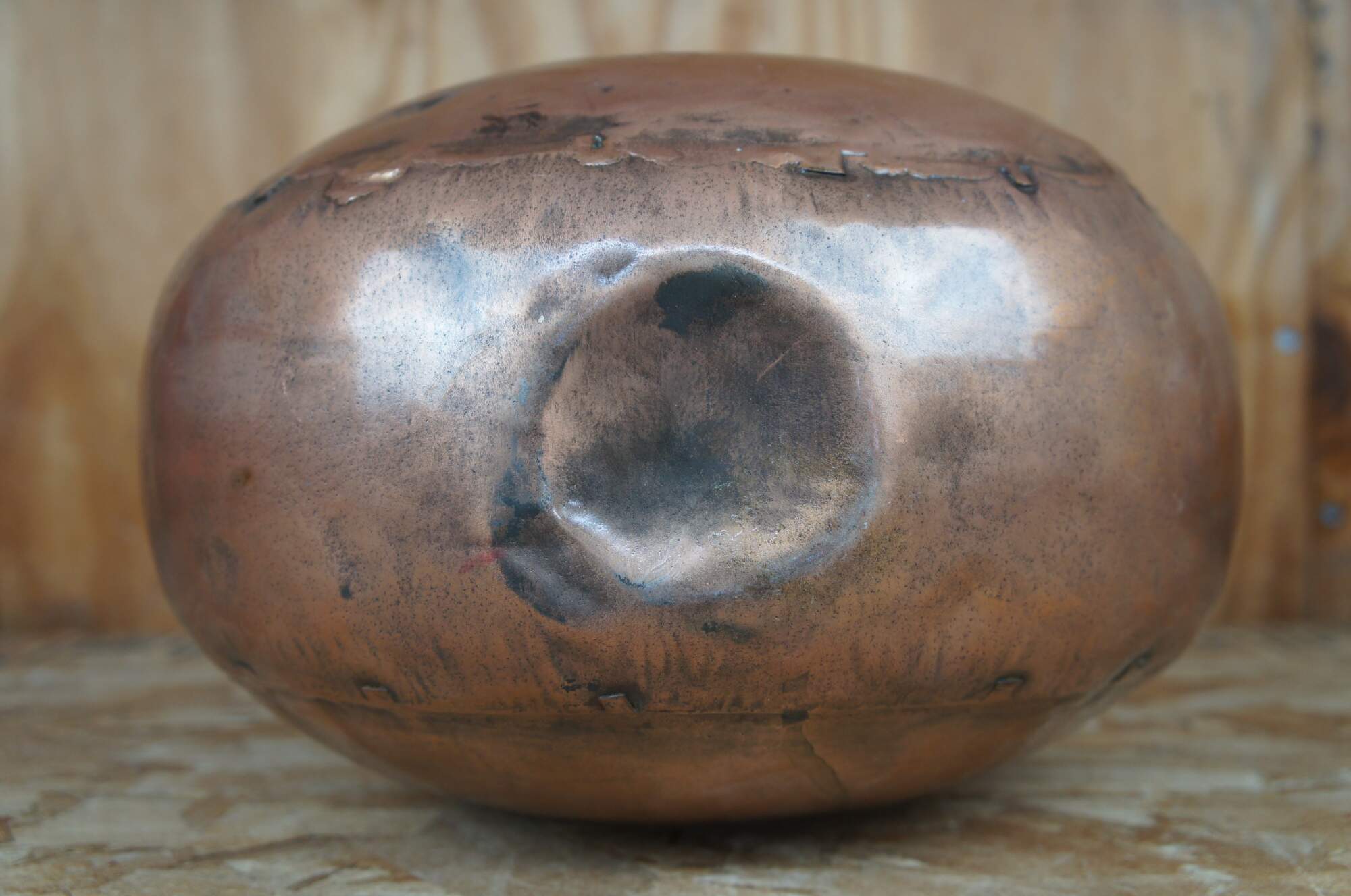 Two large vintage copper canister jugs, bottles or vases featuring cork stopper and dovetailed accents. From India.