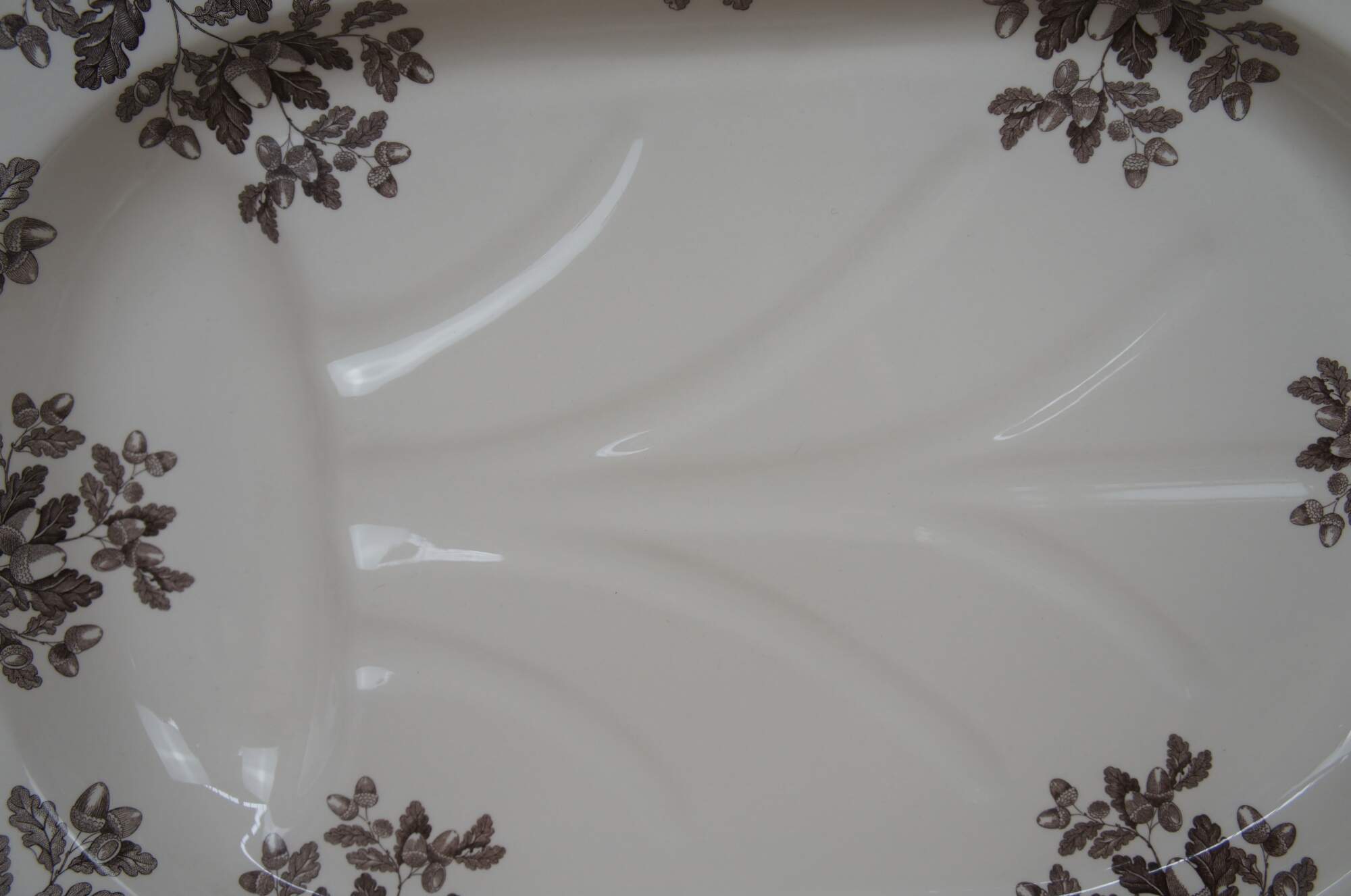 Vintage large Thanksgiving Turkey or meat serving platter by Williams Sonoma in the Manor brown acorn pattern featuring a juice well or basin for draining. Marked Williams-Sonoma Home, Spode, Made in England, Dishwasher and Microwave safe.