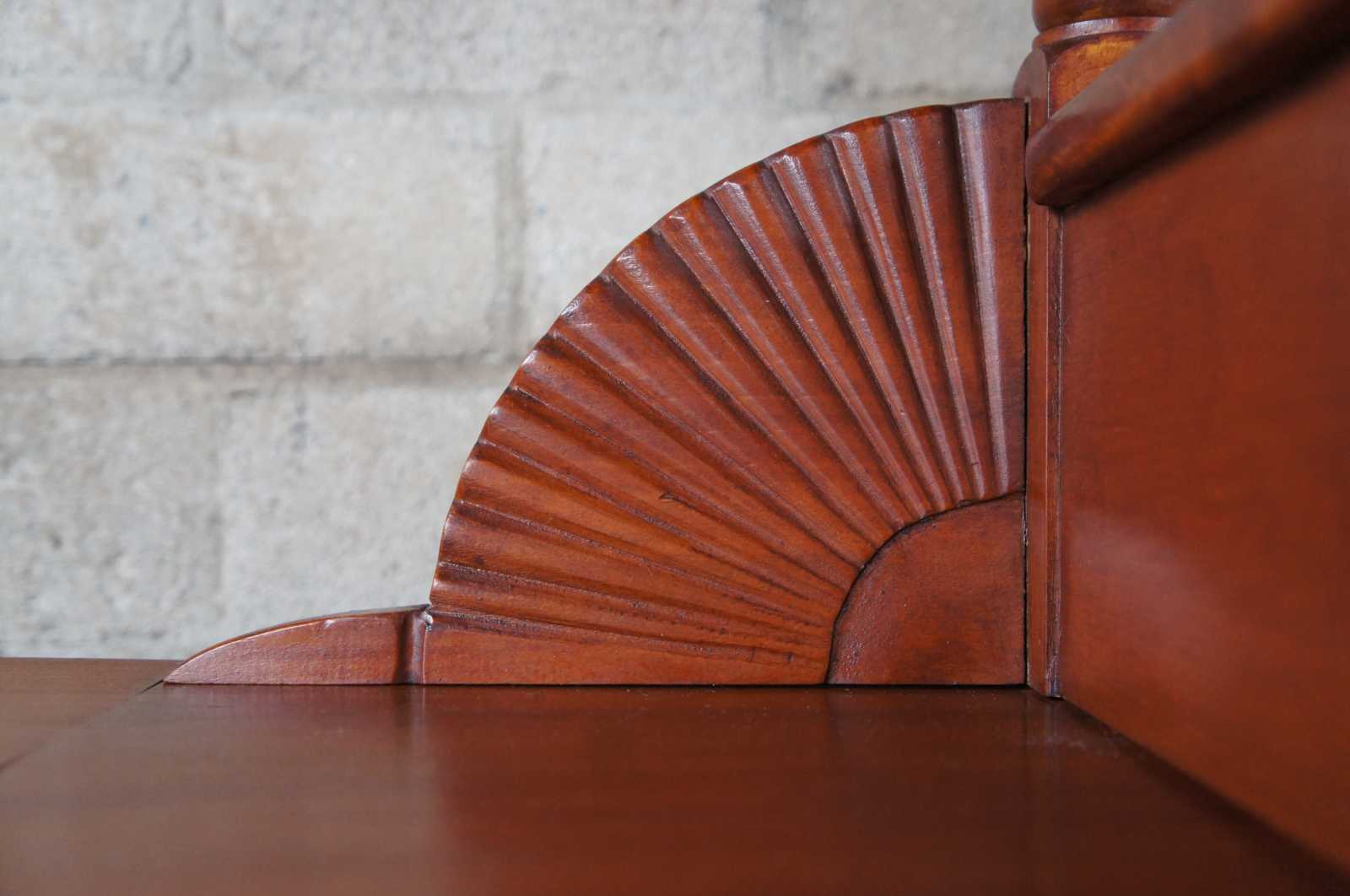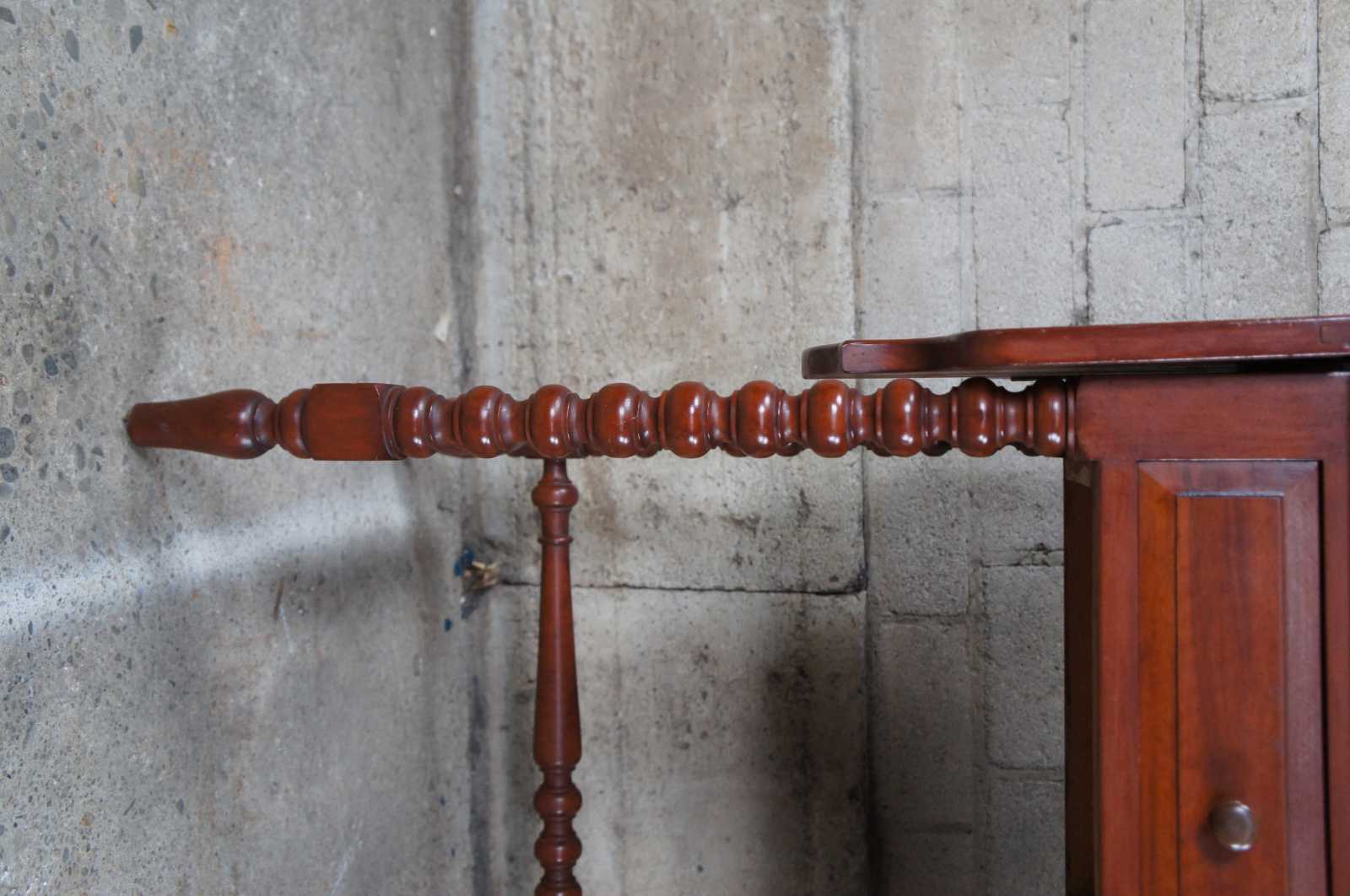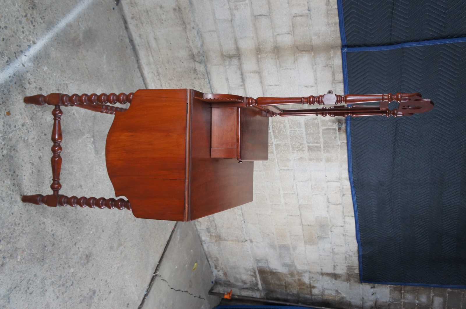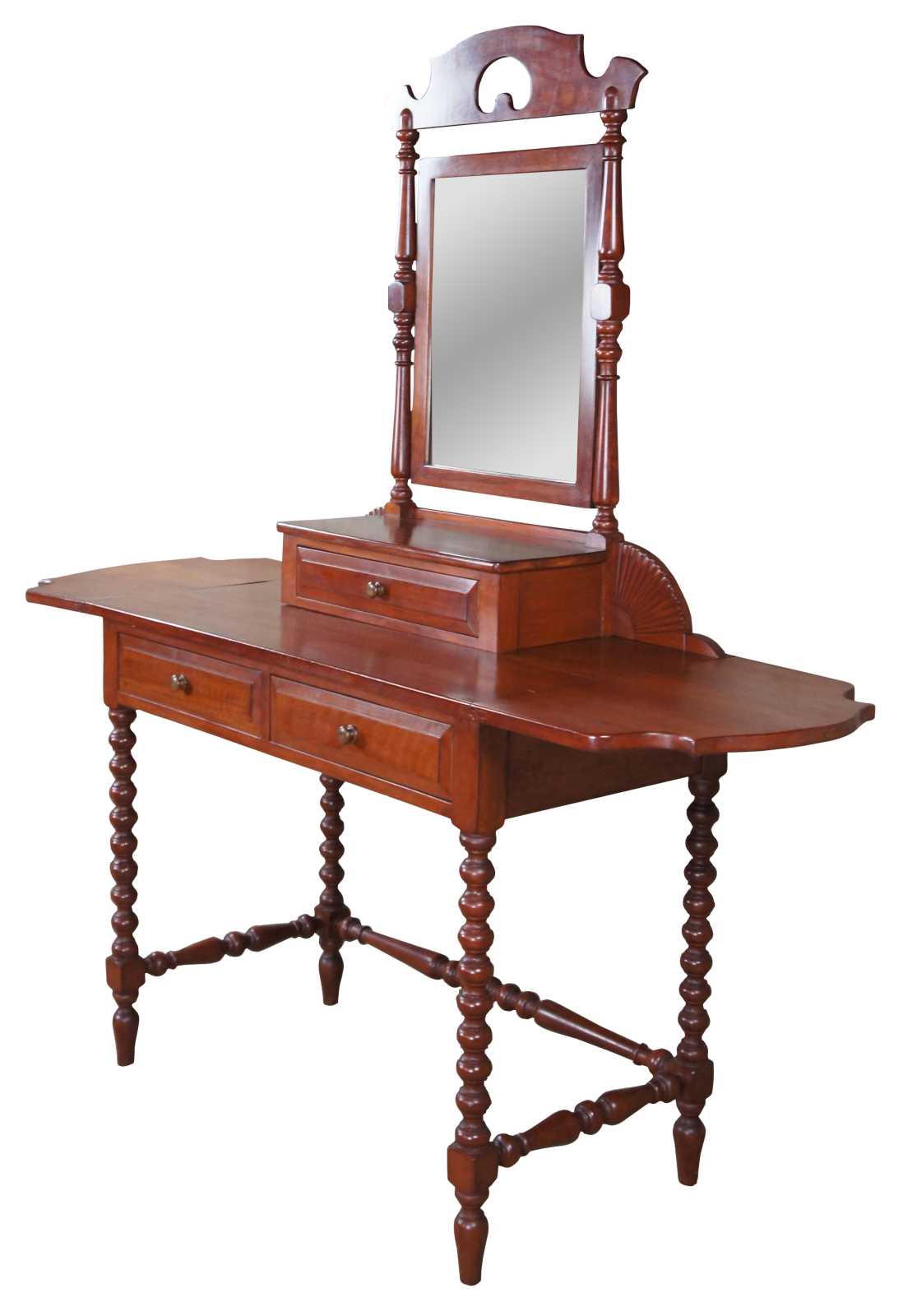 Antique early American dressing table vanity and bench. Made of cherry featuring unique form with serpentine drop leaves, adjustable mirror, multiple drawers and carved, ribbed and turned accents