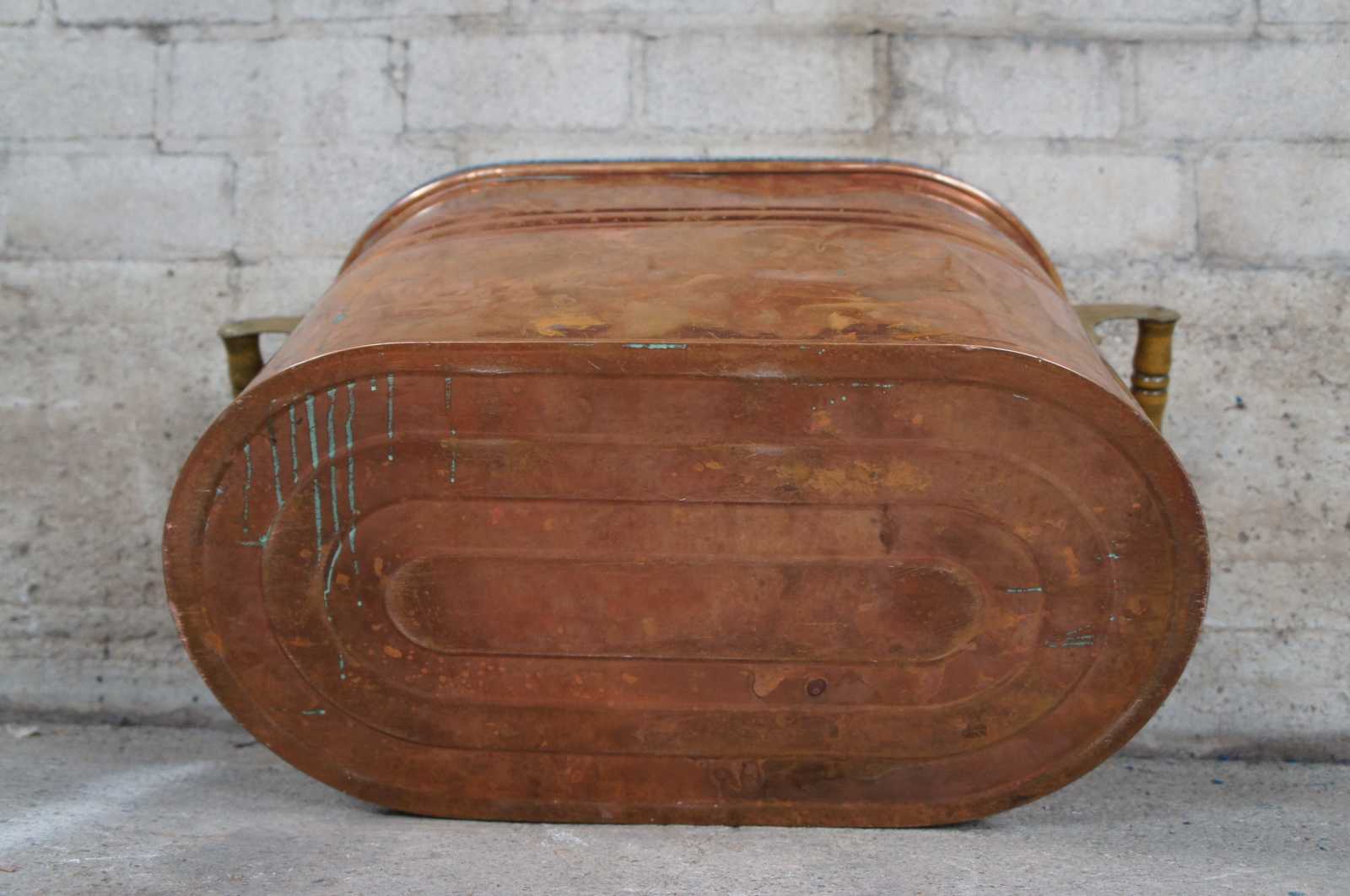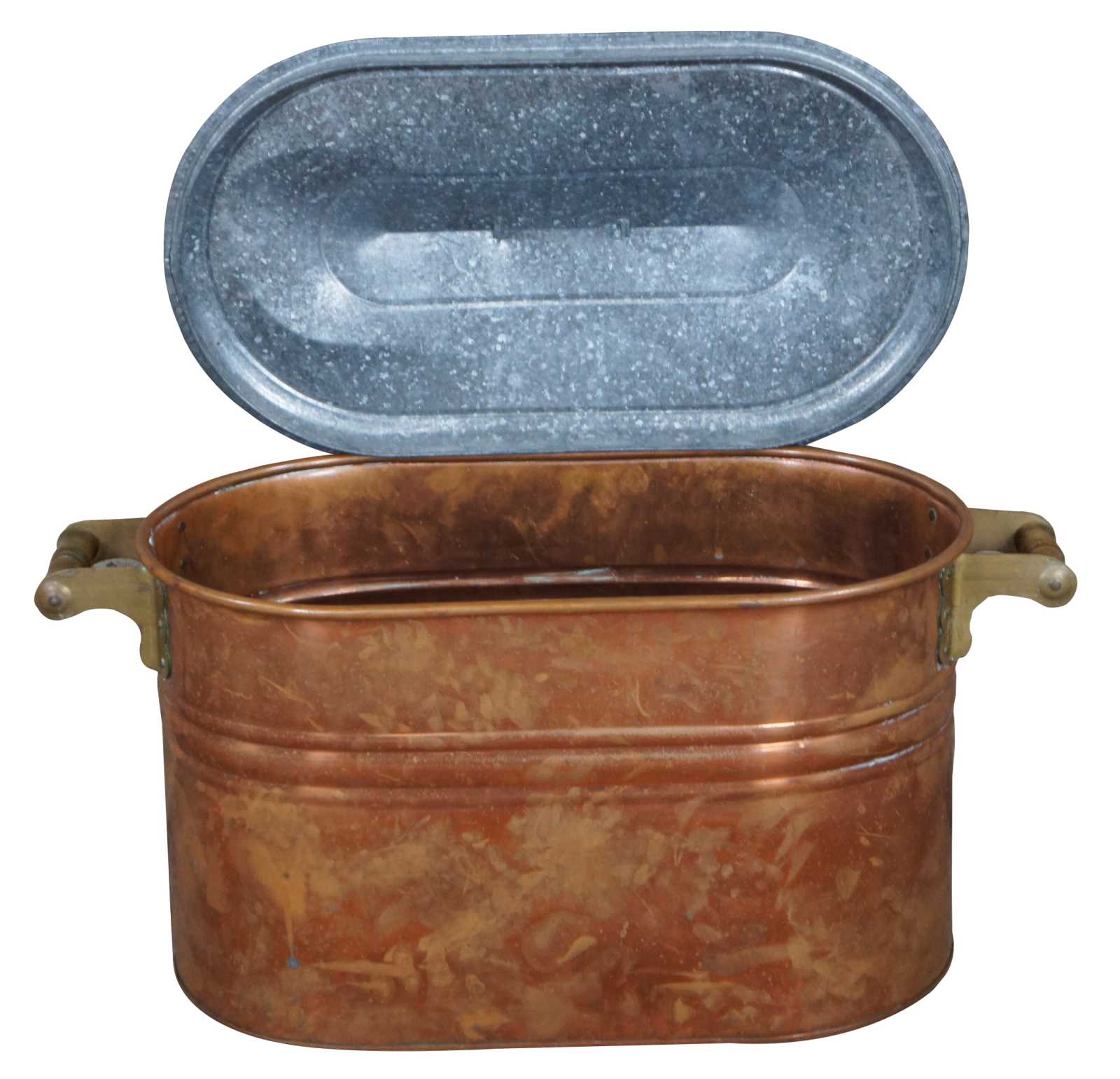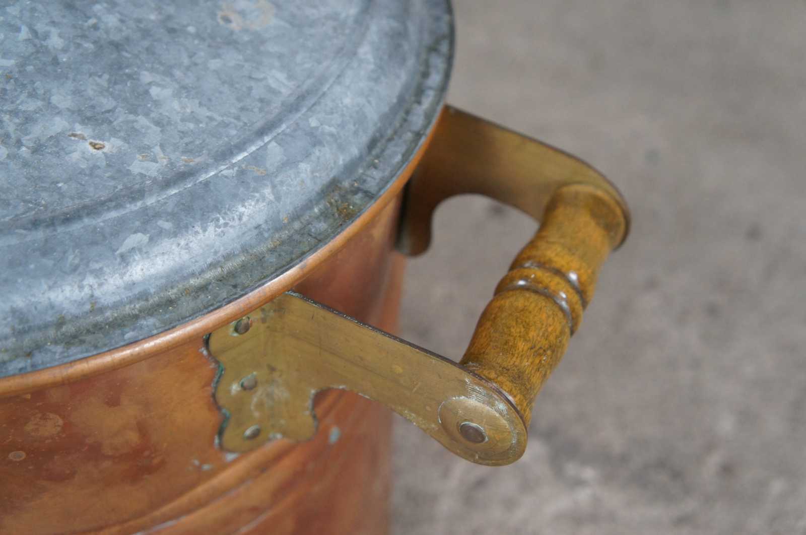 Antique copper boiler, firewood bin or wash tub with lid and wood handles.